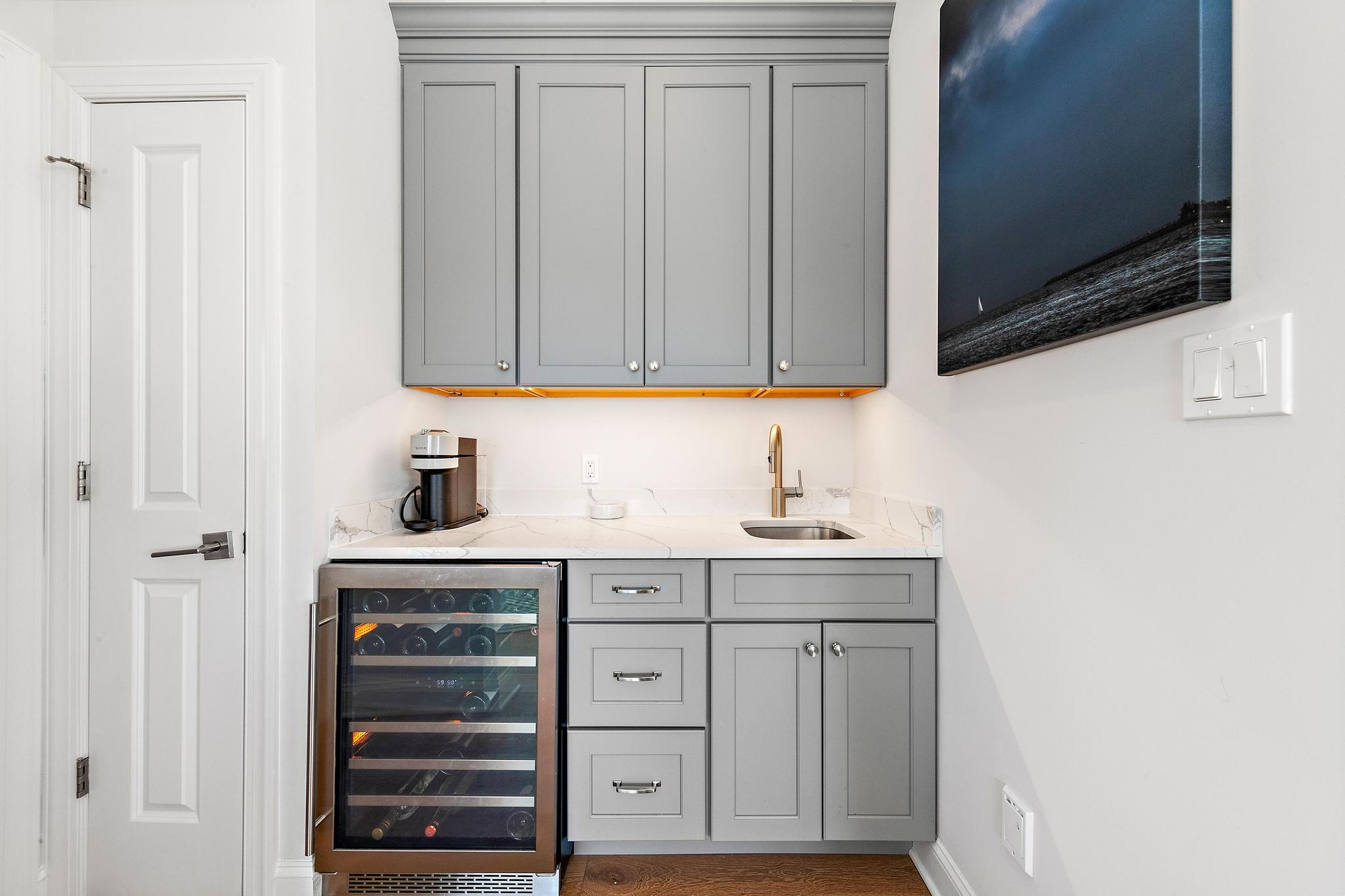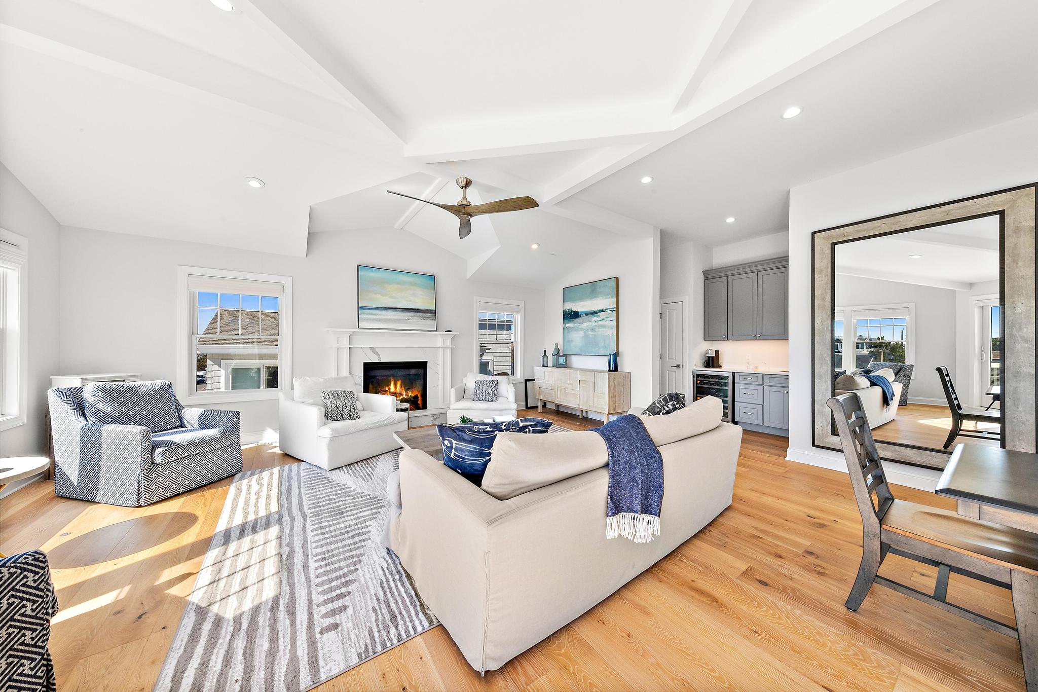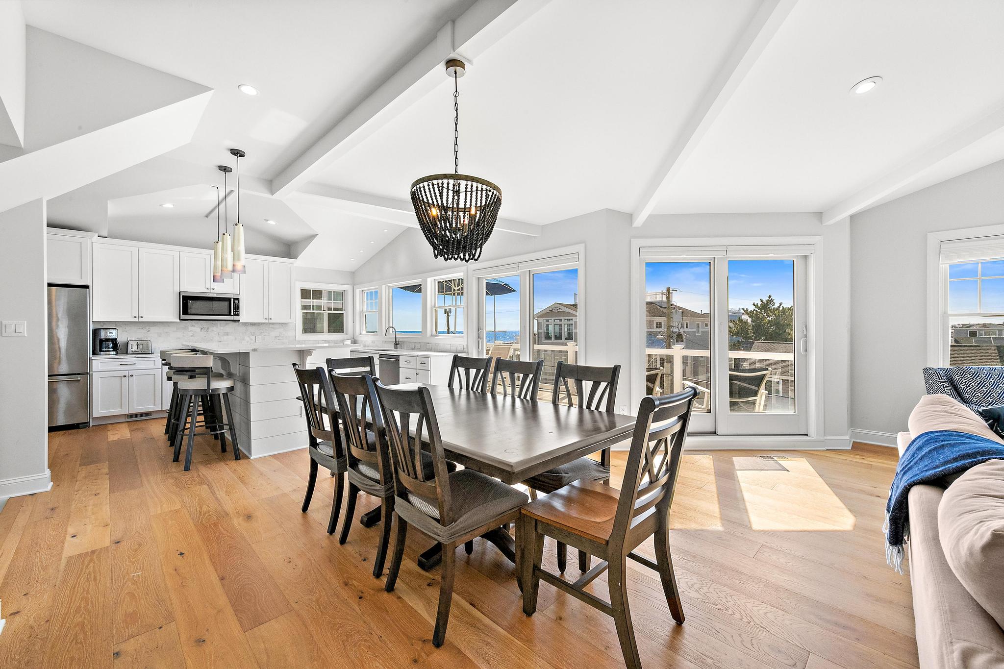 As you step inside, you'll be greeted by an inviting open-concept living, dining, and kitchen area with soaring ceilings, creating an airy and spacious atmosphere, all backdropped with Atlantic views. The living area features a convenient wet bar complete with a sink and wine refrigerator, perfect for entertaining guests. The dining area comfortably seats eight guests, complemented by a kitchen island with additional seating for three. Custom cabinetry and top-of-the-line appliances adorn the kitchen, making meal preparation a delight. A back office tucked behind the kitchen provides a quiet retreat for work or study.