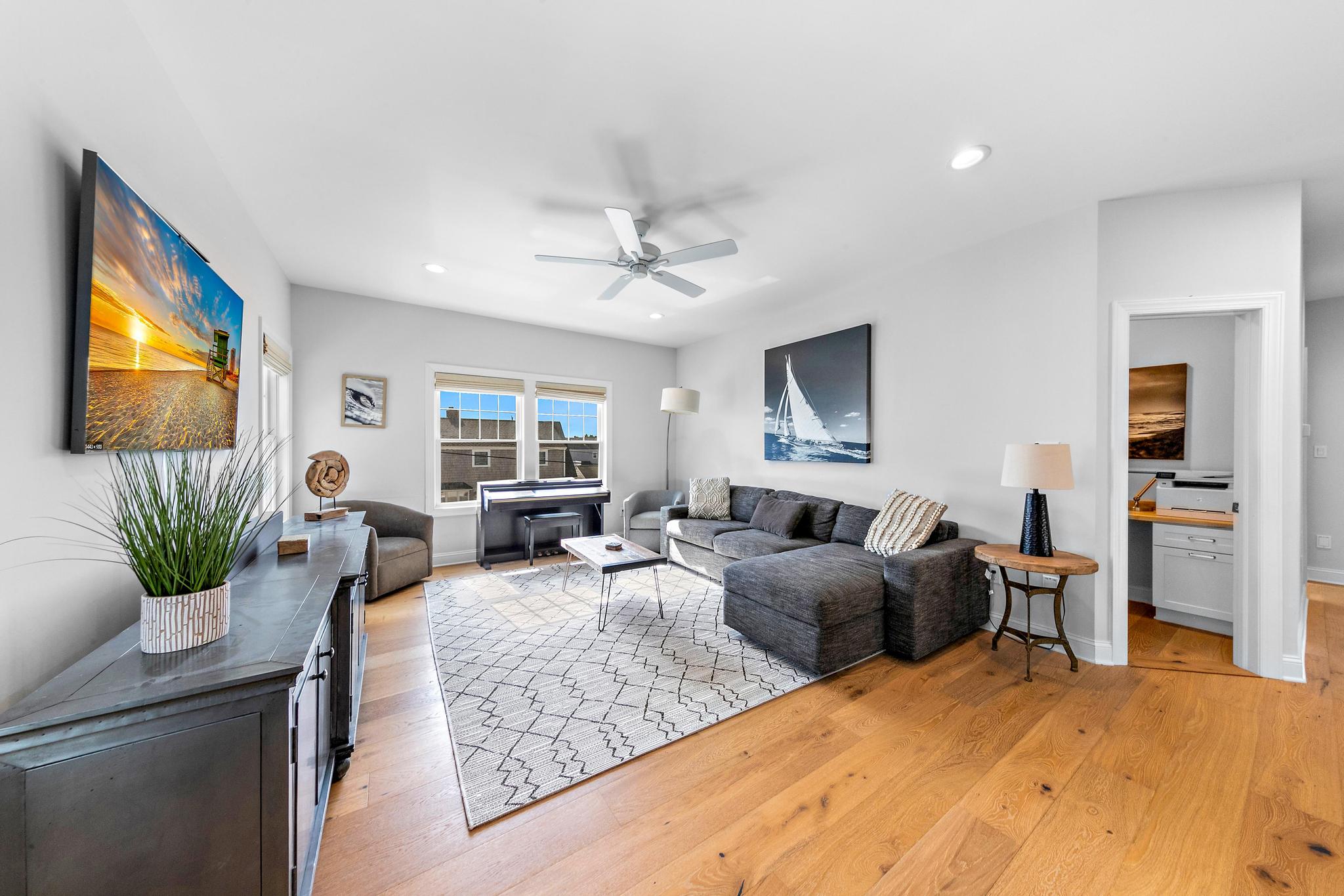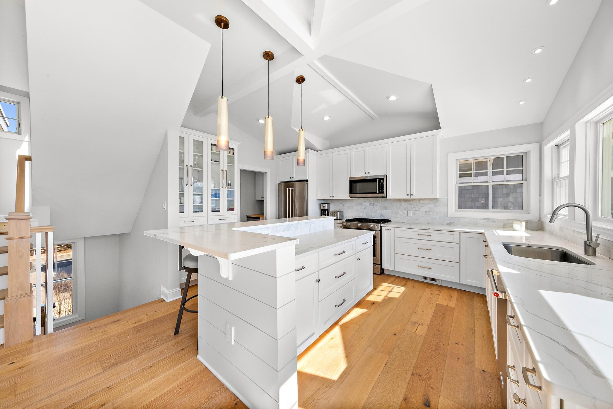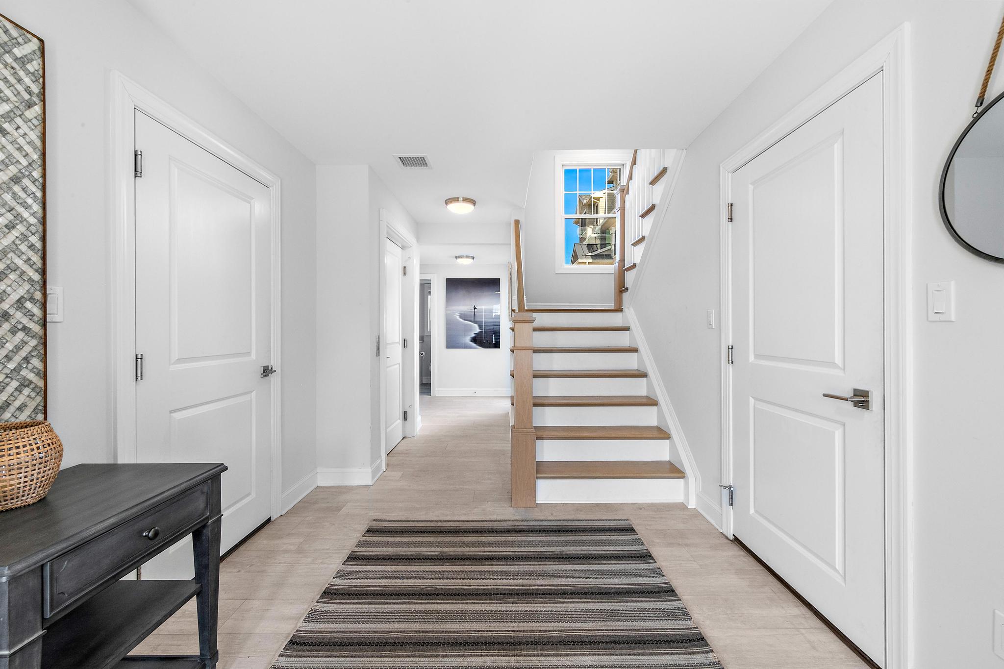 As you step inside, you'll be greeted by an inviting open-concept living, dining, and kitchen area with soaring ceilings, creating an airy and spacious atmosphere, all backdropped with Atlantic views. The living area features a convenient wet bar complete with a sink and wine refrigerator, perfect for entertaining guests. The dining area comfortably seats eight guests, complemented by a kitchen island with additional seating for three. Custom cabinetry and top-of-the-line appliances adorn the kitchen, making meal preparation a delight. A back office tucked behind the kitchen provides a quiet retreat for work or study.