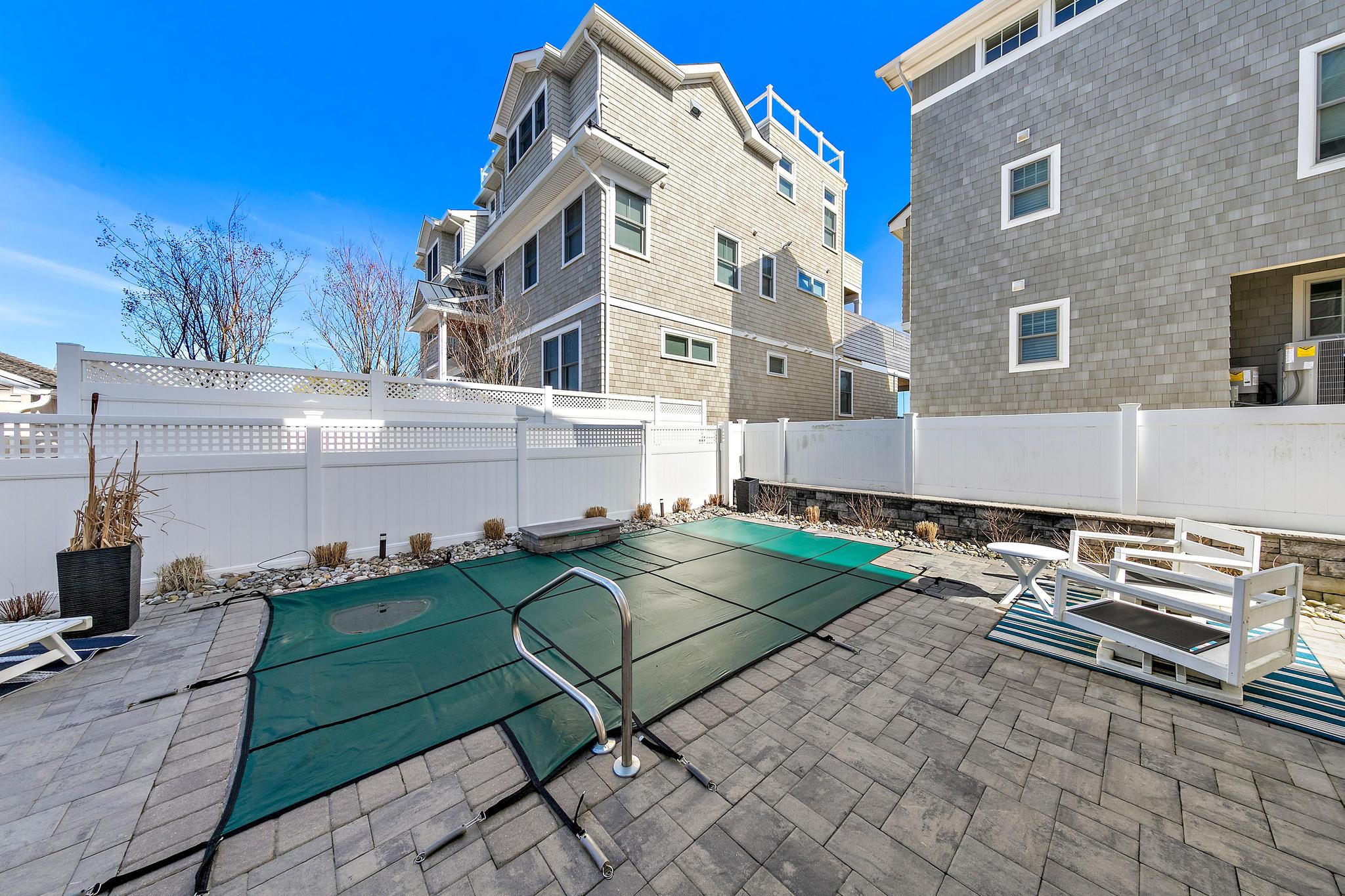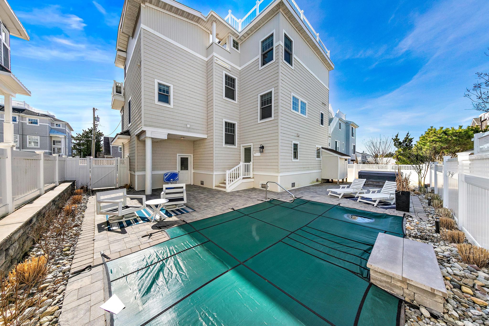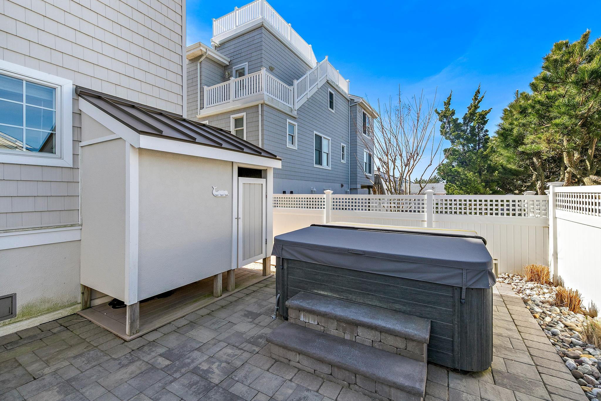 The backyard oasis beckons with a saltwater pool, inviting lounging and sitting areas, a rejuvenating hot tub, and an outdoor shower for rinsing off after a day of beachside adventures.