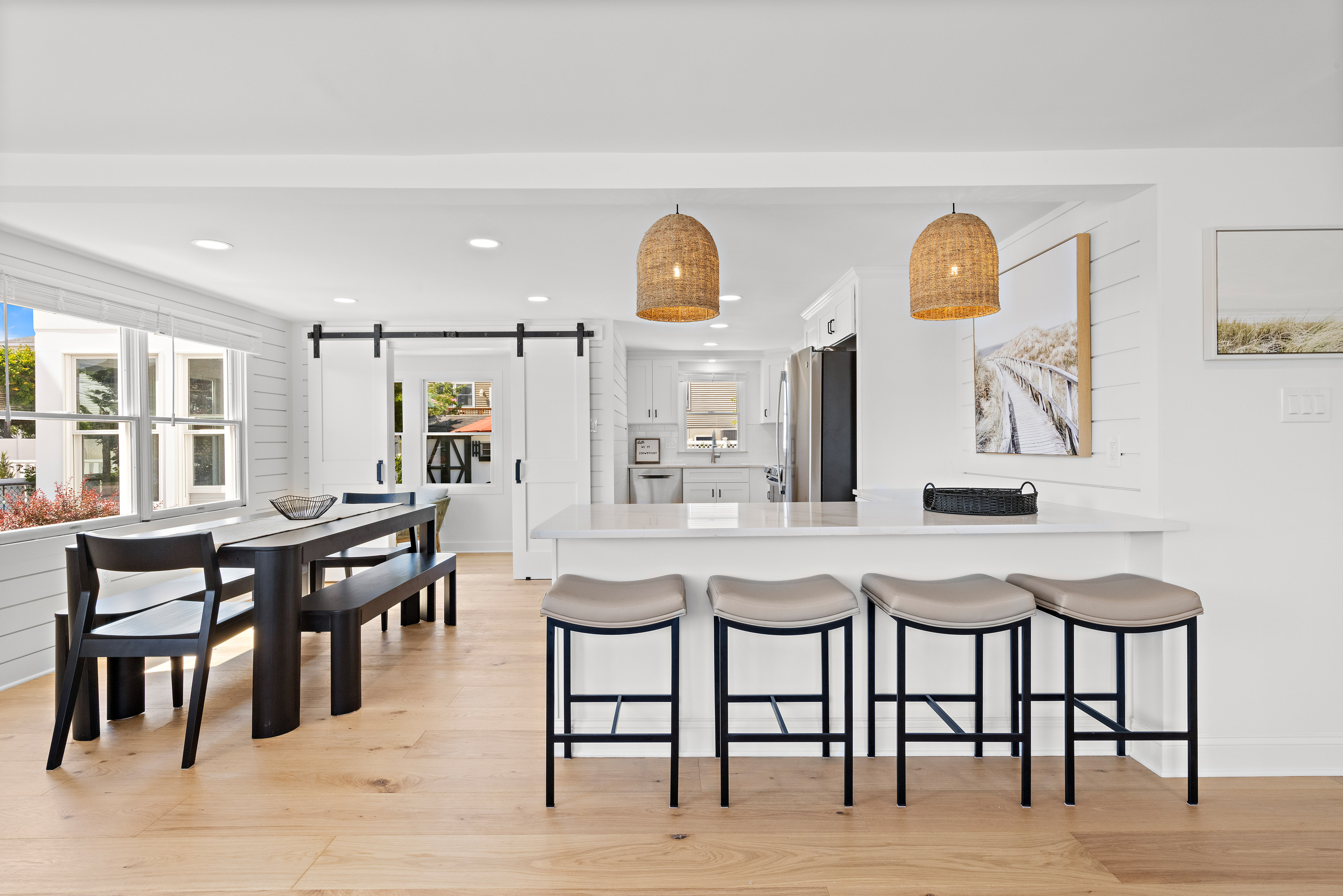 Welcome to your perfect beach vacation getaway! This charming and updated Cape Cod-style home in Ship Bottom offers everything you need for a relaxing and enjoyable stay. With six bedrooms and three modern bathrooms, this spacious paradise comfortably accommodates families and groups. Unwind on the inviting front porch, ideal for morning coffee or evening relaxation. The bright and airy living room provides a comfortable space to gather, featuring plenty of natural light. The cozy kitchen comes equipped with modern appliances, making meal preparation a breeze. The dining table seats six to eight, perfect for family meals or entertaining, with additional counter seating available at the bar.
