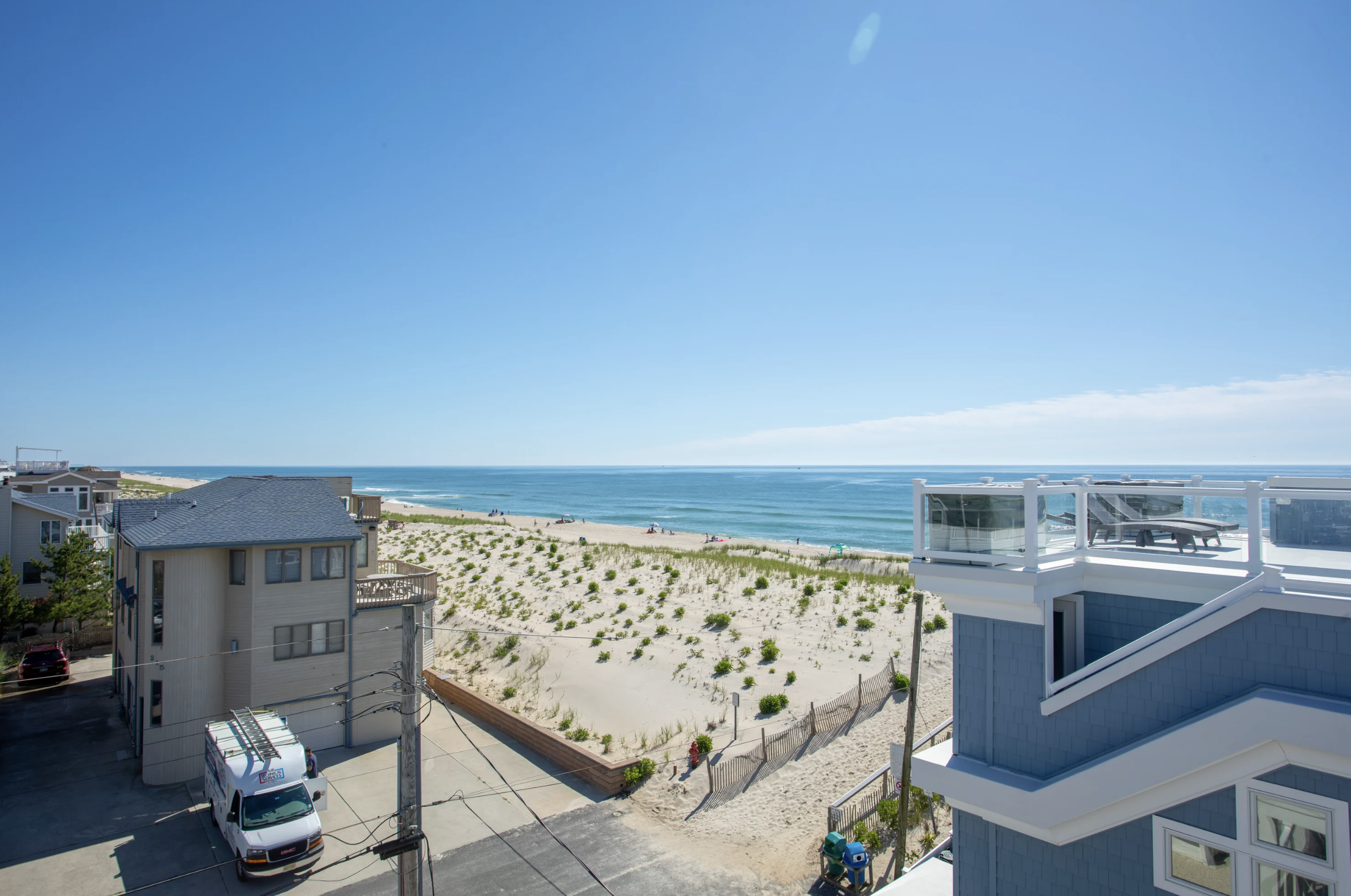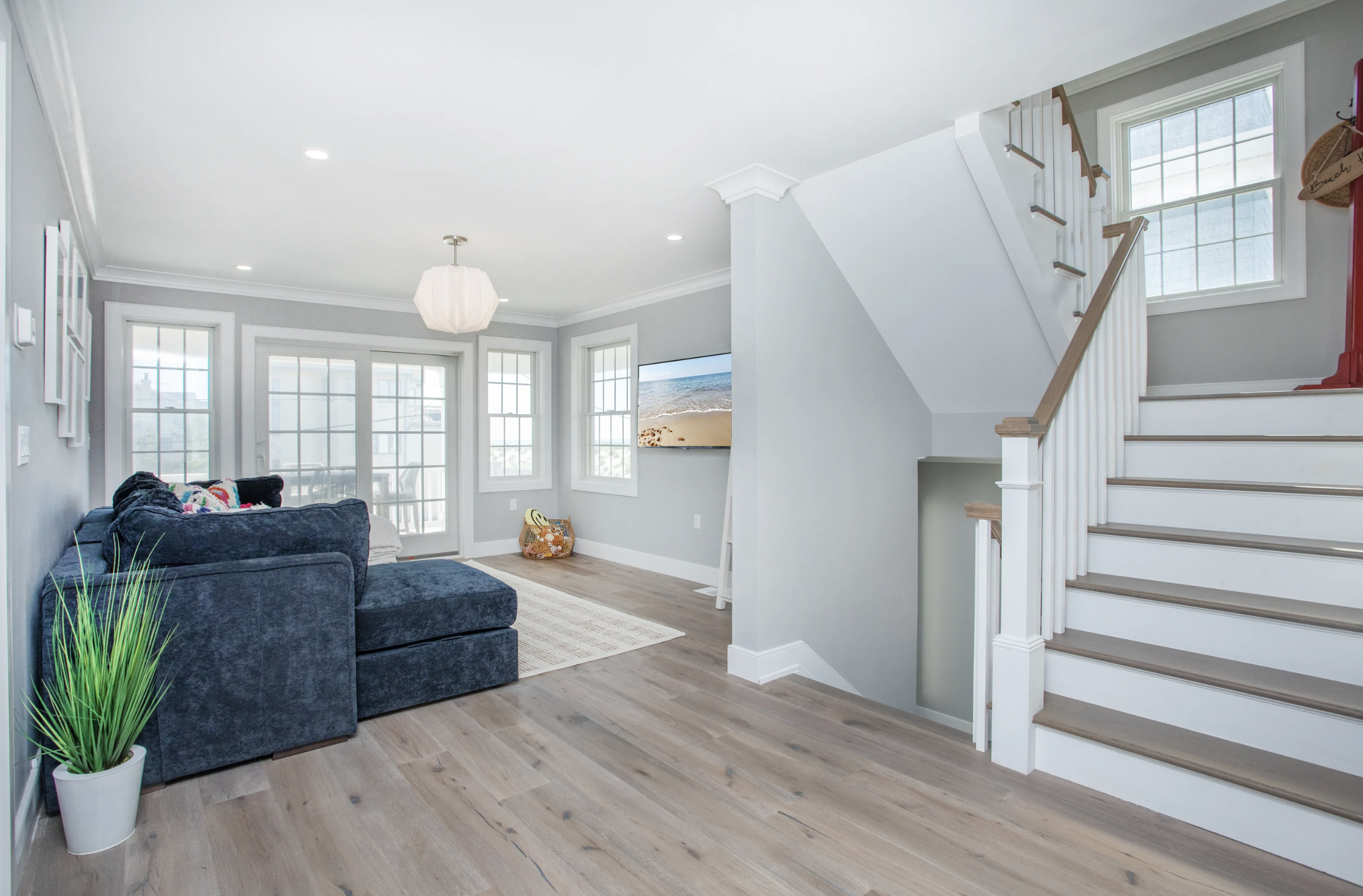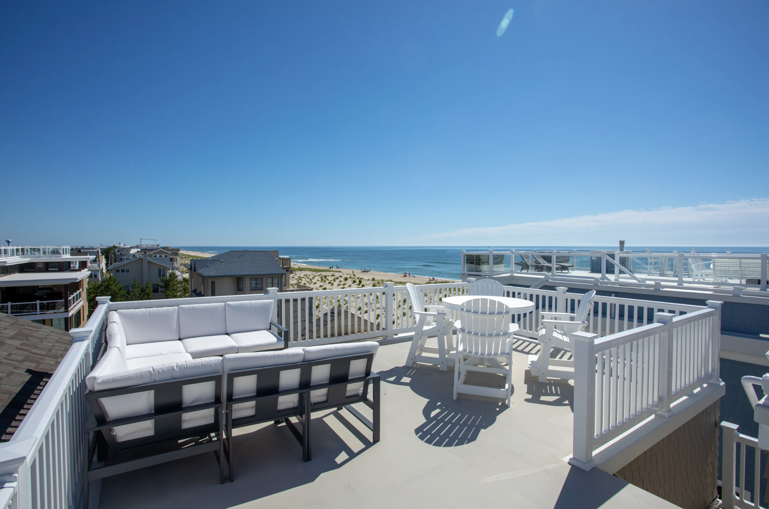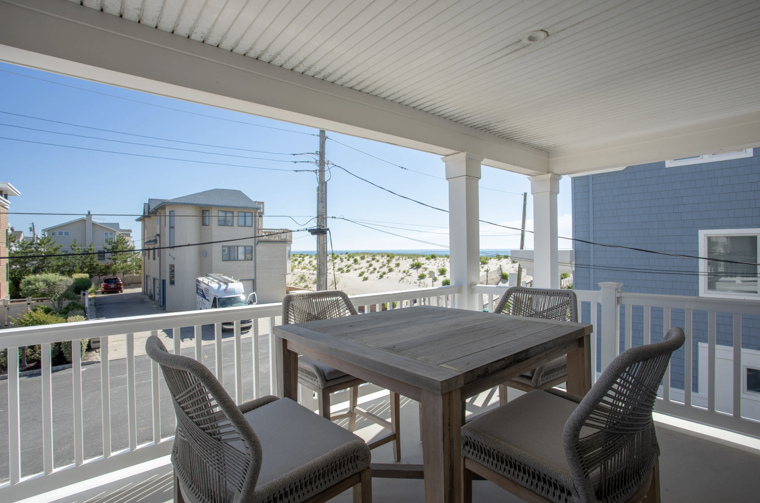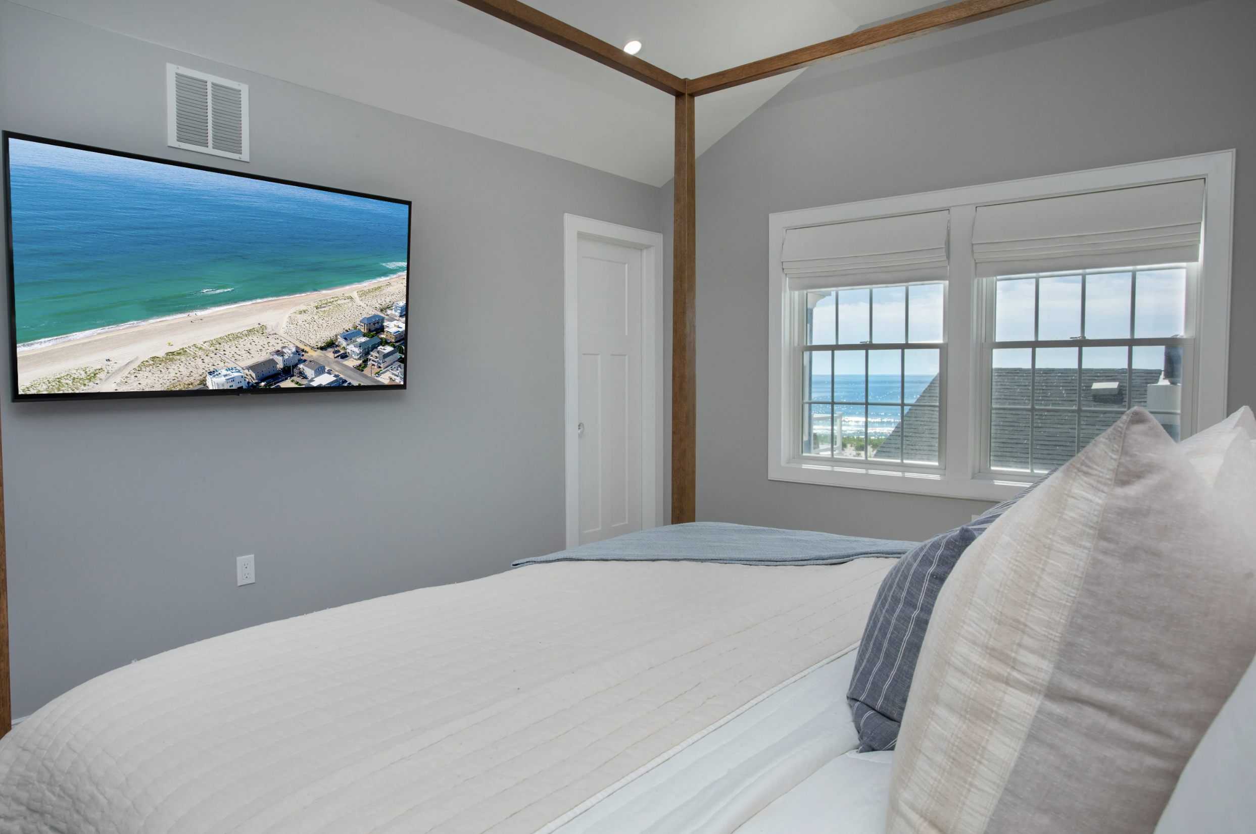This 3,484-square-foot extraordinary coastal design breaks the norm and presents an elegant spectrum of modern luxury. The six-bedroom five ½ bath sophisticated layout embodies generous open living spaces. Expansive doors and windows line the walls of the top floor, allowing a harmonious integration with the captivating ocean views. The most alluring aspect of this design is its focus on the shoreline from the living room, dining room, and kitchen that brilliantly wrap around the generously sized outdoor deck - creating a sensational flow for entertaining. With all the furniture and cabinets in airy white and windows in every direction, the Living room is truly light and bright and flows to the formal dining room. This space beckons with one-of-a-kind vaulted ceilings, with pristine beams to window cut-outs.