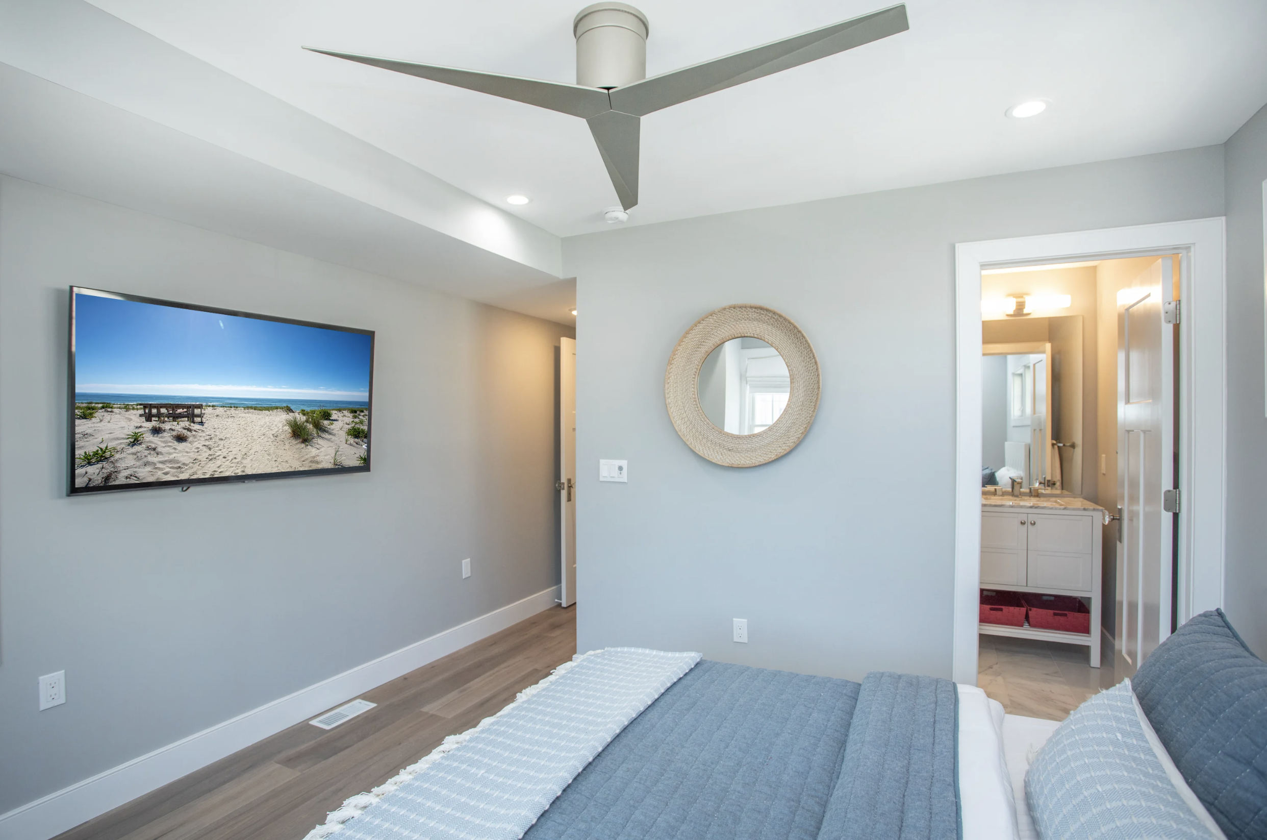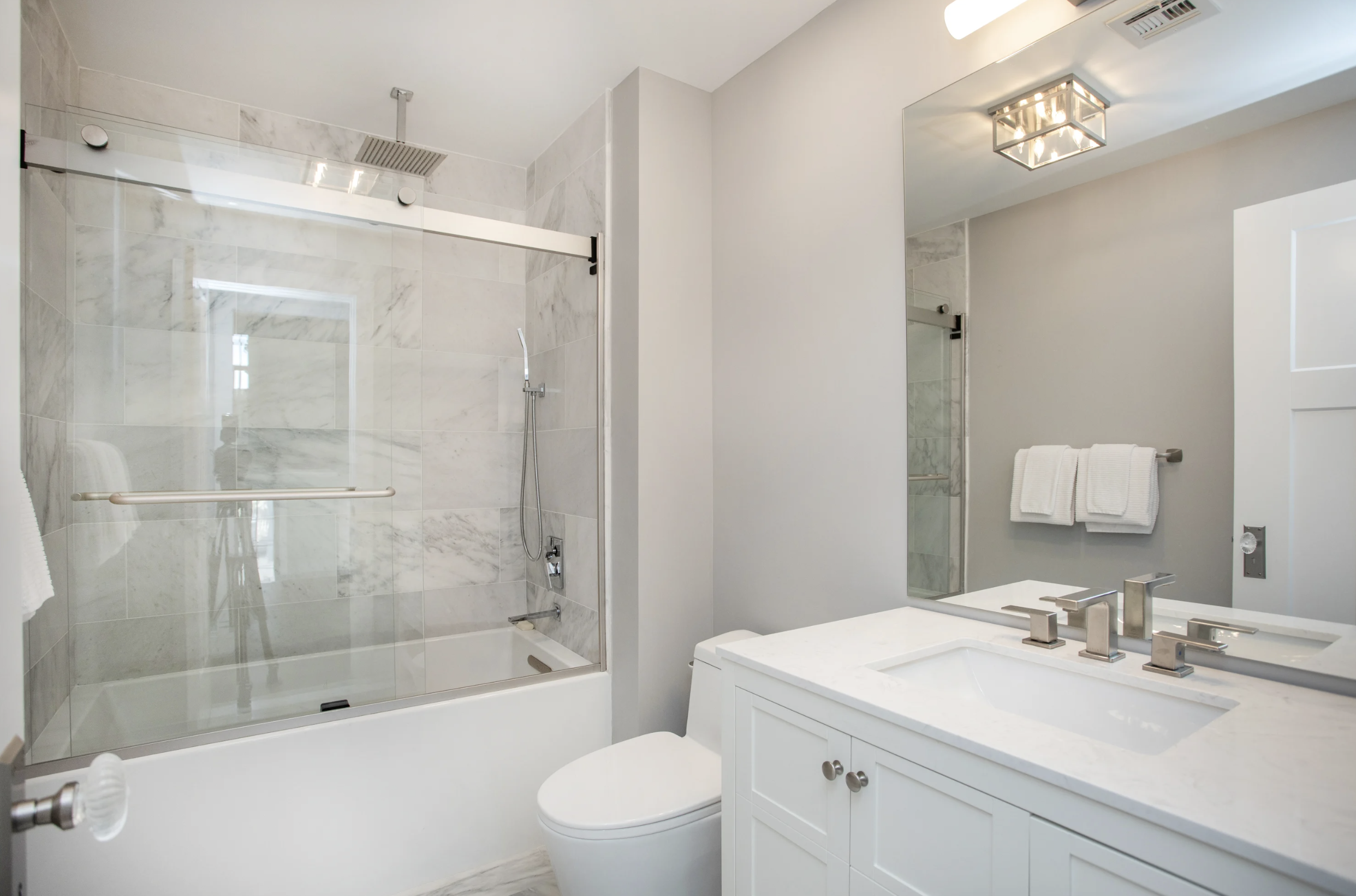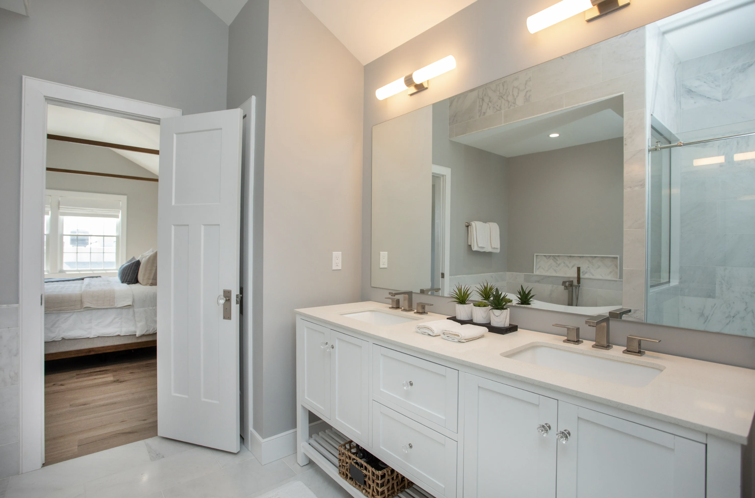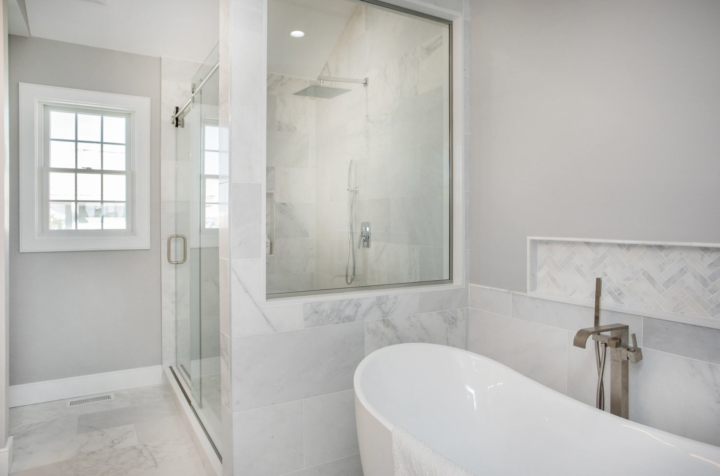 Covering the southern elevation, the graciously sized master suite boasts an enormous walk-in closet, Anderson windows & vaulted ceilings, that flow to the master bathroom. Adorned in exquisite marble, the step-in shower gleams behind frame-free glass enclosures, double vanities, and a stand-alone bath - making this space a sanctuary in itself.