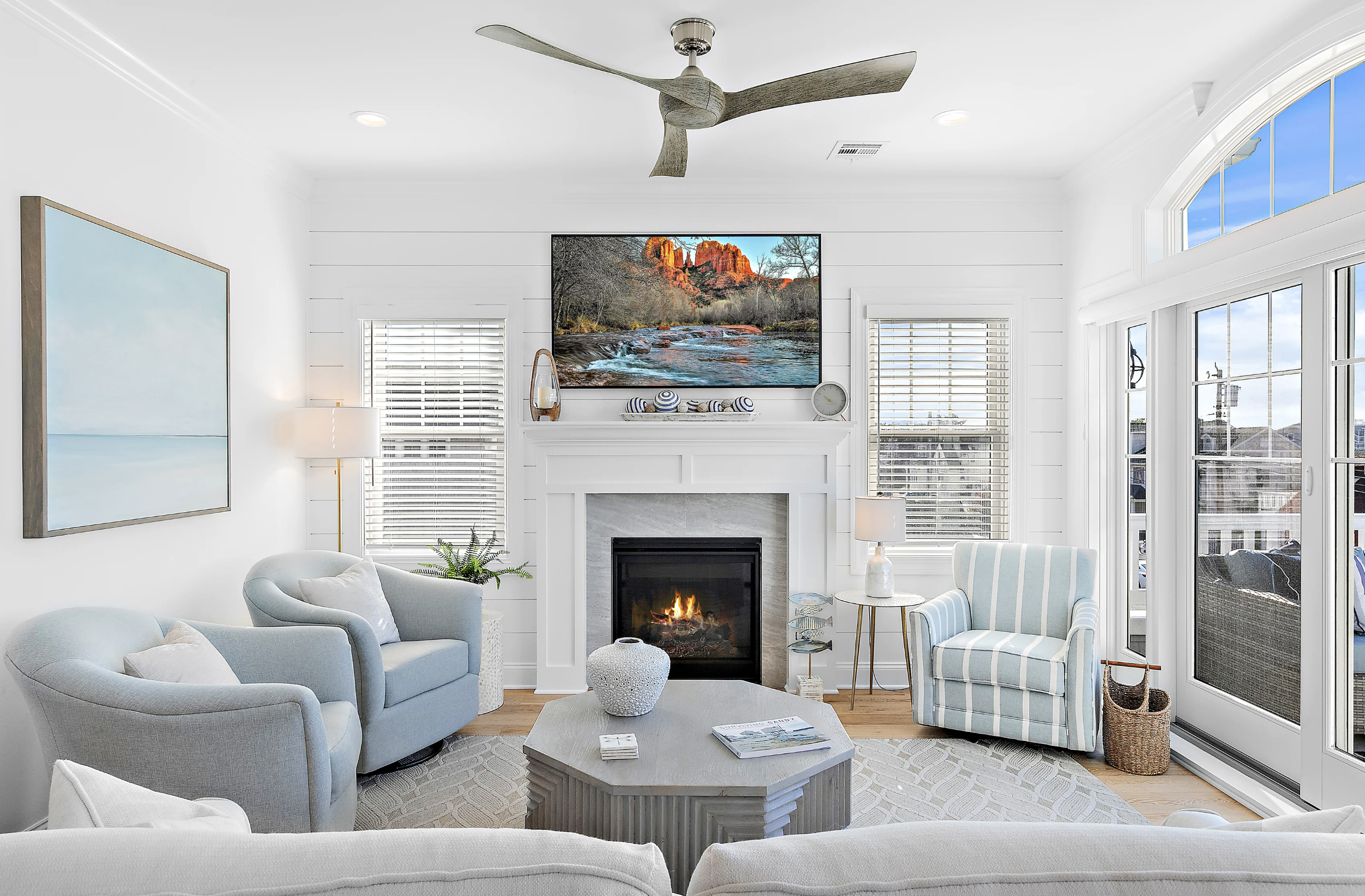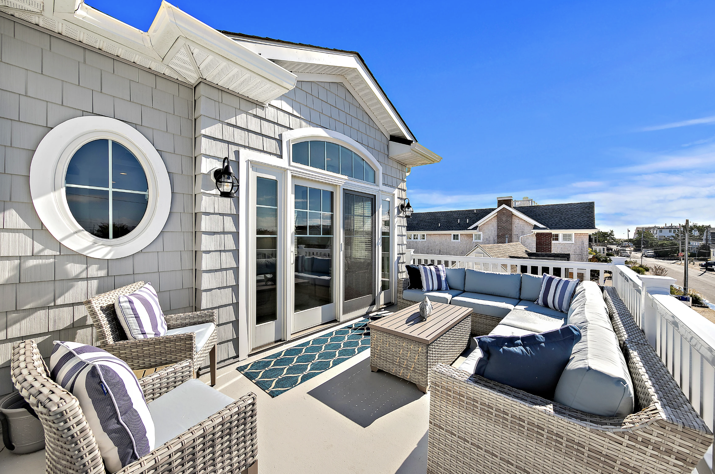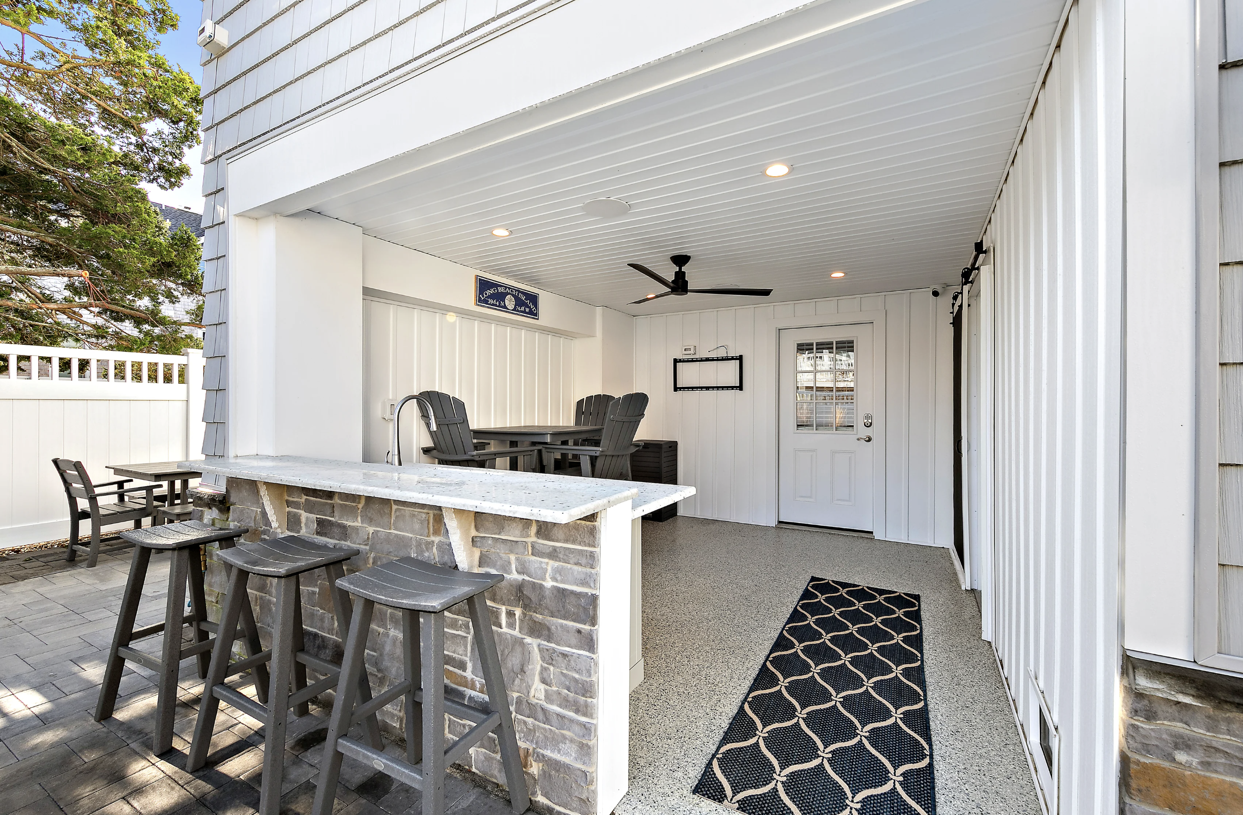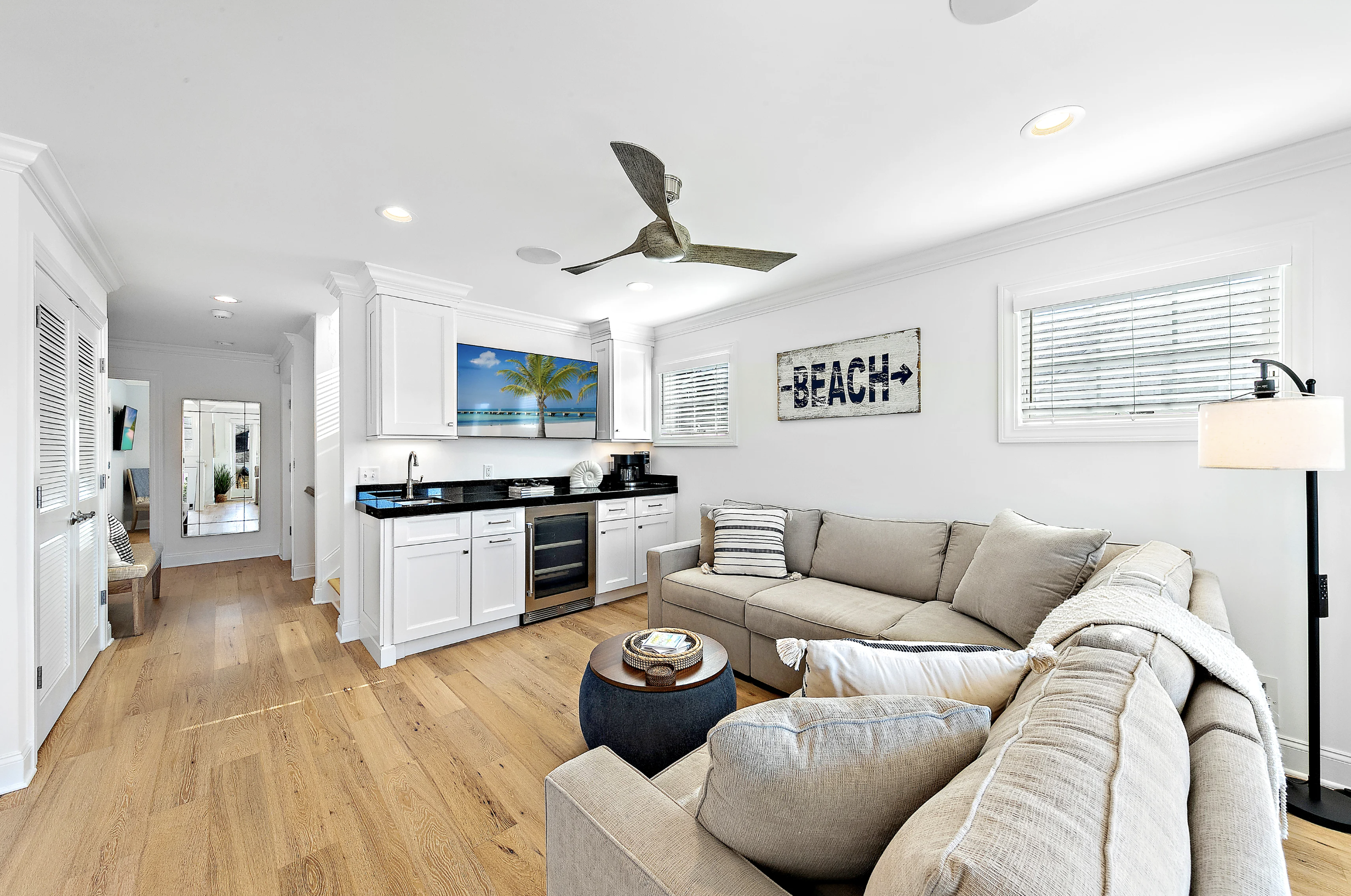 Second living room space with wet bar/coffee station, TV, and sectional seating. Covered porch with deep-seated furniture for those who want to enjoy the breezes without the sun.