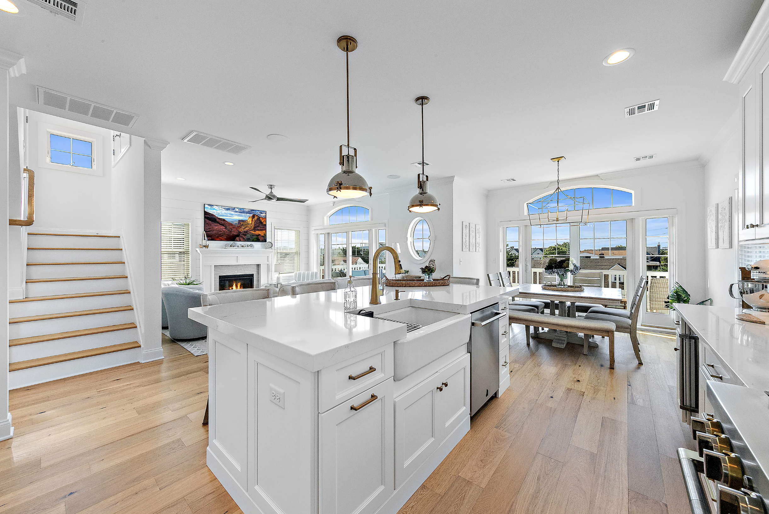 Open floor plan with luxurious living room, dining space, and gourmet kitchen. Tastefully decorated with a neutral palette for a peaceful setting to enjoy your vacation. Deck off the living room with deep-seated cushioned furniture.