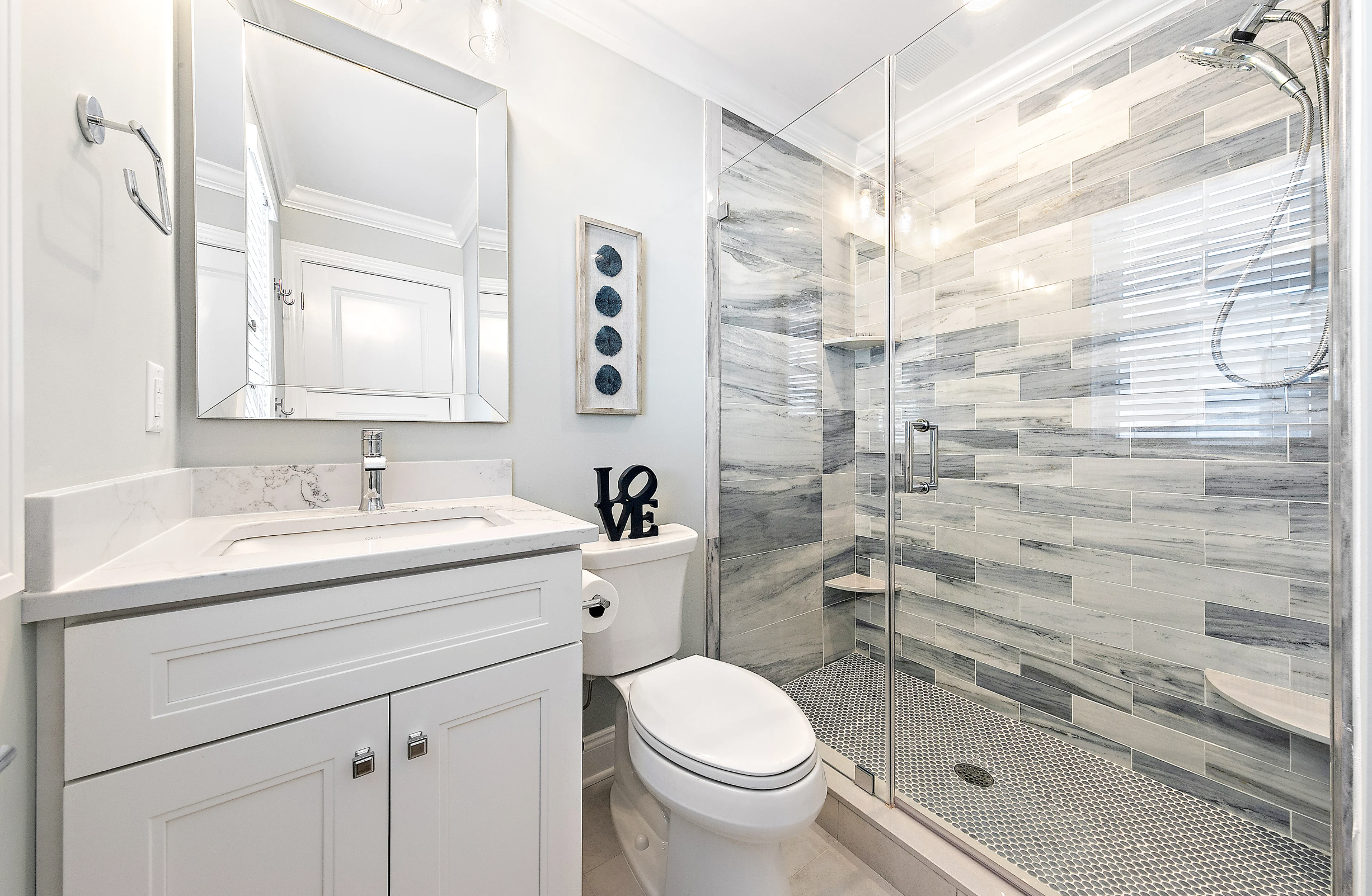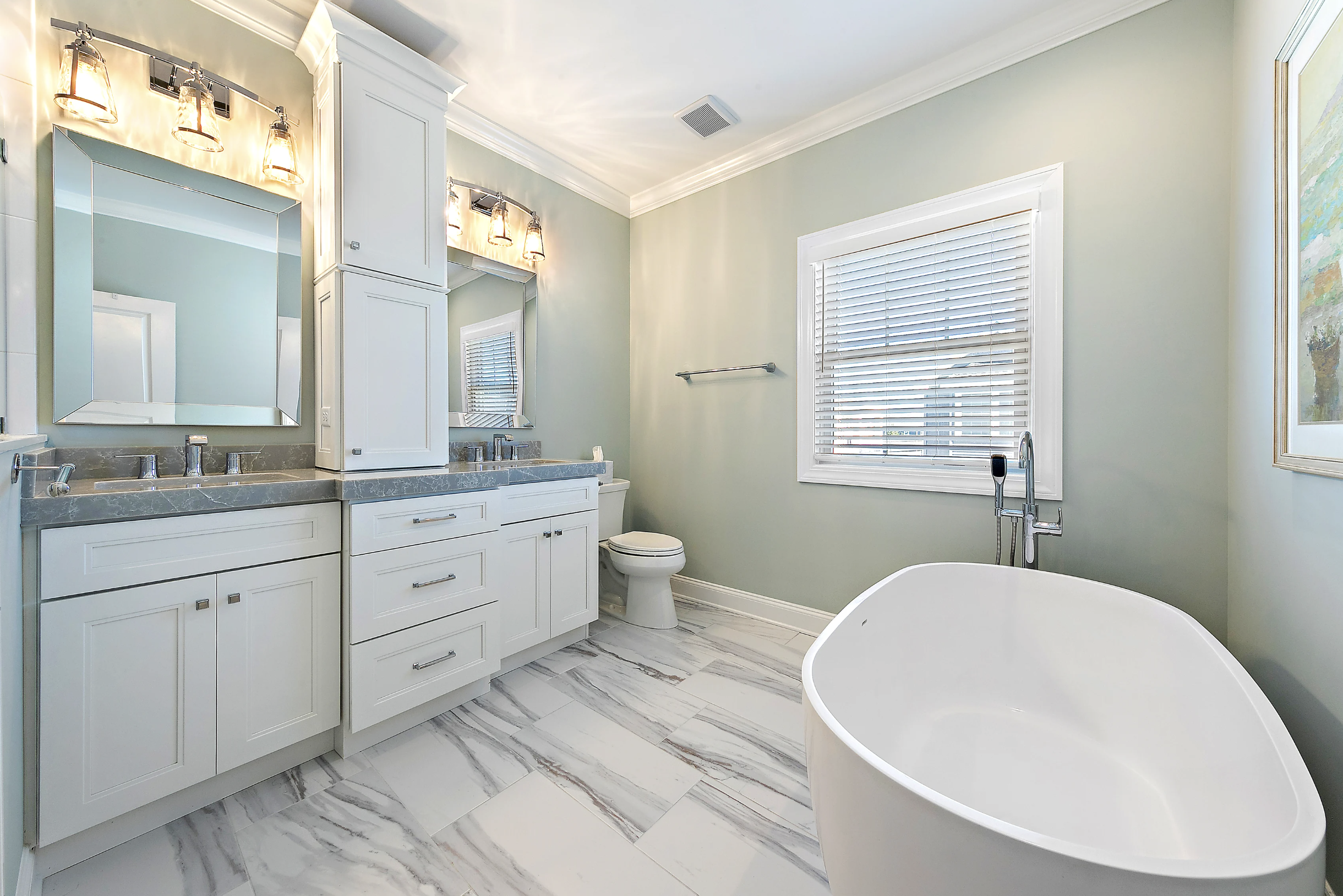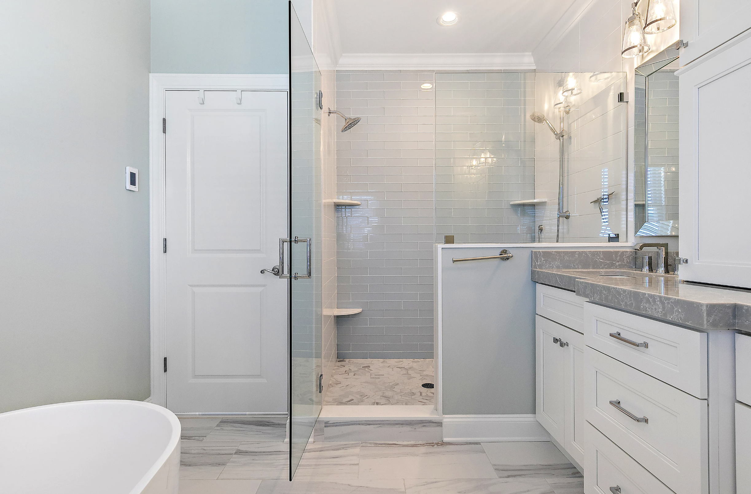 Third Floor: Lovely Primary Suite with plenty of space to unwind. Stunning bathroom with soaking tub and multi-spray oversized shower stall, double sinks, and radiant flooring. Large walk-in closet with custom shelving.