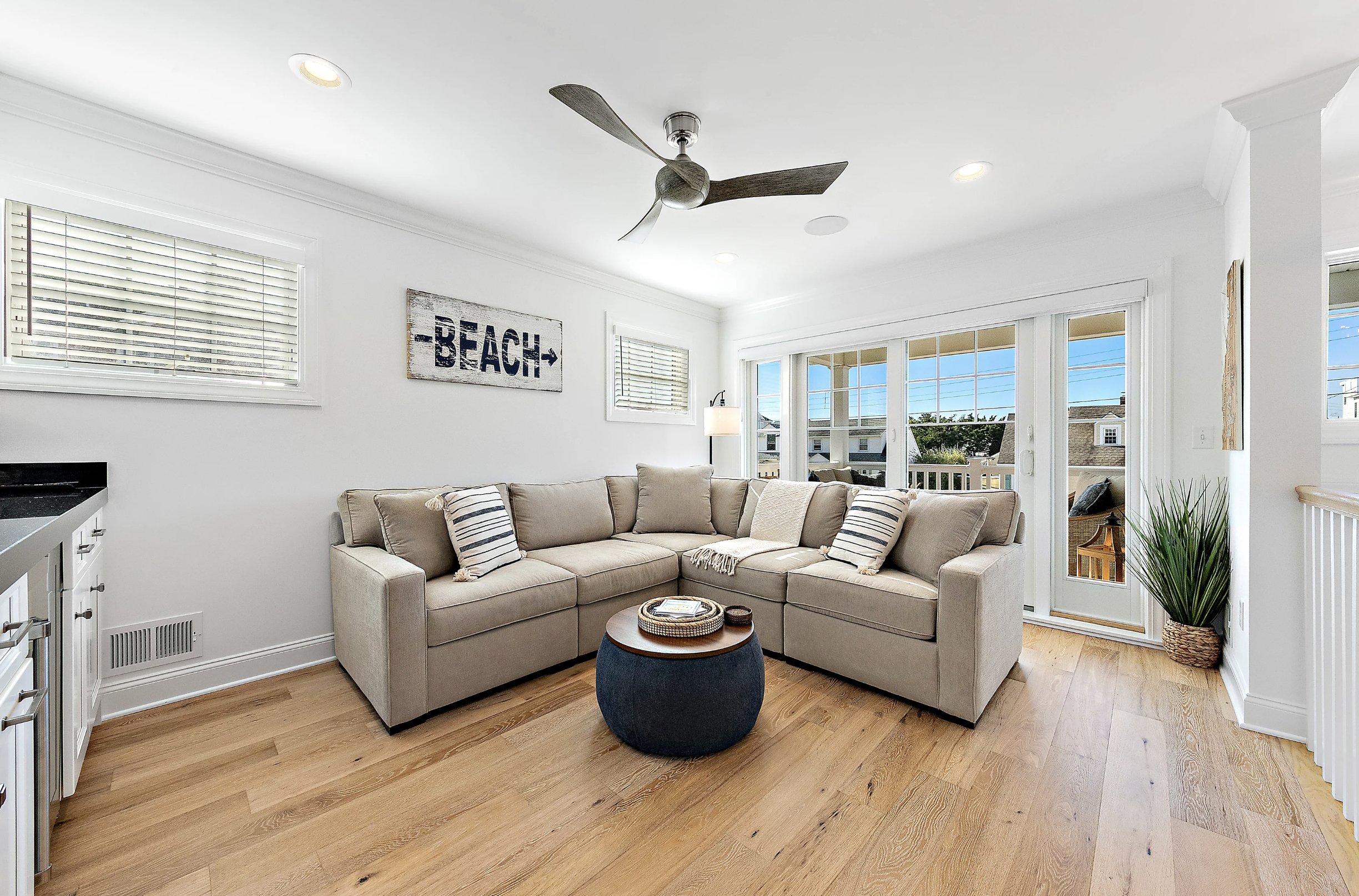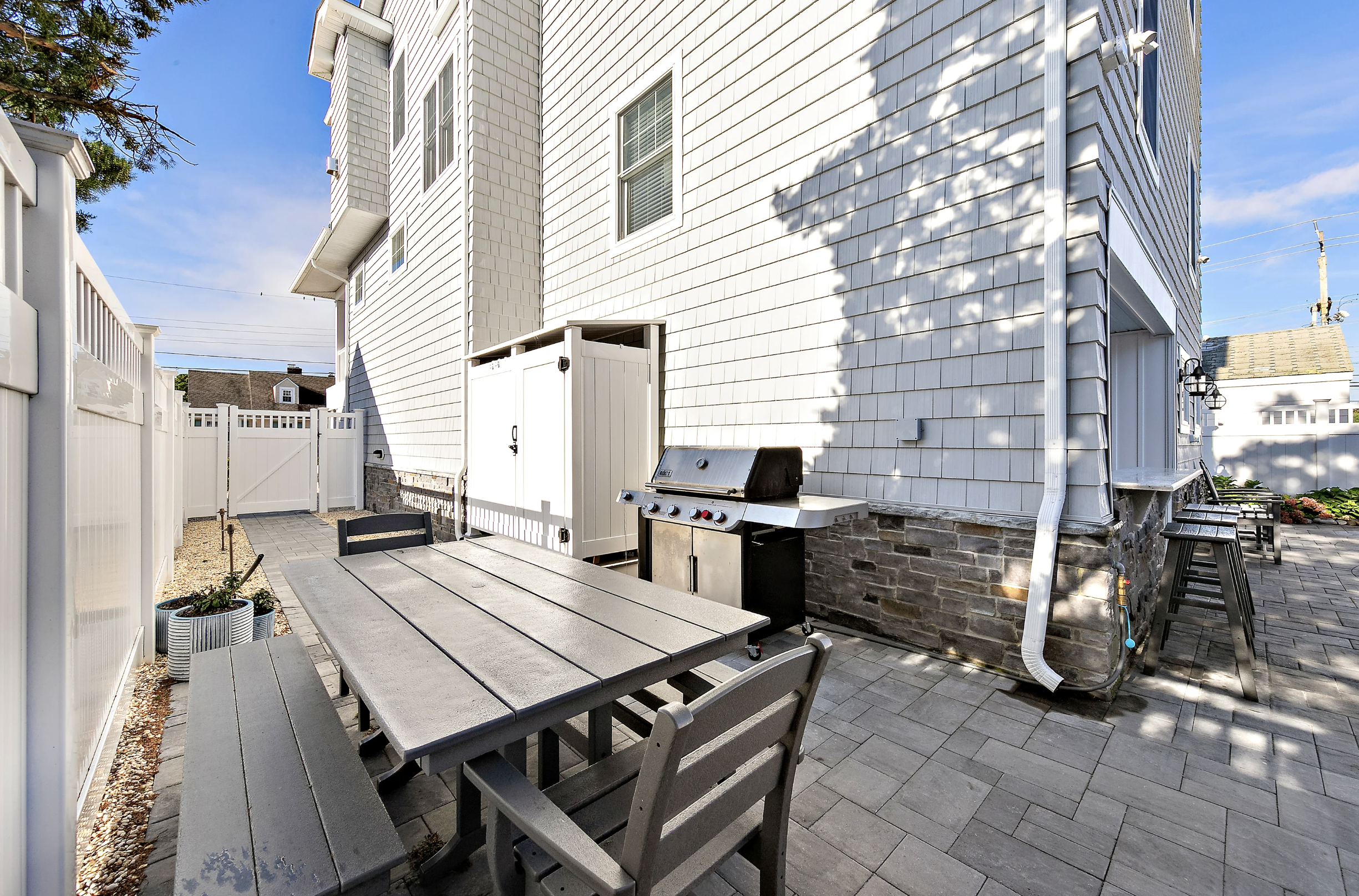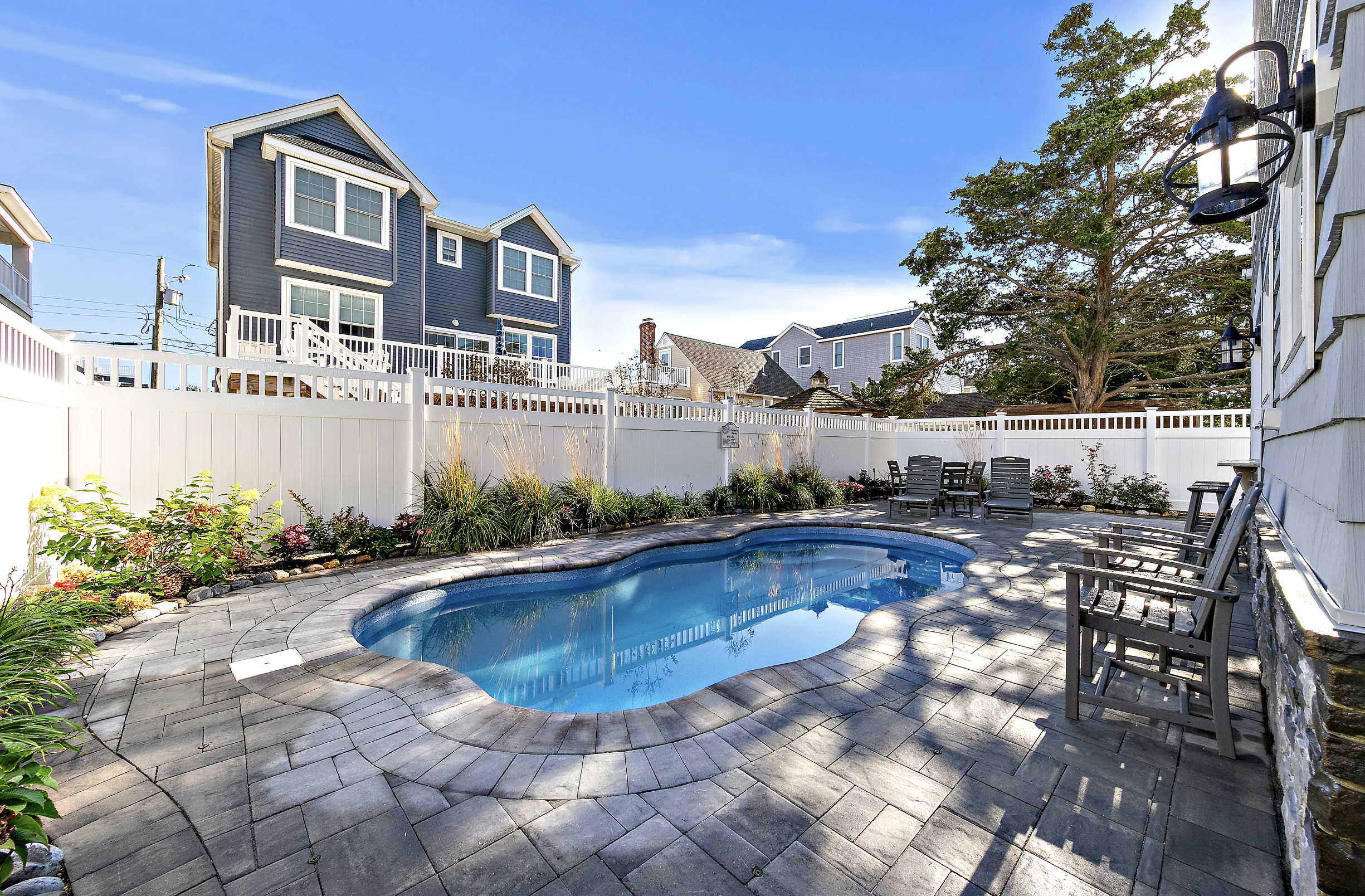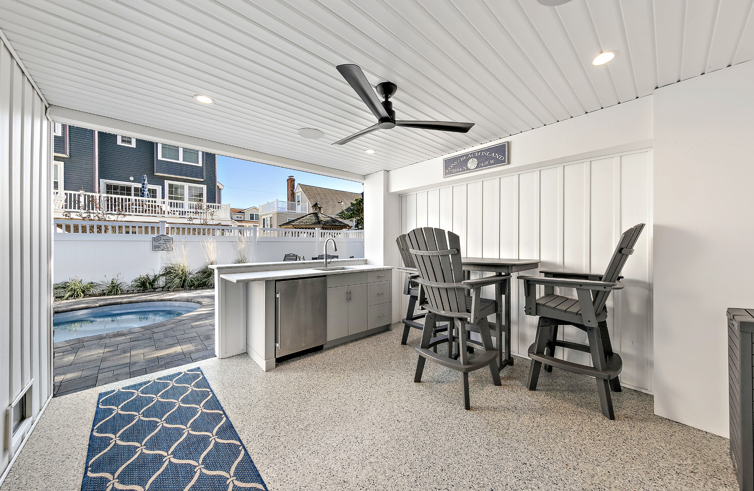 Ground Floor: The private yard with a beautiful heated pool and pavers is the perfect spot to unwind after a day at the beach. Ocean too cold? No problem, retreat to the heated pool with comfortable furnishings to accommodate the whole group. Dining area, gas grill, outdoor kitchen with mini fridge, and bar seating. The bonus room with a game table and chairs is perfect for a rare rainy day.