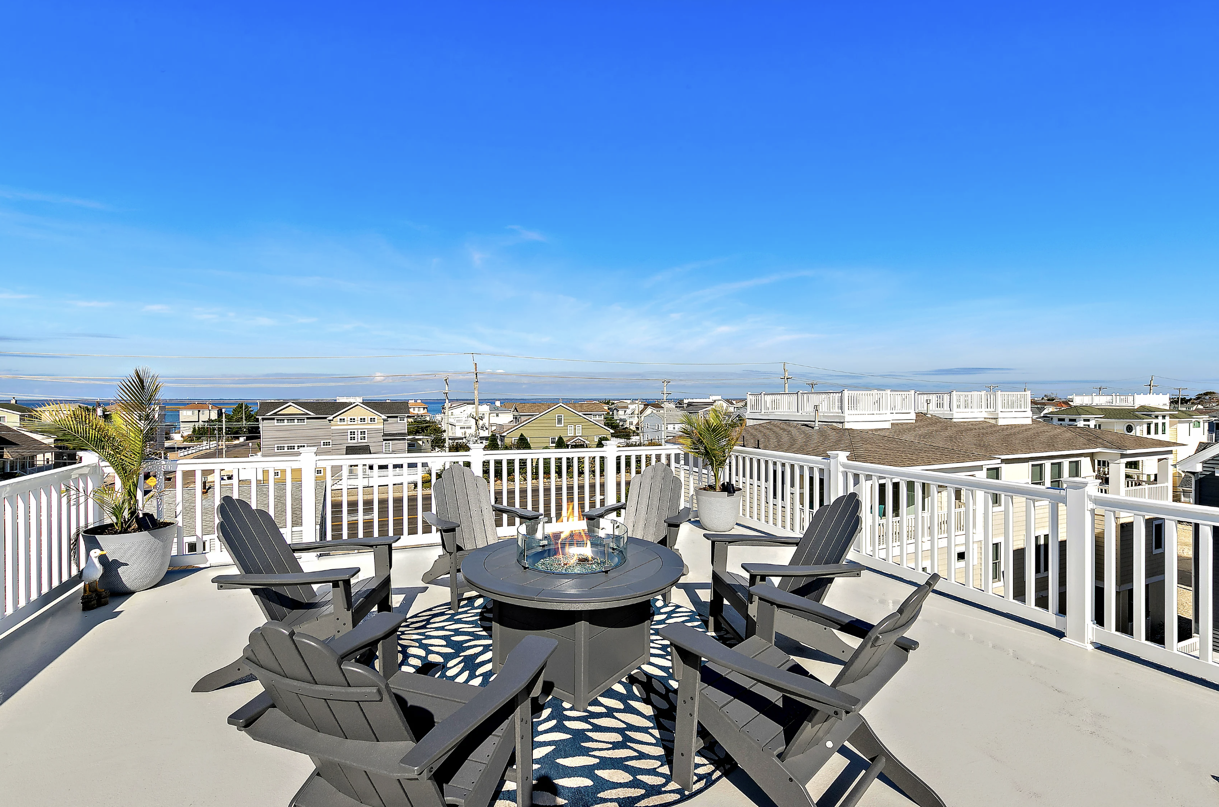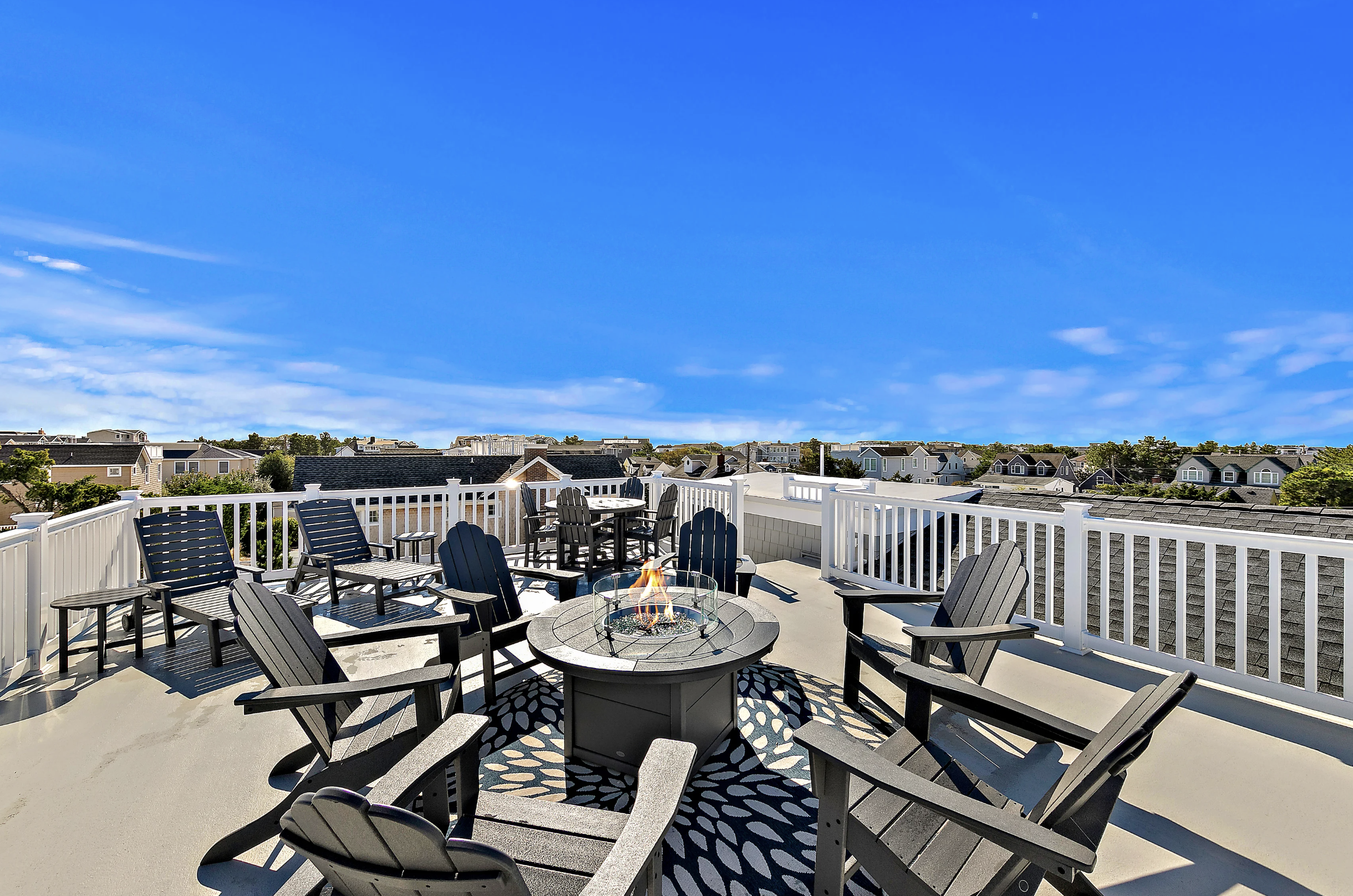 Rooftop Deck: There’s no better place to enjoy the sunsets and moonlit evenings under the stars than the rooftop deck. Adirondack chairs surround a gas firepit, chaise lounge chairs for the sun worshipers who want privacy from the pool area and the best breezes on the island can be found up here.