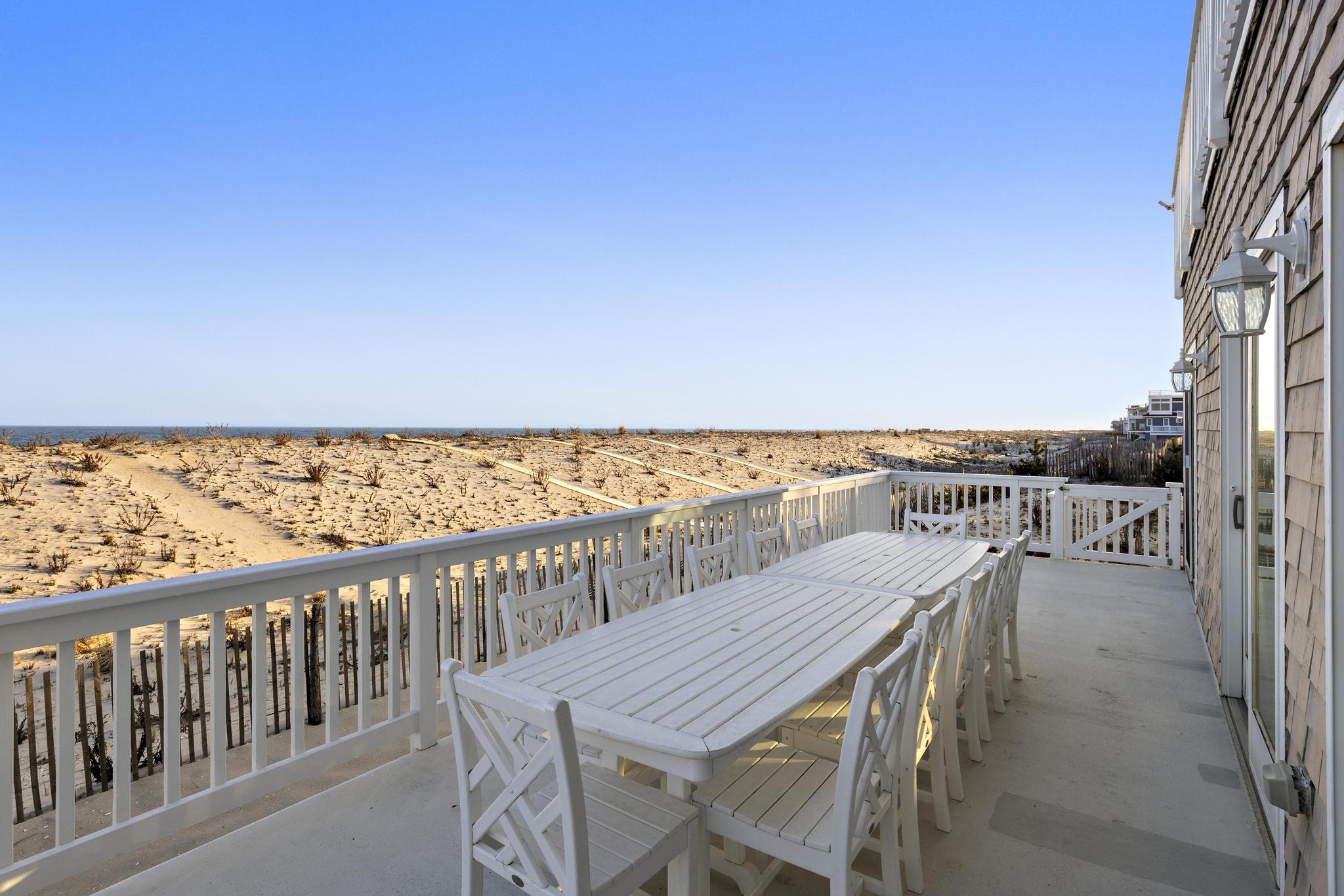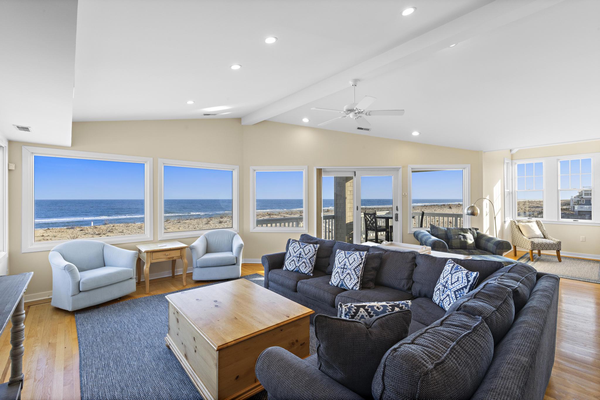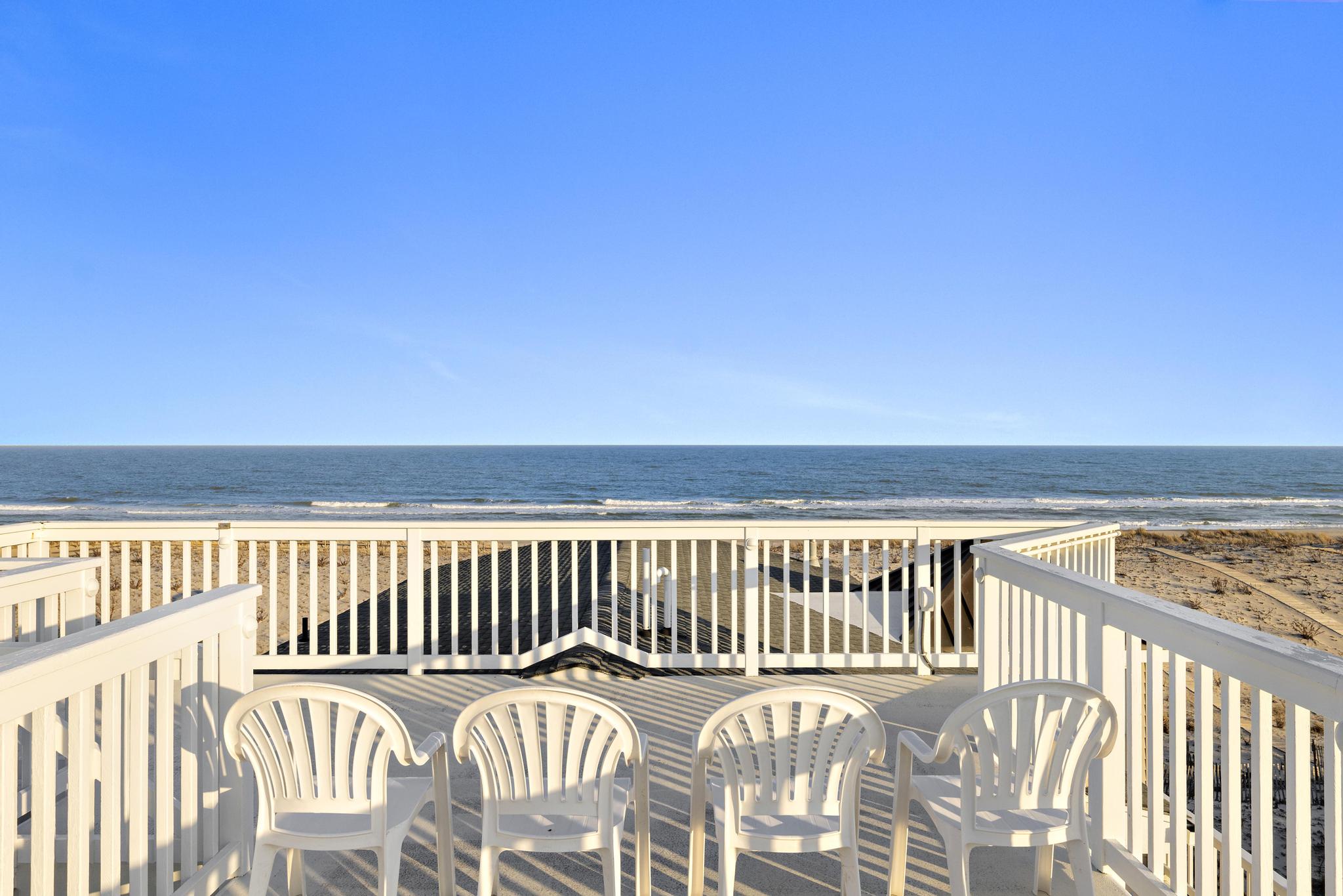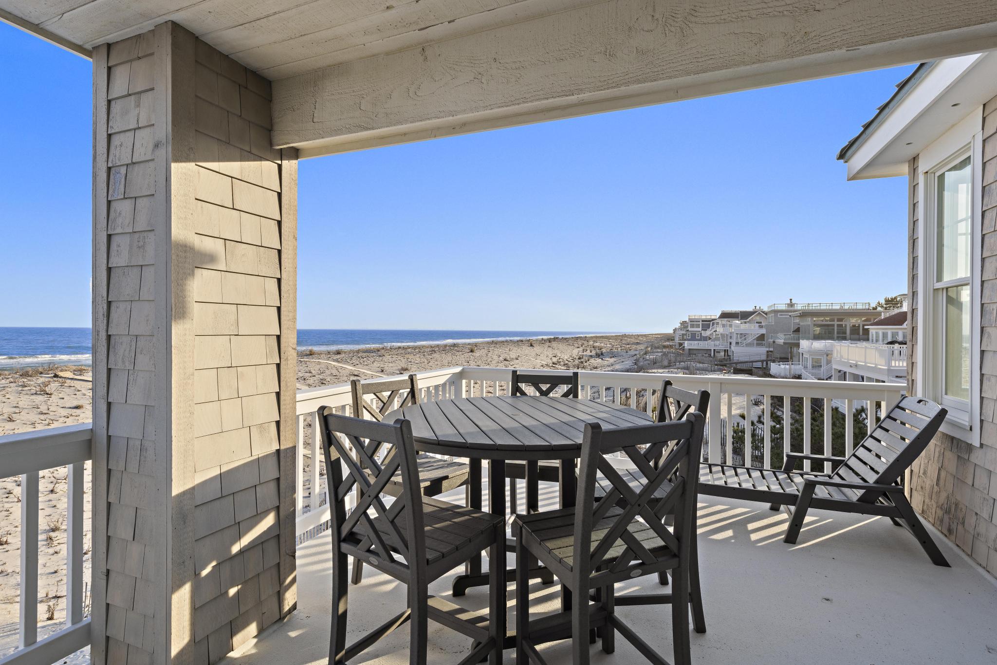 Incredible unobstructed panoramic ocean views from this 4100+ sq. ft. oceanfront home. Situated much further East of all surrounding homes, the views are extraordinary and the privacy extensive and a must see from the roof-top deck. Spacious open living concept with updated dining and kitchen area featuring windows galore and a toasty fireplace! The kitchen has granite counter tops, abundant amount of custom cabinetry, Viking range, Bosch dishwasher, French-door refrigerator, and Kitchen Island with seating for four. Enjoy the sunset with a glass of wine or a cocktail on the top floor as you relax in the second open concept living room with a full service wet bar and office. A must for all families - the house has 2 outdoor showers the garage bay that has a TV, couches, and foosball table! Enjoy cooking out on the new grill with natural gas (no need to worry about propane tanks). Brand new, full-sized washer / dryer with laundry sink make it easy to keep up with the kids. There is no shortage of views with 3 levels of decks - Be on top of the world on the large rooftop deck, overlooking the beach, ocean, bay, sunsets and sunrises.