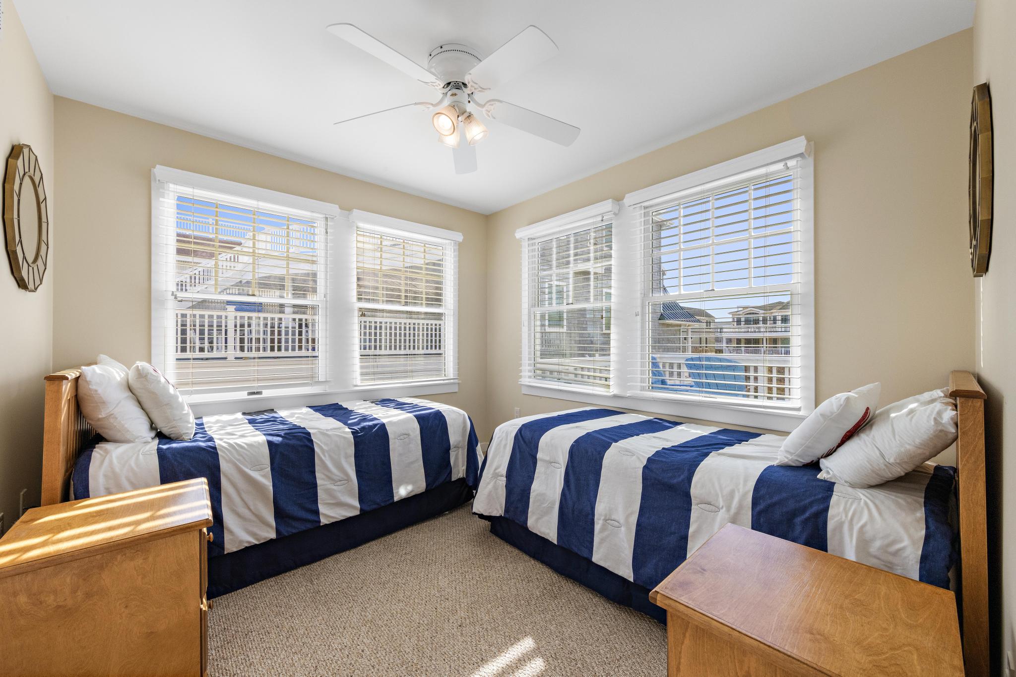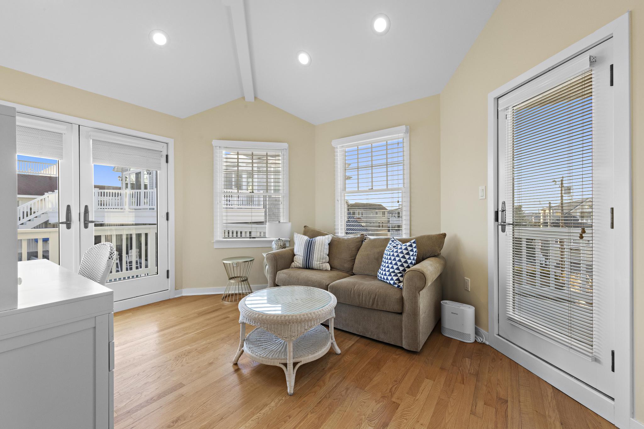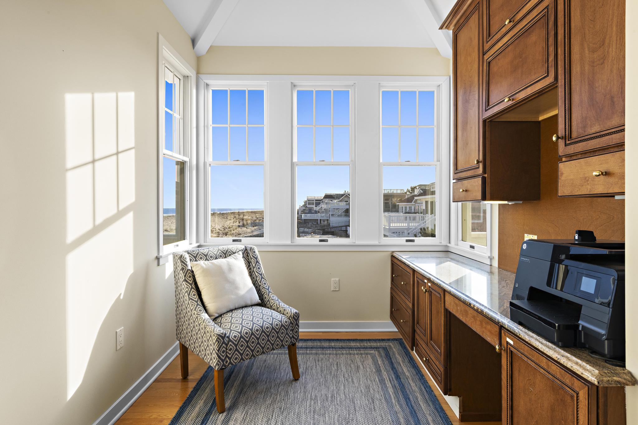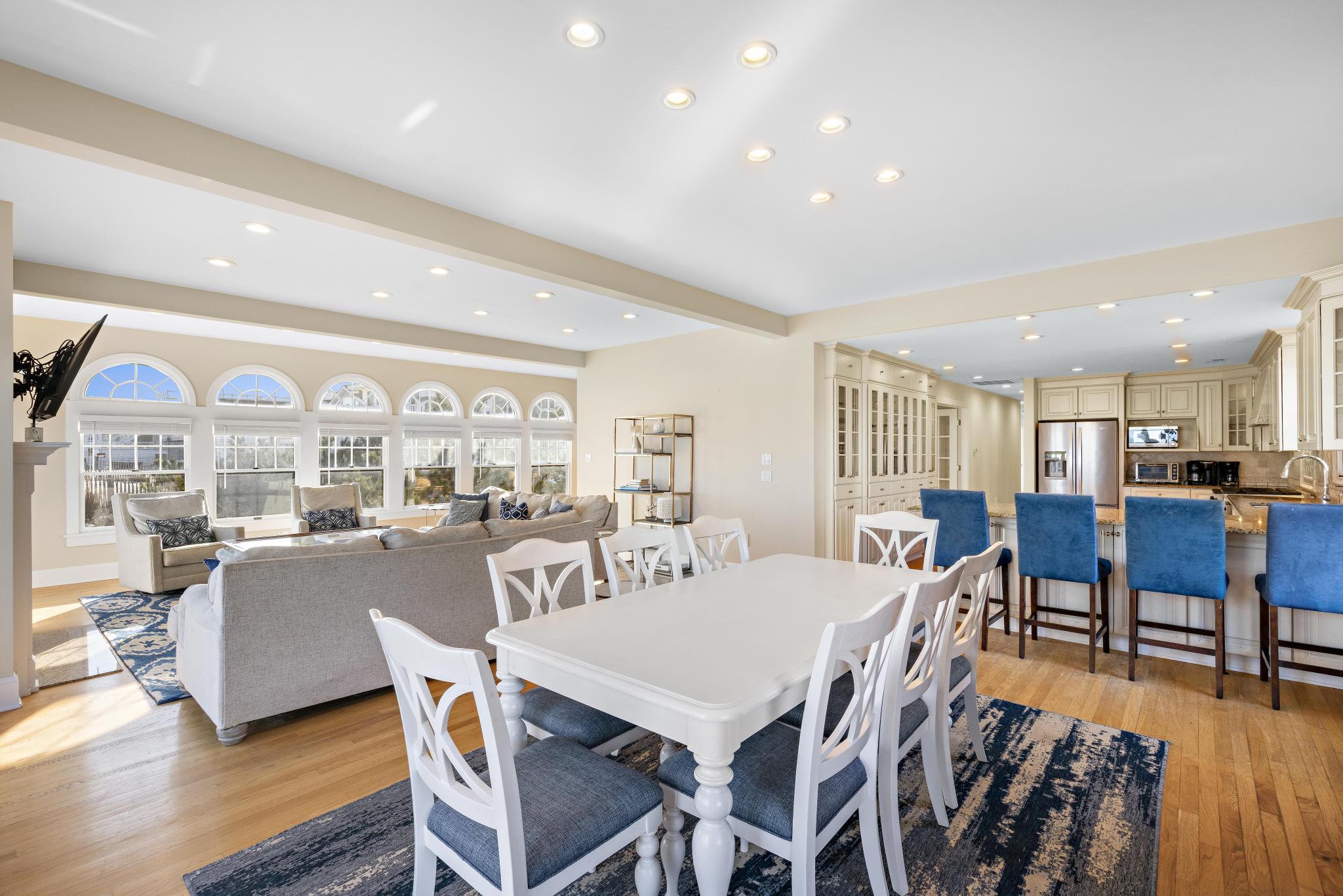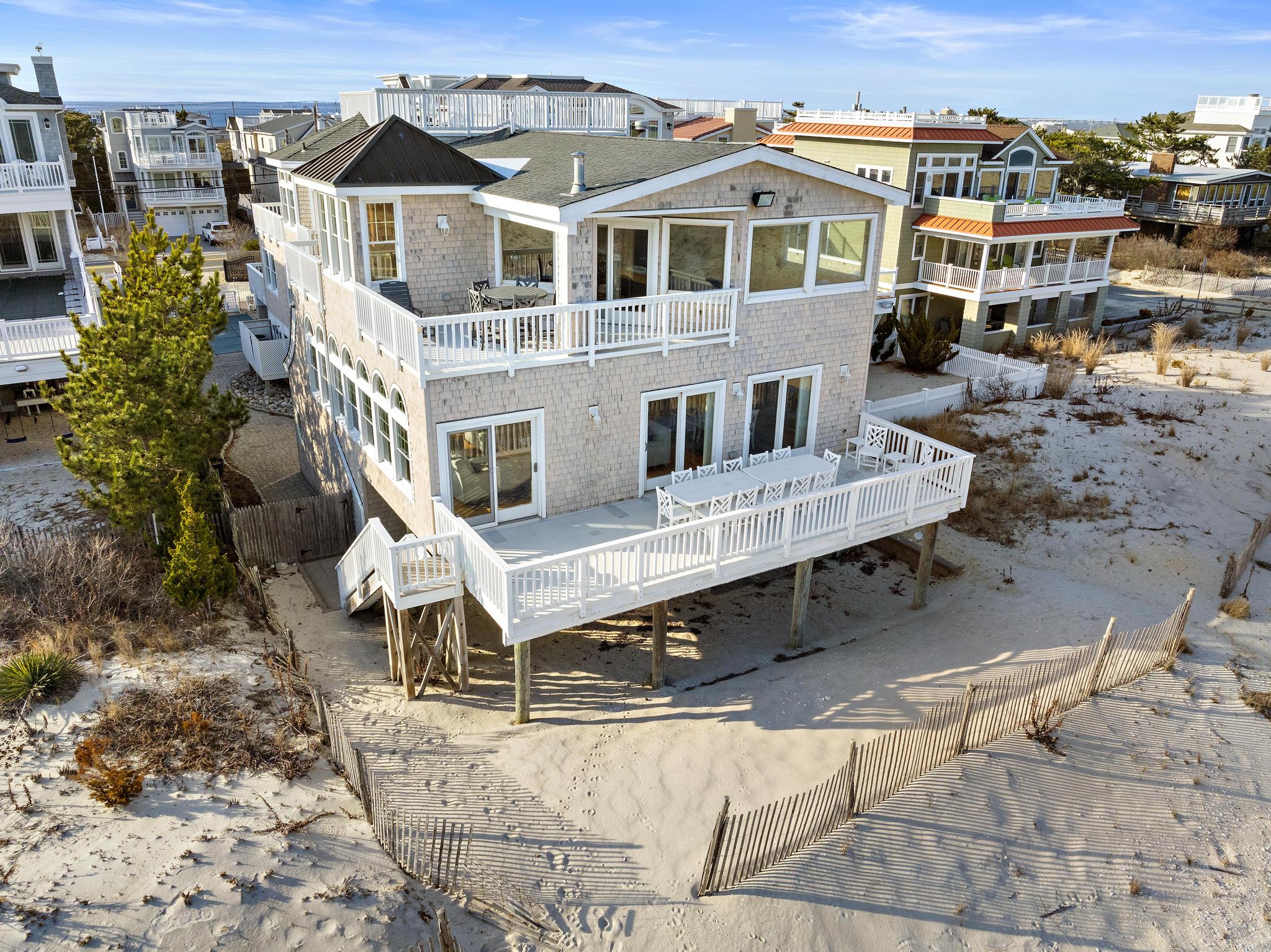 Incredible unobstructed panoramic ocean views from this 4100+ sq. ft. oceanfront home. Situated much further East of all surrounding homes, the views are extraordinary and the privacy extensive and a must see from the roof-top deck. Spacious open living concept with updated dining and kitchen area featuring windows galore and a toasty fireplace! The kitchen has granite counter tops, abundant amount of custom cabinetry, Viking range, Bosch dishwasher, French-door refrigerator, and Kitchen Island with seating for four. Enjoy the sunset with a glass of wine or a cocktail on the top floor as you relax in the second open concept living room with a full service wet bar and office. A must for all families - the house has 2 outdoor showers the garage bay that has a TV, couches, and foosball table! Enjoy cooking out on the new grill with natural gas (no need to worry about propane tanks). Brand new, full-sized washer / dryer with laundry sink make it easy to keep up with the kids. There is no shortage of views with 3 levels of decks - Be on top of the world on the large rooftop deck, overlooking the beach, ocean, bay, sunsets and sunrises.