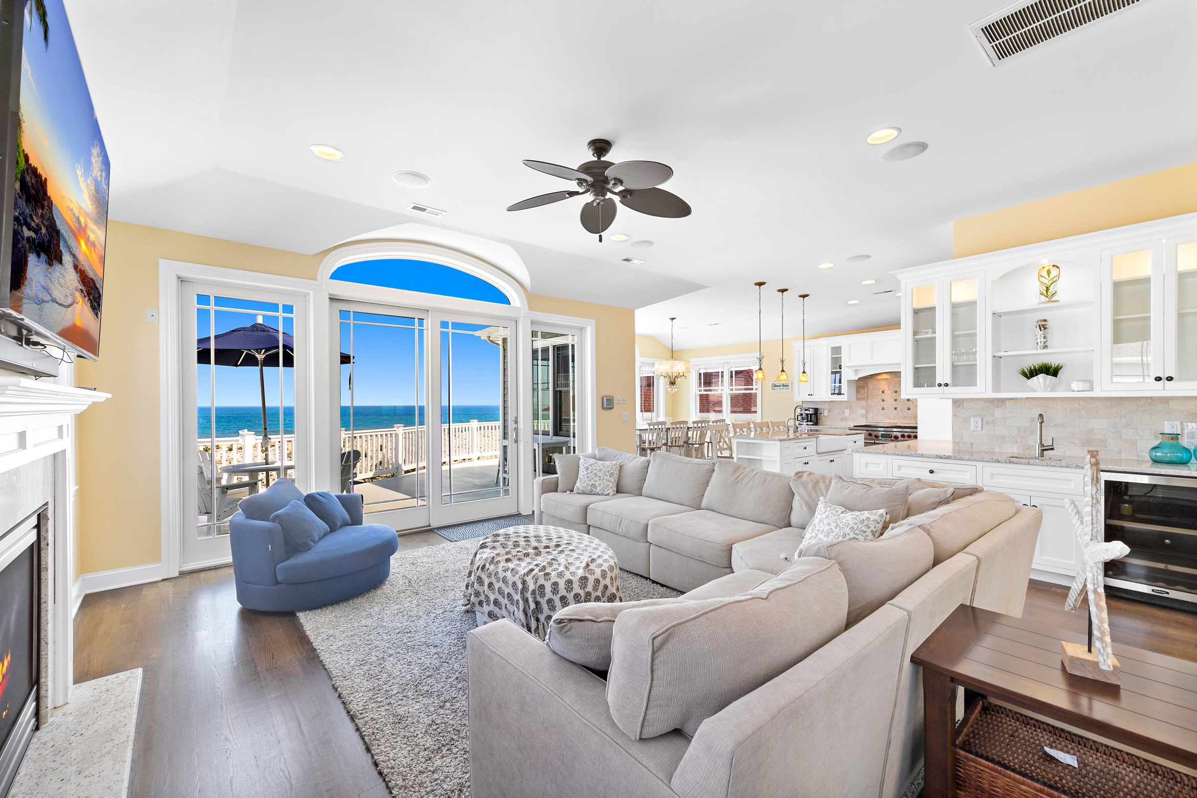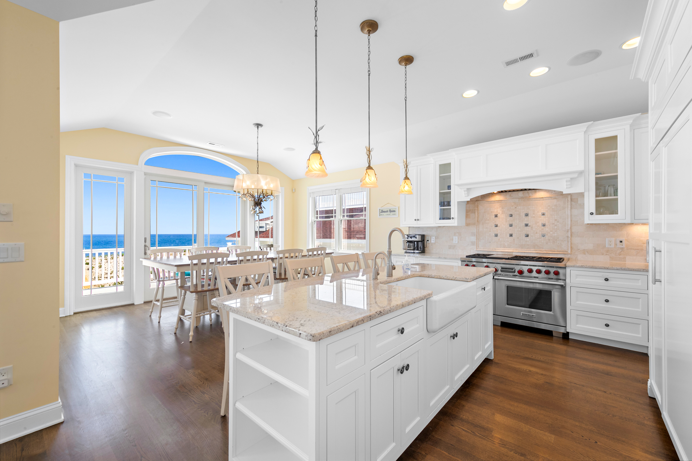 The effortless flow continues into the kitchen and dining area, opening to the deck to waterfront views. The chef’s kitchen blends sophisticated custom styling and professional-grade accoutrements. Custom cabinetry under granite counters surround a Wolf 6-burner range with griddle and double ovens, and a stunning granite island houses the stainless sink and breakfast bar. Giving a separate but open feel, the dining room seats 8-10 guests all backdropped by dramatic Atlantic views.