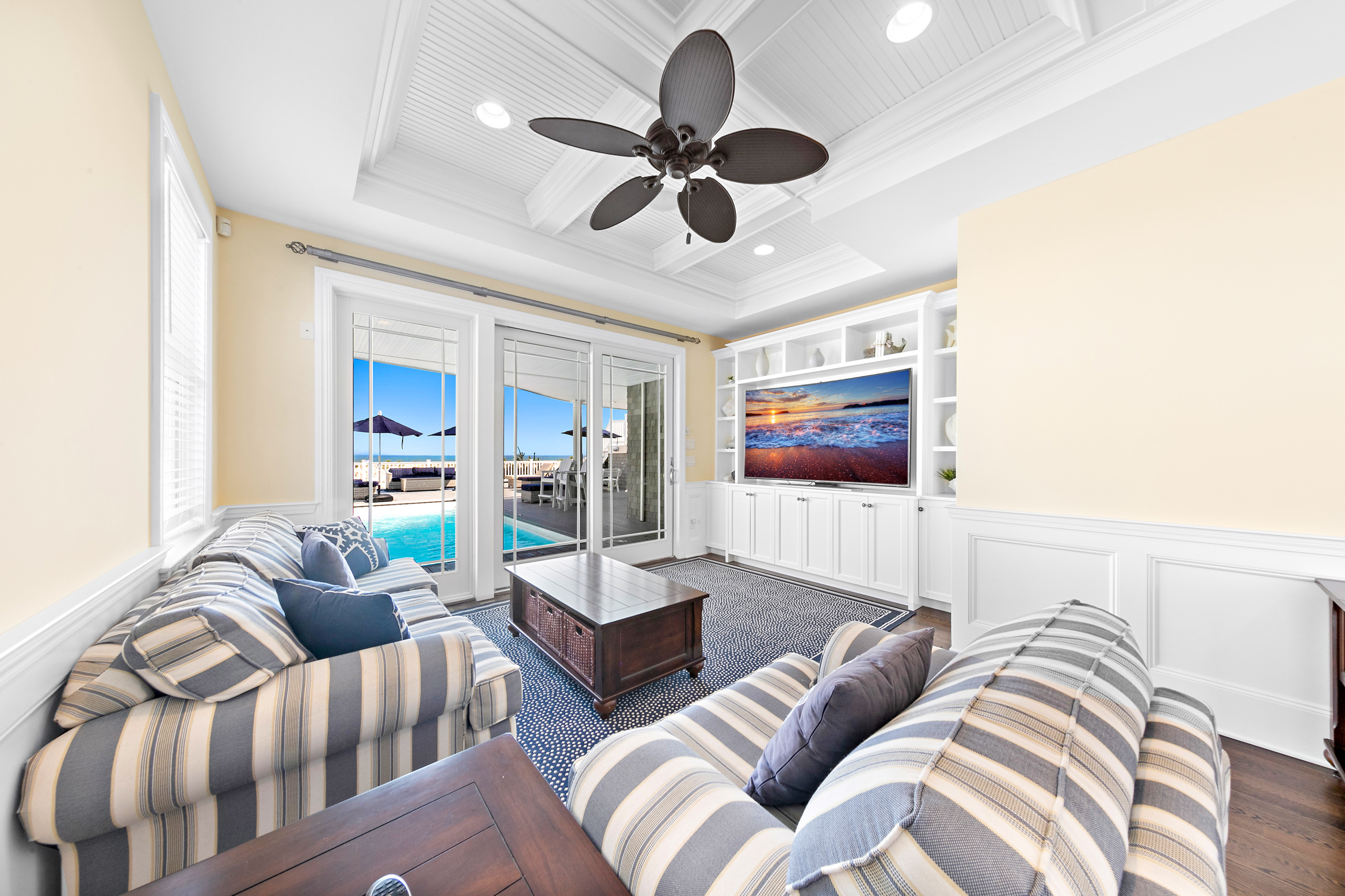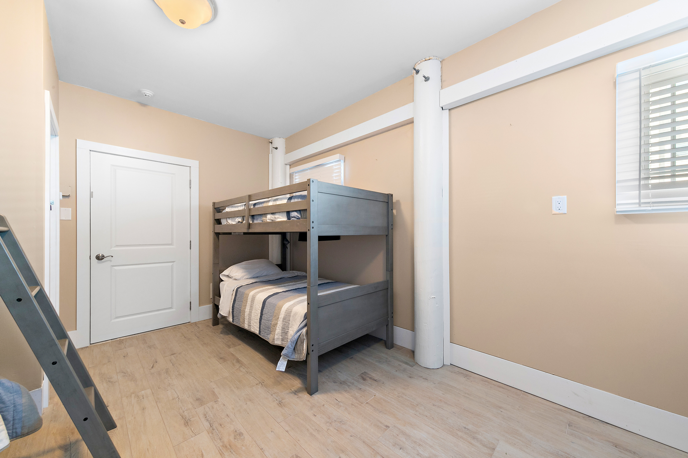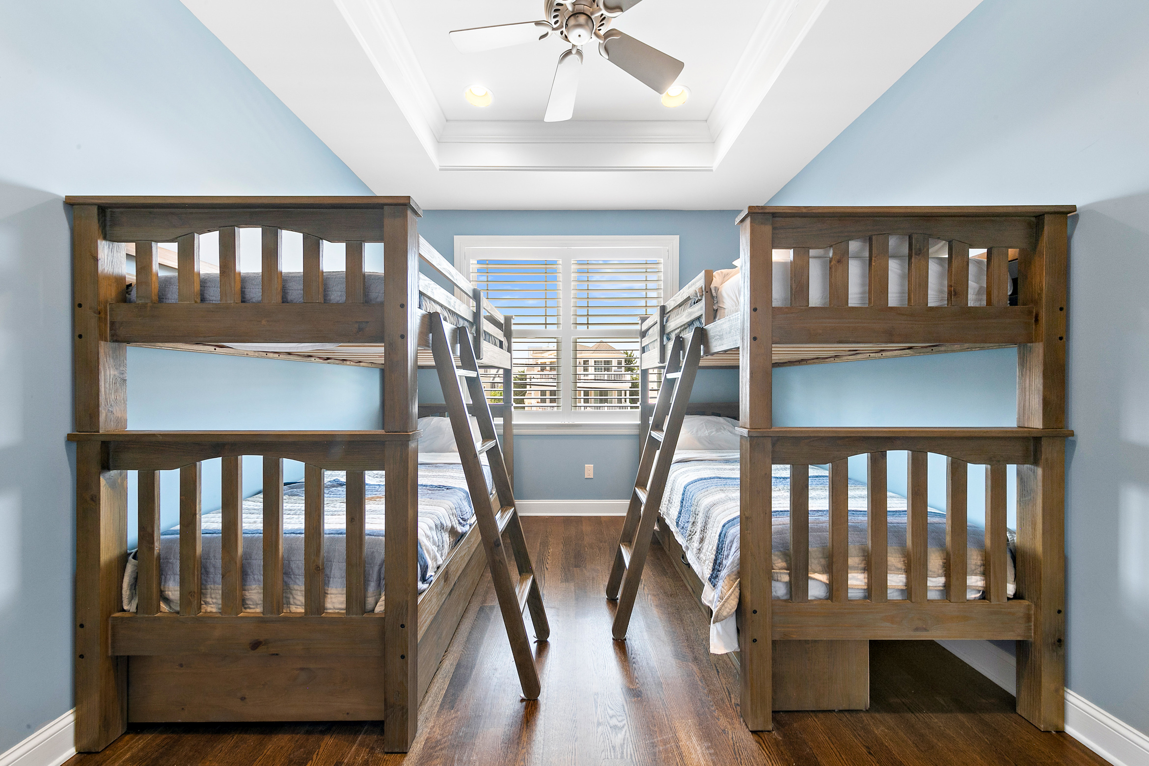 The expansive great room is adorned with custom cabinetry surrounding the flat screen TV, maximum seating, and connects to the pool patio through a floor-to-ceiling window wall suffused in sunlight. This floor continues to 3 additional bedrooms, one king en suite that is a sanctuary in itself, offering an en suite bath, double vanity, stand alone tub, and deck access through glass sliding doors. Another king bedroom, and a bunk room with 2 bunks/4 twins with 1 trundle serviced by a nicely appointed hall full bath, complete this floor.