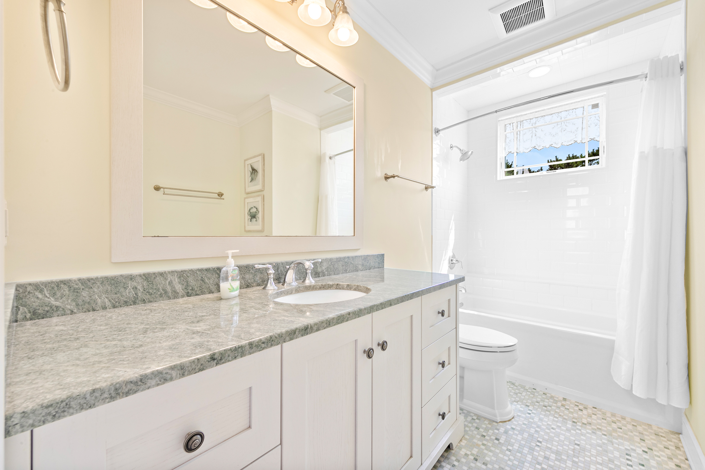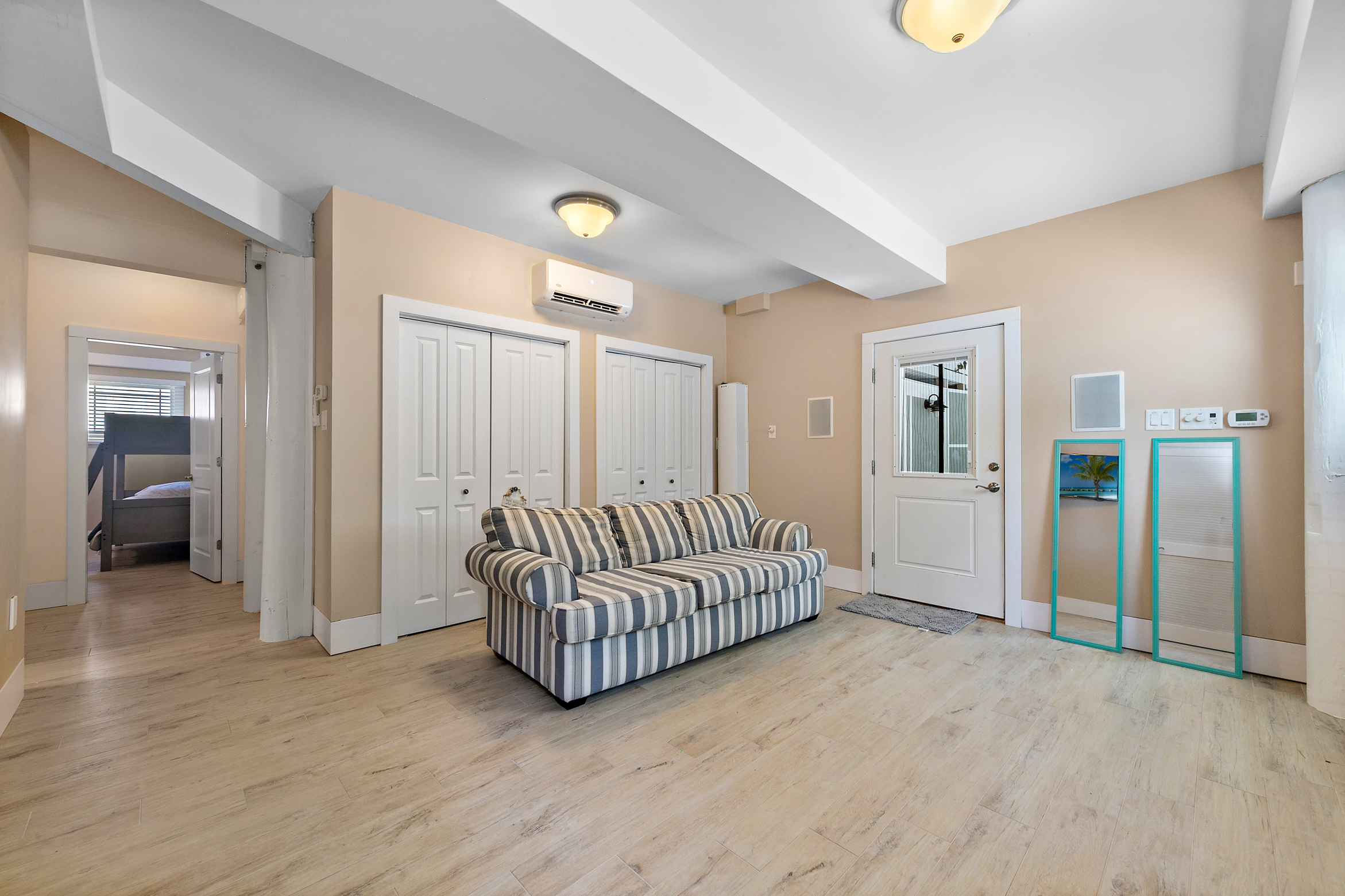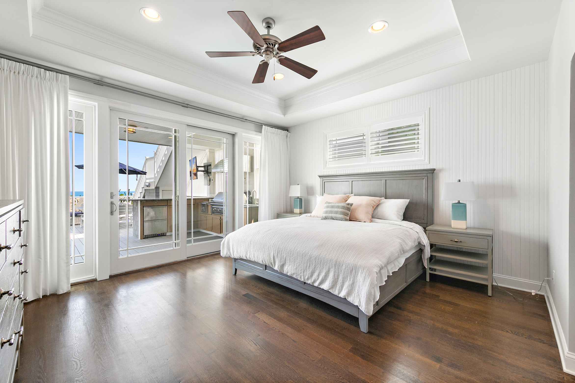 The expansive great room is adorned with custom cabinetry surrounding the flat screen TV, maximum seating, and connects to the pool patio through a floor-to-ceiling window wall suffused in sunlight. This floor continues to 3 additional bedrooms, one king en suite that is a sanctuary in itself, offering an en suite bath, double vanity, stand alone tub, and deck access through glass sliding doors. Another king bedroom, and a bunk room with 2 bunks/4 twins with 1 trundle serviced by a nicely appointed hall full bath, complete this floor.
