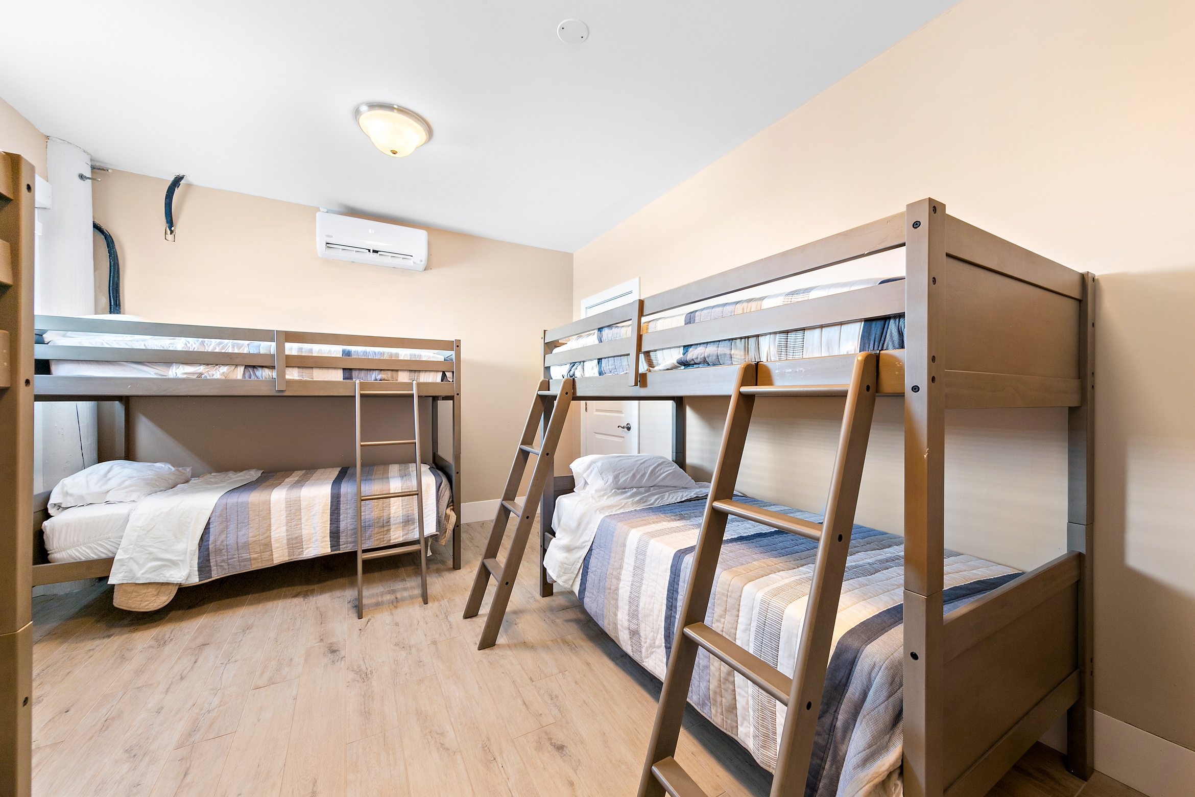 The ground floor offers a workout room with TV, a bunk room with 3 bunks/6 twins and a hall full bath with shower.