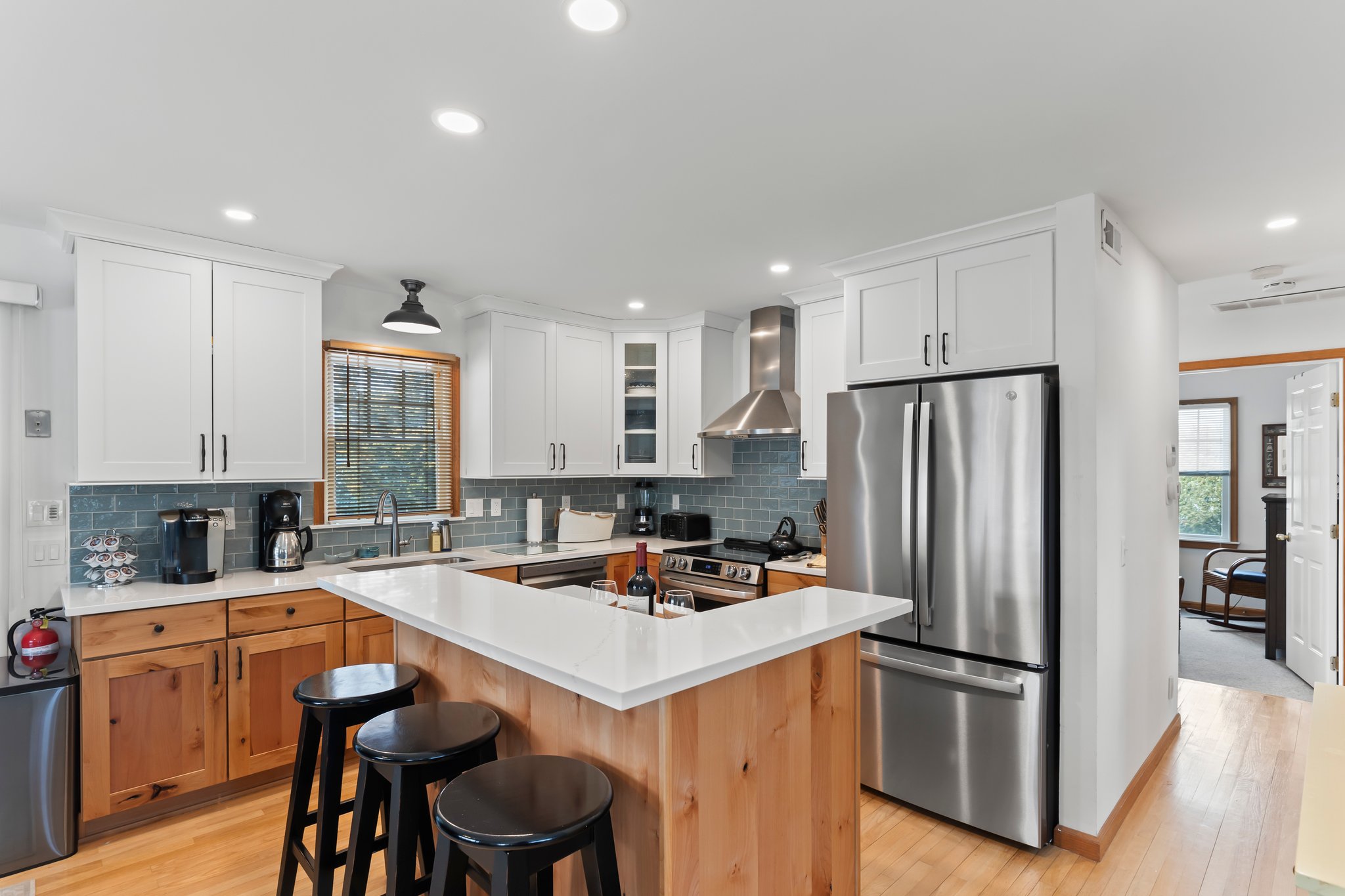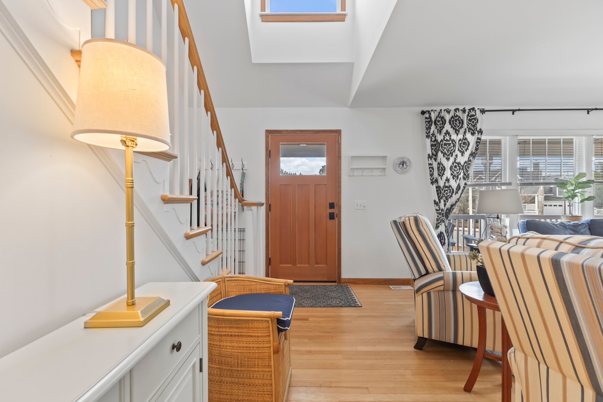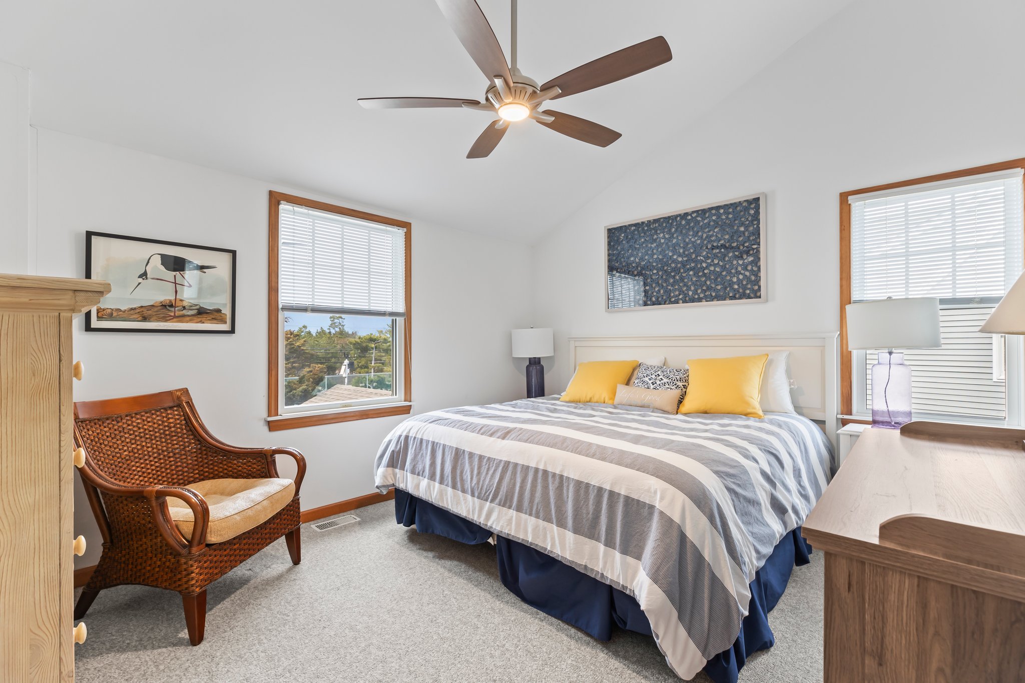 The “Courtyard Cottage” is a beautifully maintained Nantucket style beach house with 5-bedrooms and 3-full baths, tucked away on a private cul-de-sac on the oceanside, with a walkway that provides easy access to the beach. The interior of this home boasts an open floor plan, 2-bedrooms on the first floor. 3-bedrooms on the 2nd floor, including a spacious ensuite that has a sitting area and private deck overlooking the tennis courts. This beach house has a beautiful wrap around porch with upscale comfortable seating to relax and enjoy your vacation. There is an outside shower and hot tub. Also, there is a detached garage for your bikes and beach toys. Outdoor seating with gas grill. If you enjoy tennis, the property backs up to the tennis courts which are available to the cottage owners and their guests. There is off-street parking for 5-cars, the condo association does not permit parking on the street. Hideaway nature trail is across the street. Sorry, no pets allowed.