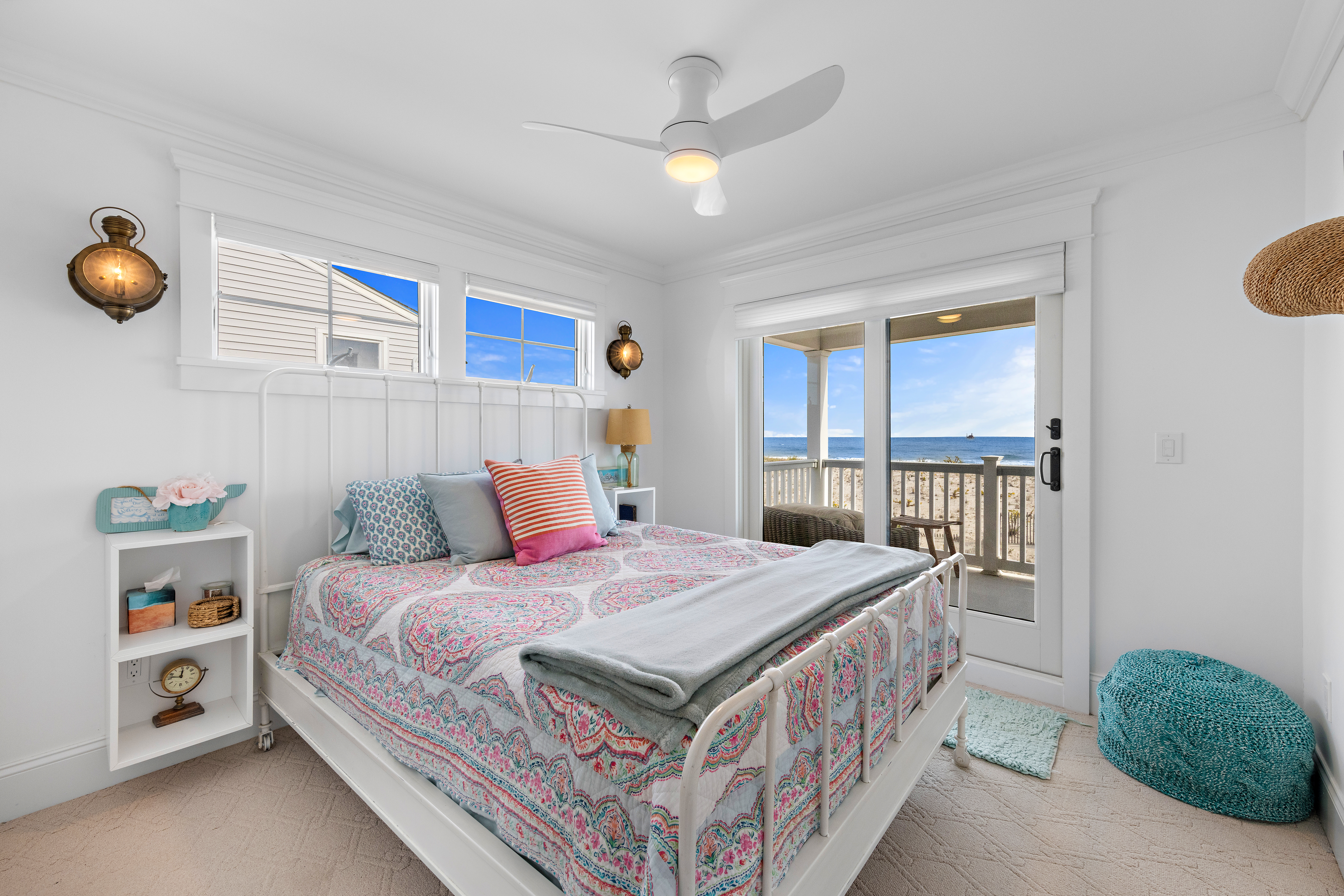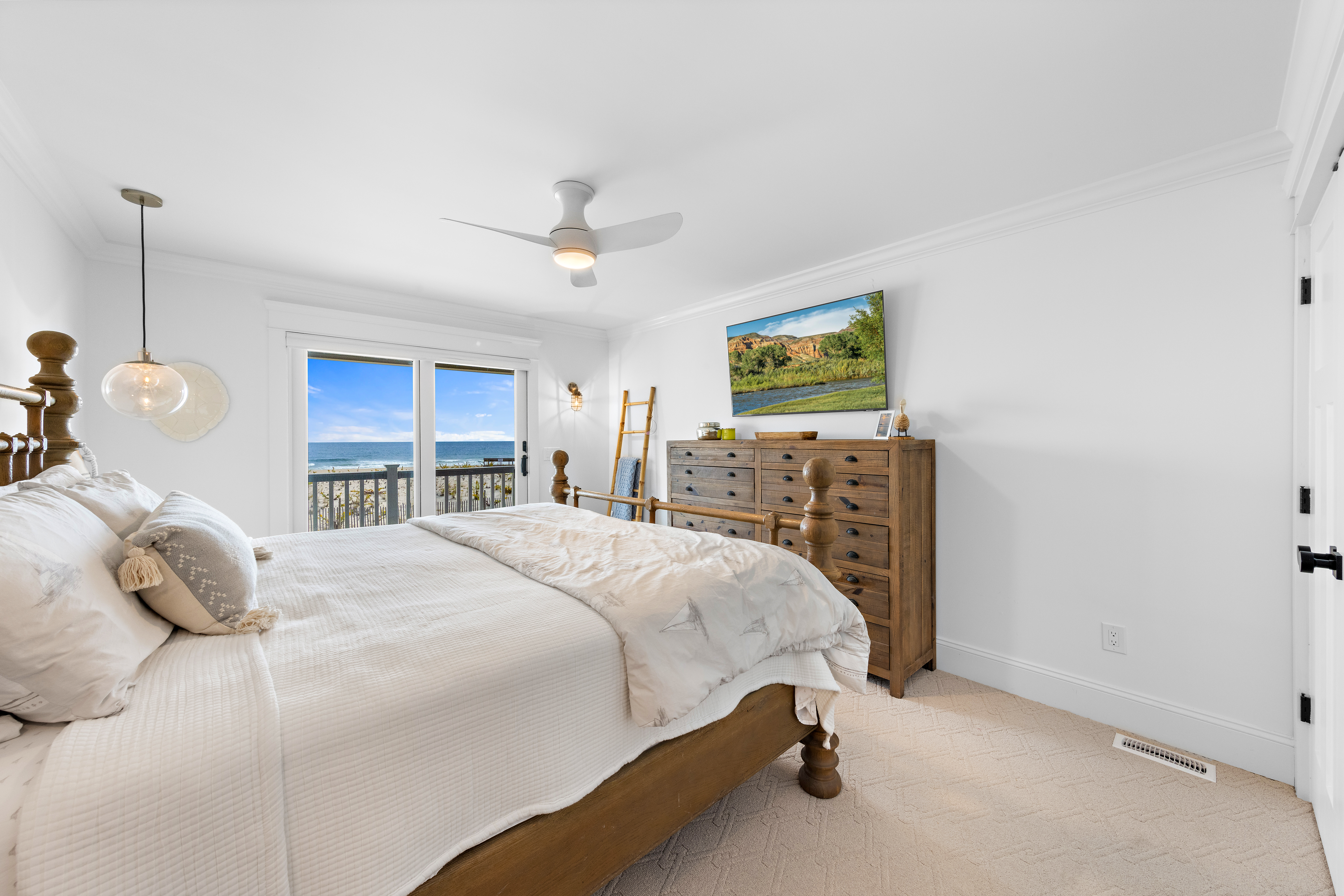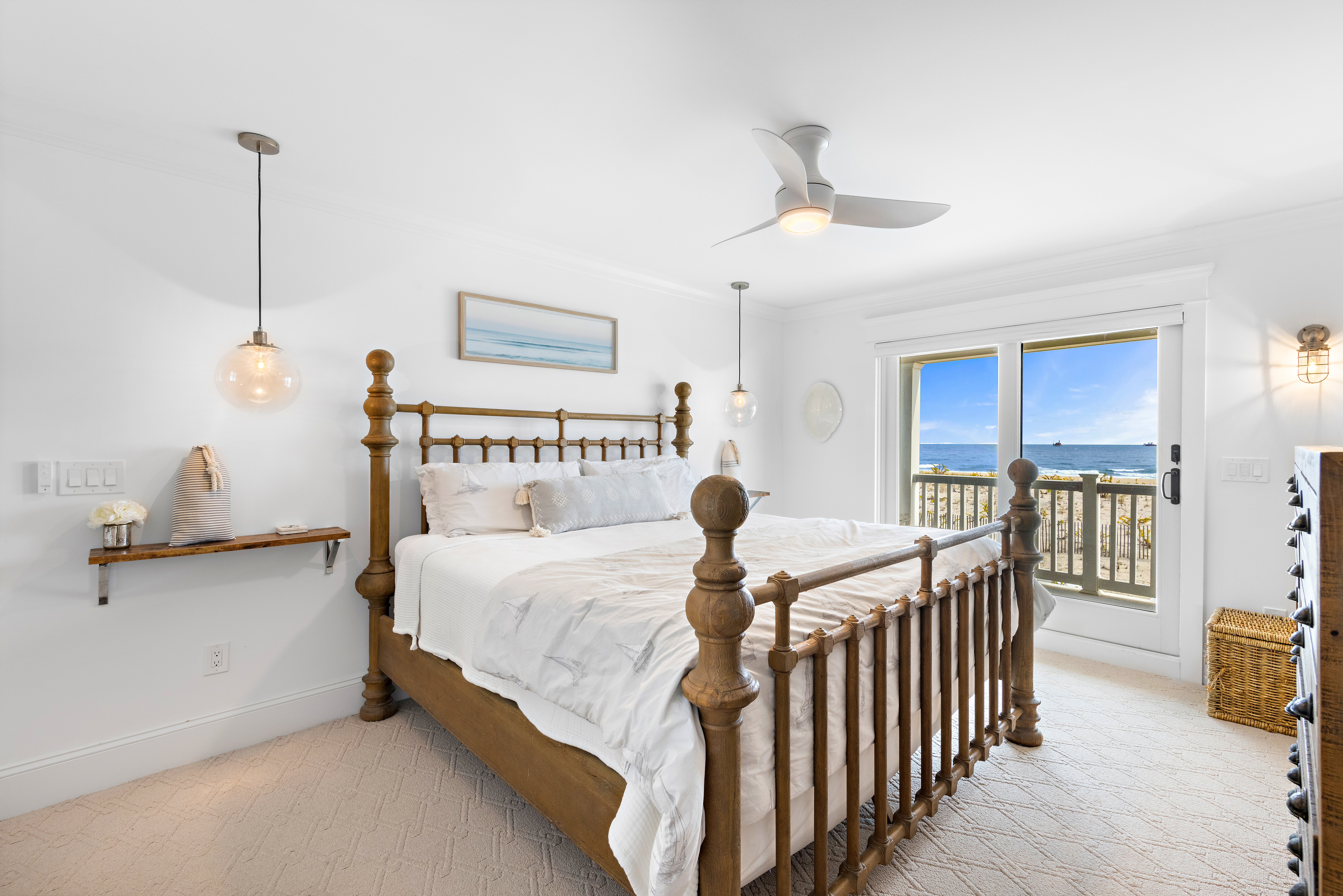 The second floor continues to two additional bedrooms, each with oceanfront deck access, a west facing bedroom with spectacular bay views, and a nautically inspired full bath complete with a reclaimed wood vanity and doorless walk-in shower.