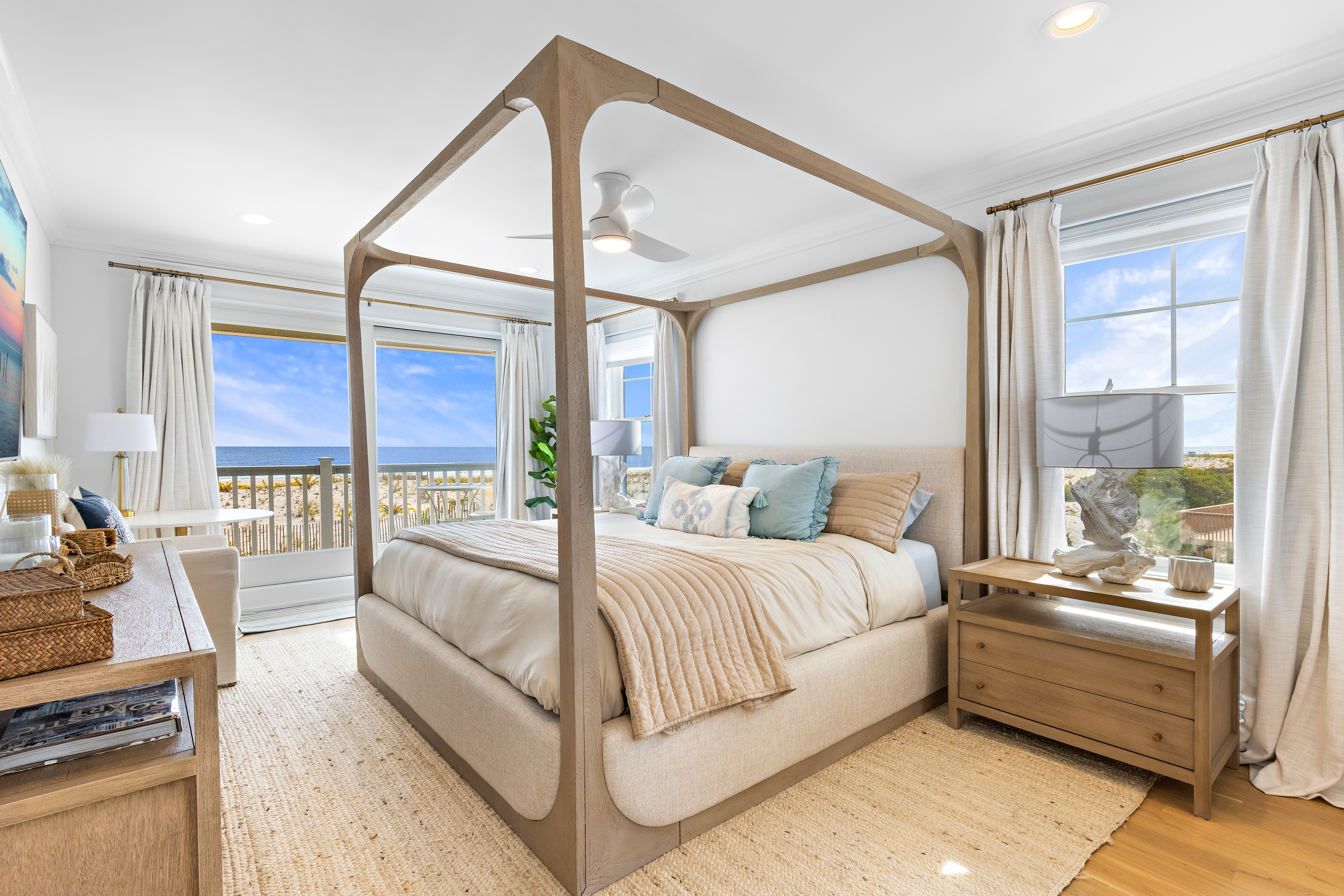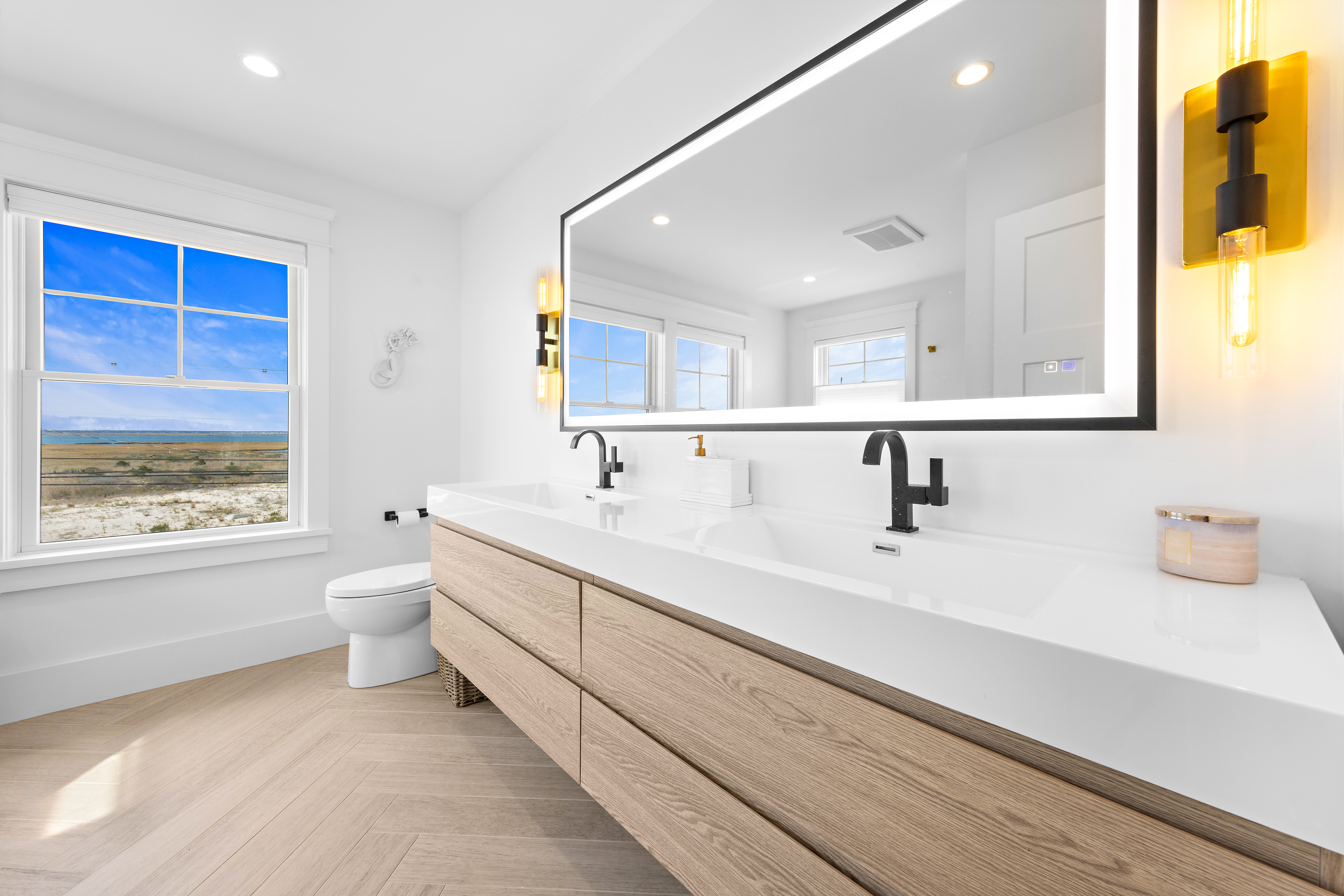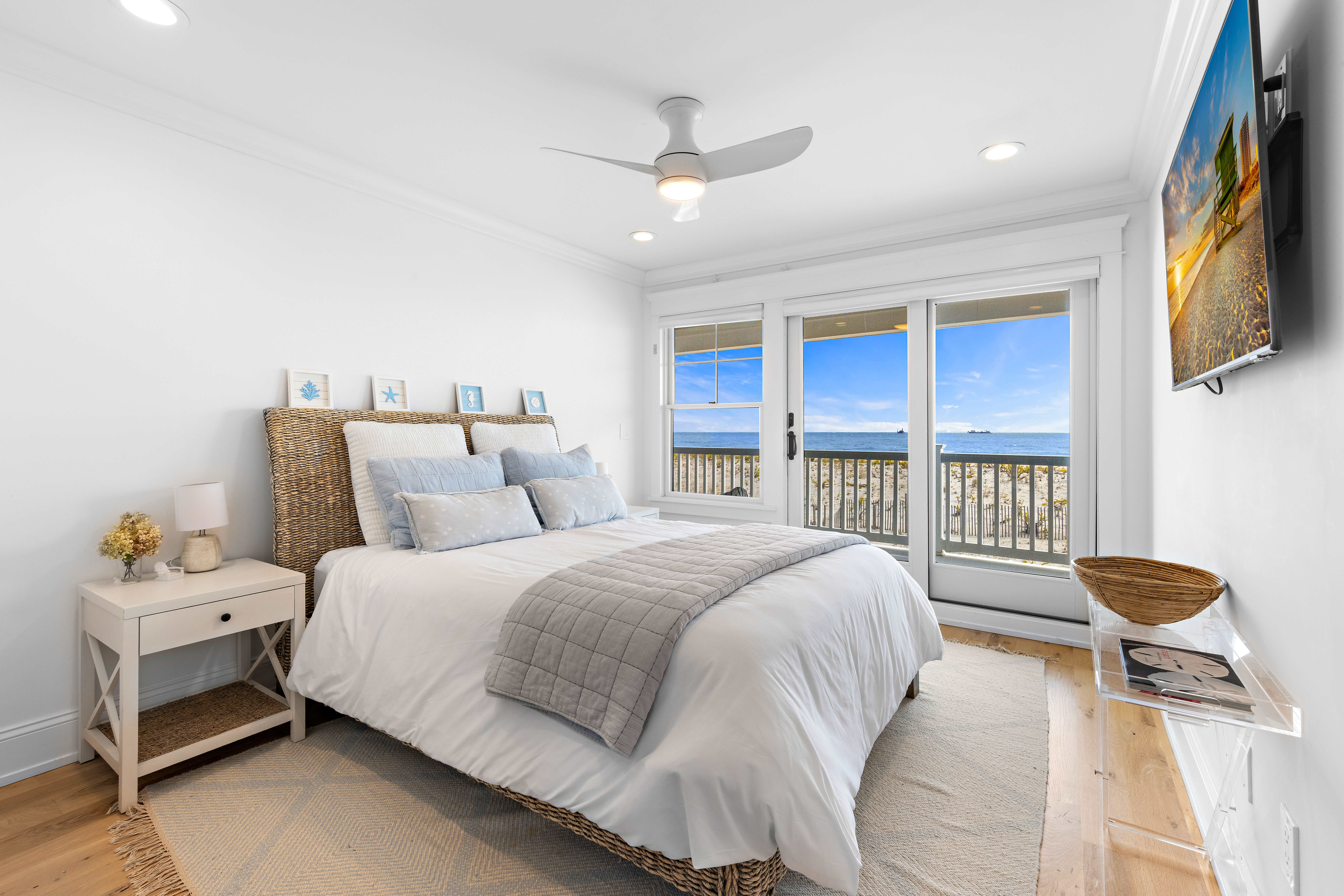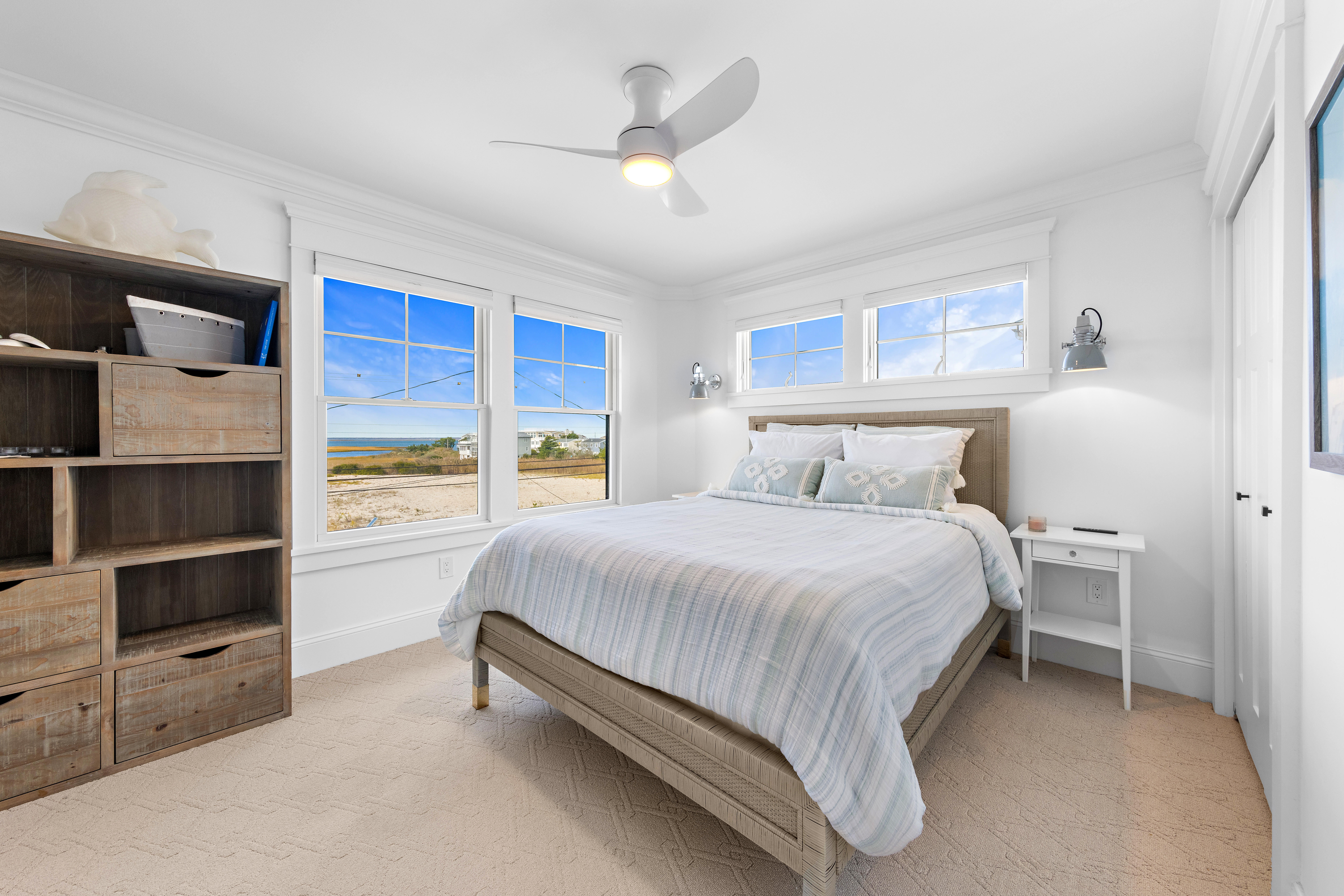 The second floor continues to two additional bedrooms, each with oceanfront deck access, a west facing bedroom with spectacular bay views, and a nautically inspired full bath complete with a reclaimed wood vanity and doorless walk-in shower.