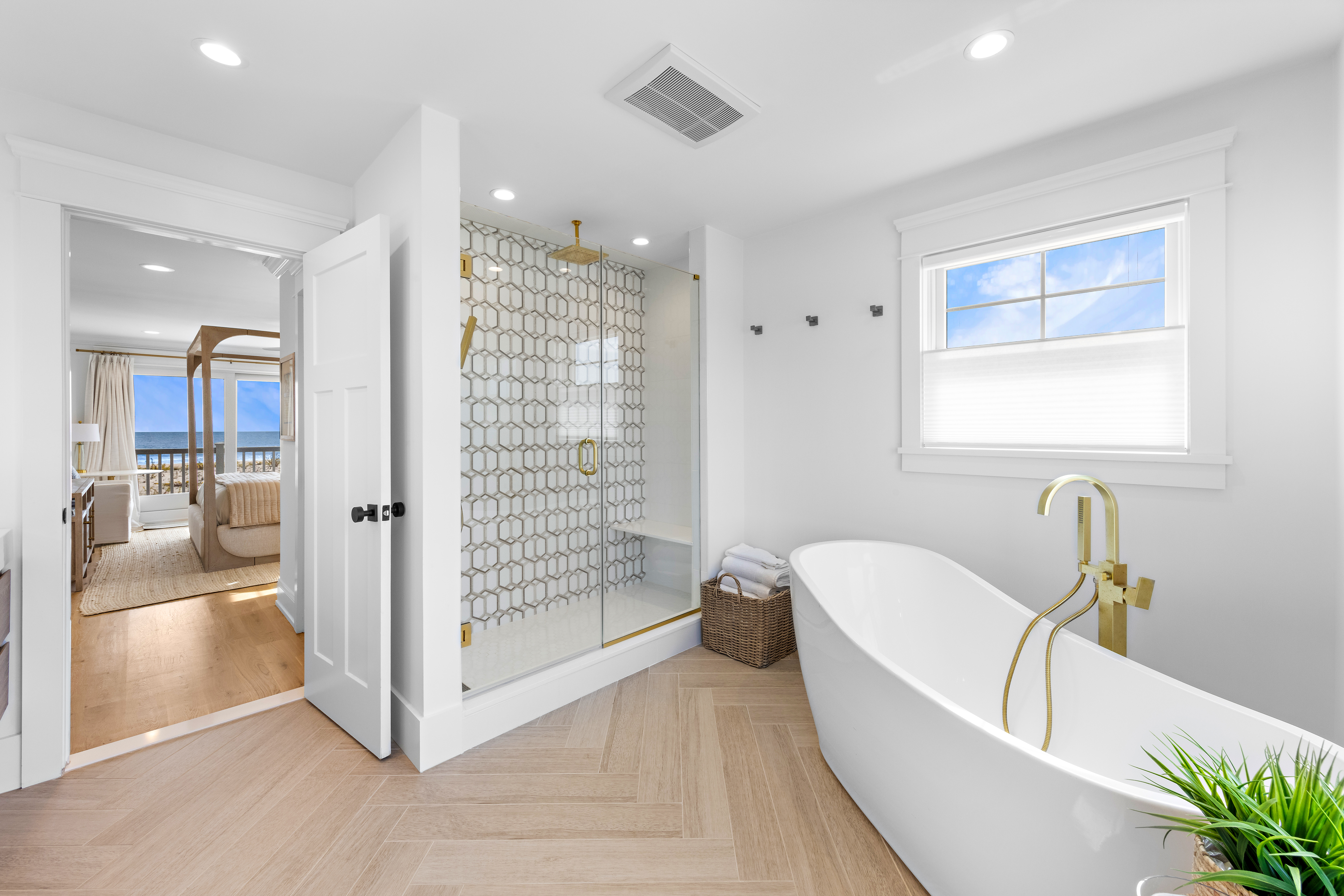 From there you can hop on the elevator or follow the shiplap stairs down a level to the second floor, that offers 4 additional bedrooms all with water views! Stretching across the entire southern elevation, the master suite opens to a waterfront deck capturing panoramic views of the Atlantic. This luxurious sanctuary offers maximum privacy, a flat screen tv and 2 walk-in closets that lead to the master bath. The resplendent bath features double vanities over custom cabinetry, designer lighting, a free-standing soaking tub (to bay views), and a multi-spray doorless shower framed with complementary textured tiling. When it comes to luxury, few styles proclaim it more boldly than doorless showers to instill the elegance of this island inspired design.