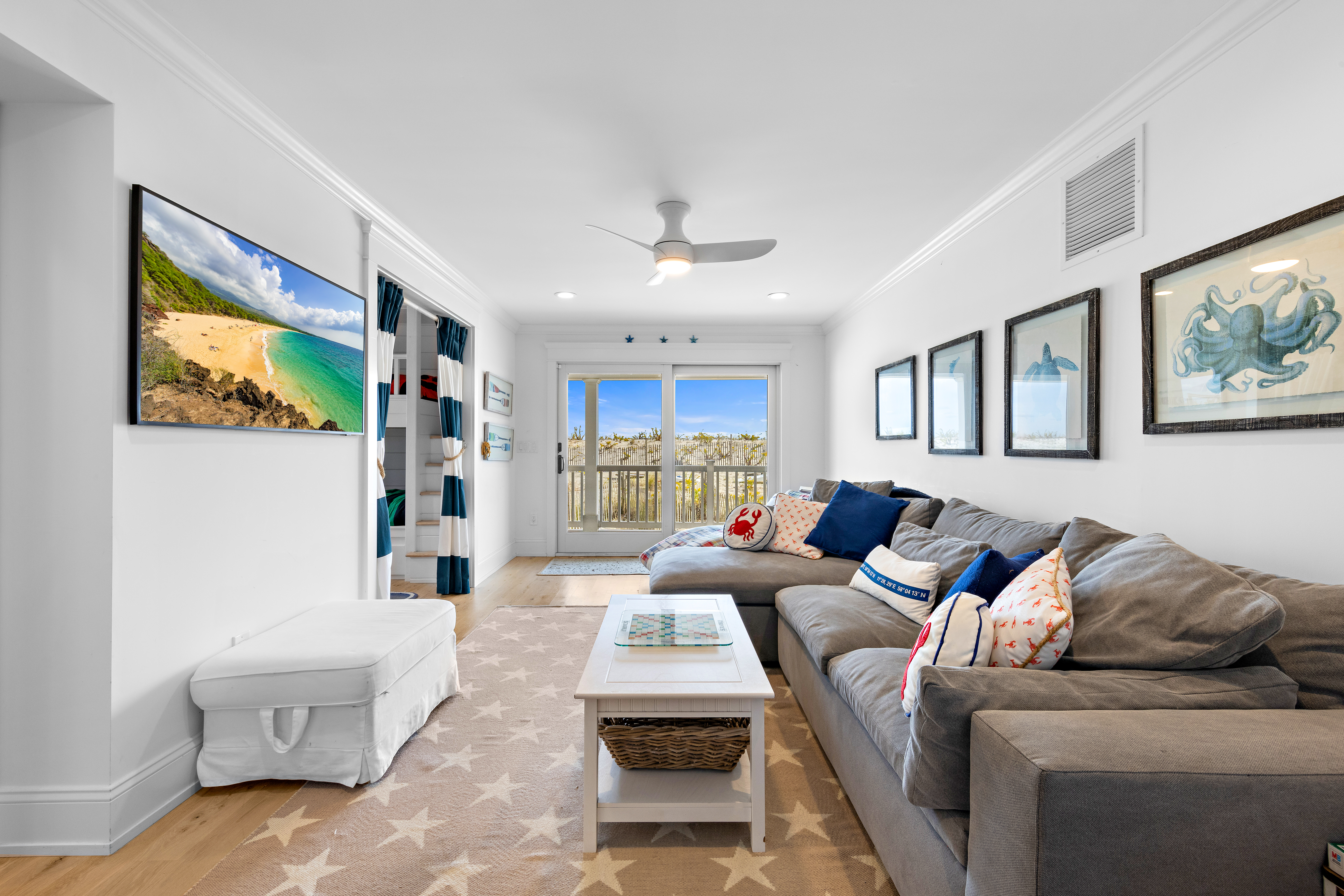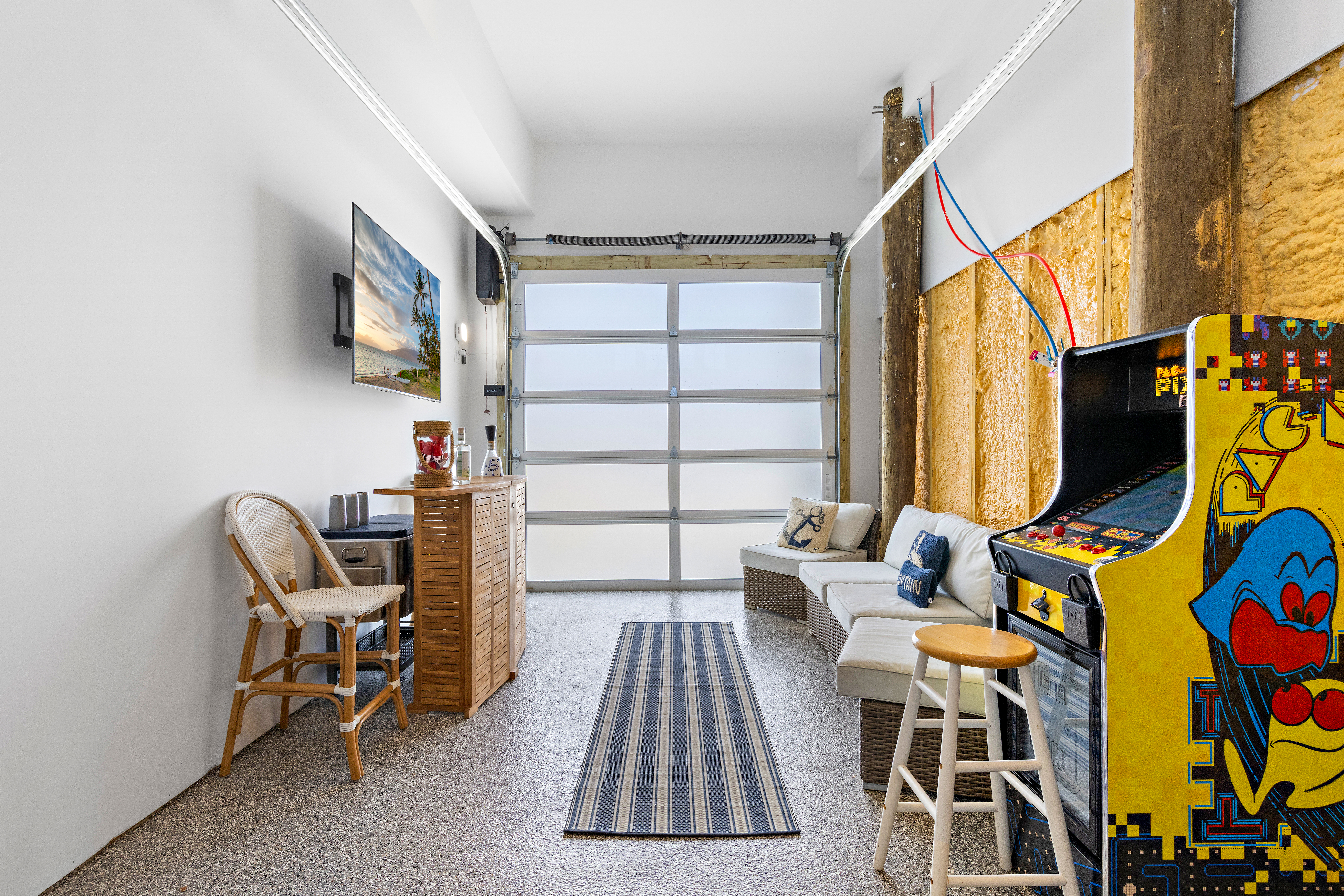 Next, follow the oak wide plank flooring and ascend to the entry floor where a family room with oceanfront deck-access awaits. Behind privacy curtains is the most charming space of all, with built-in bunk beds, each with their own private built-in shelving and nautical lighting. The adjoining full bath is adorned with more island inspired finishes and a bath tub with tile surround. This floor has a brand new sleeper sofa as well as Pac Man video game.