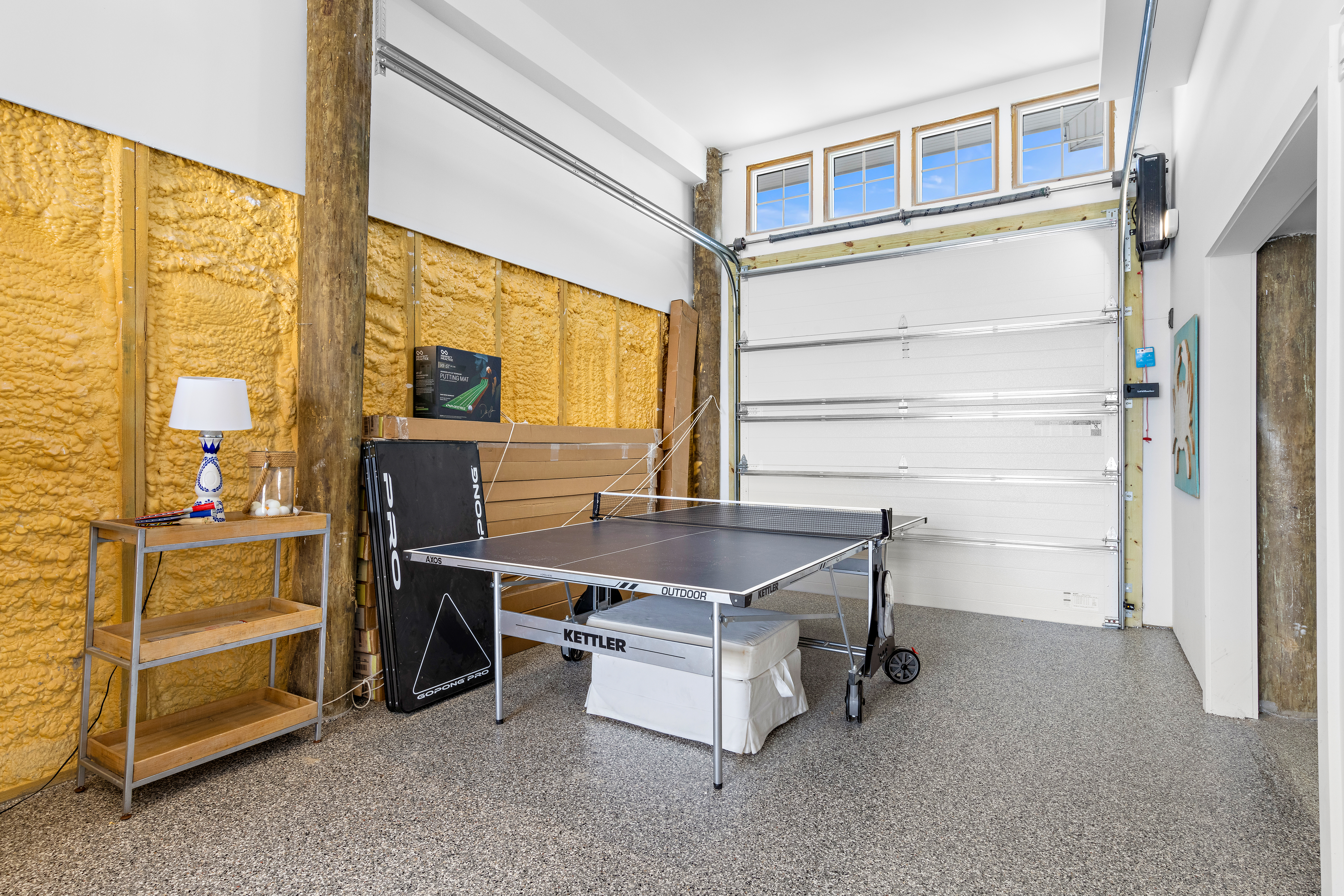 The open floor-plan is highlighted by: expansive windows that dramatically line the walls, a floor to ceiling stone fireplace, extensive shiplap that adorns the walls and beamed ceilings, RH lighting and custom cabinetry.