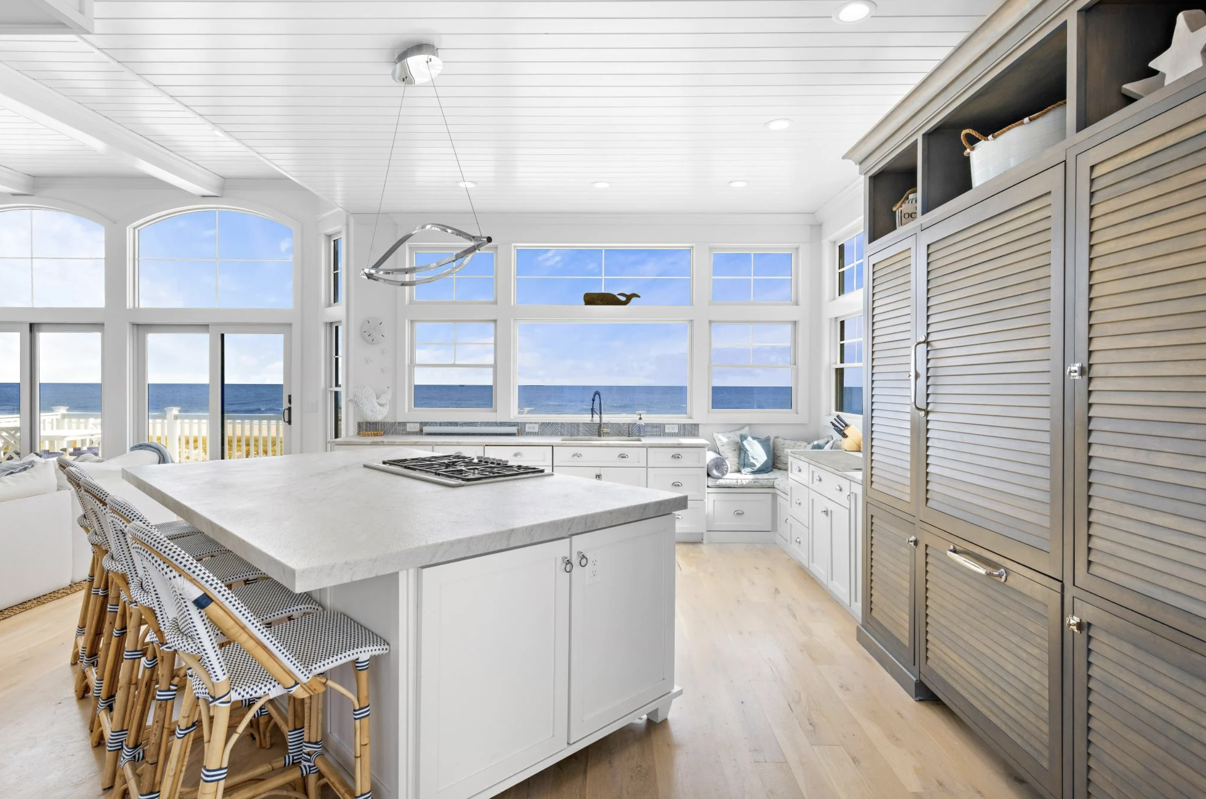 The alluring aspect of this design is its focus on the shoreline and continues from the LR to the kitchen - that brilliantly encompasses the SE elevation, continuing a sensational flow for entertaining. The fully equipped kitchen offers white shaker style cabinets with marble counters, a stunning island accented with honed marble counters and seating, Thermador stainless appliances, built-in window seating, plus a cutting-edge custom designed shutter refrigerator and pantry cabinet.