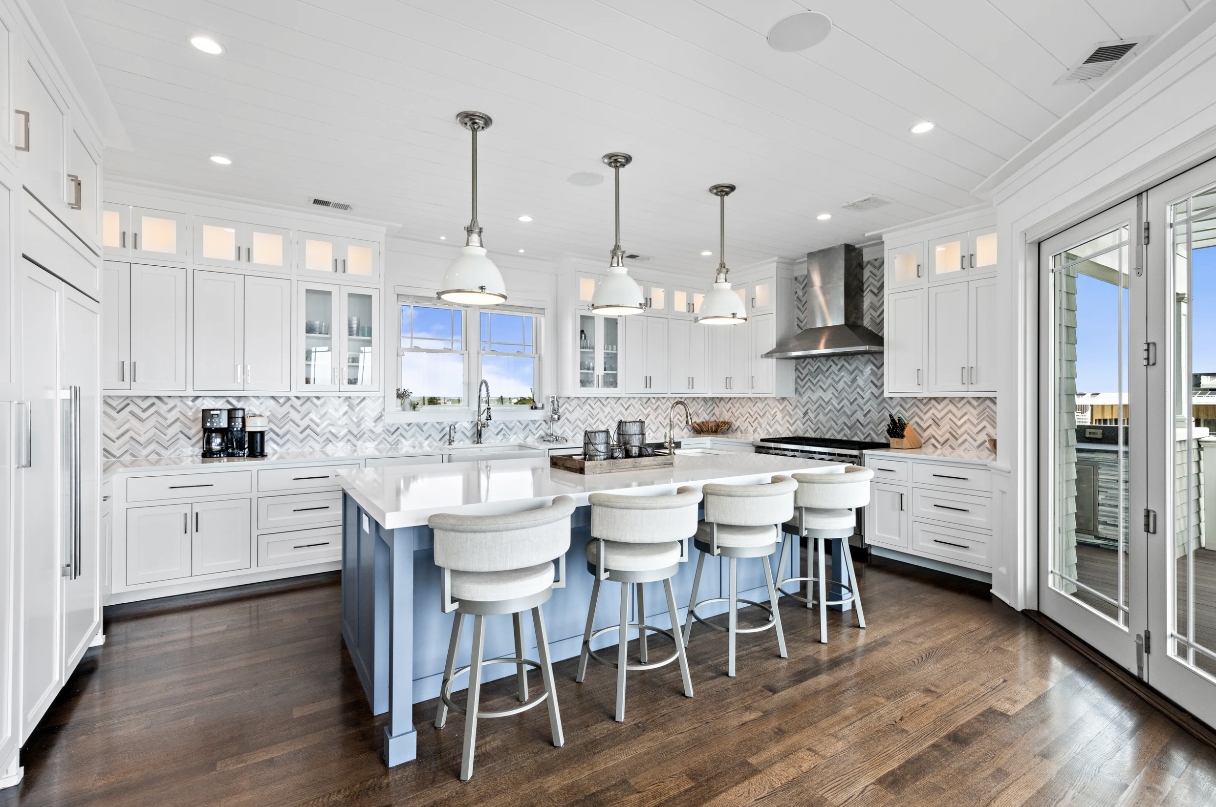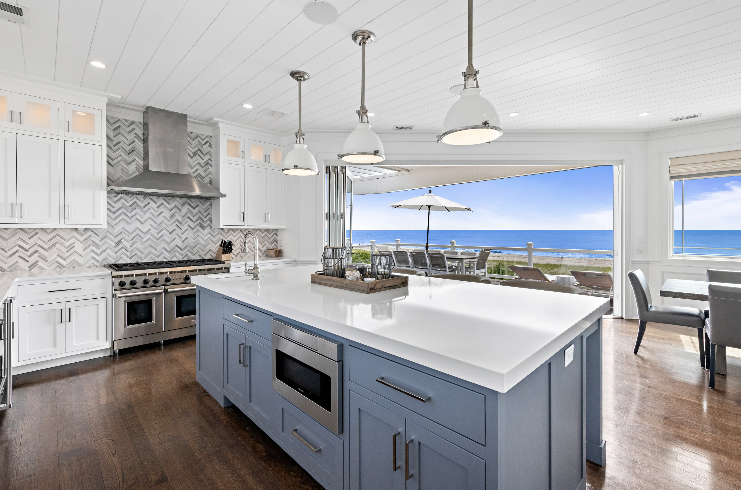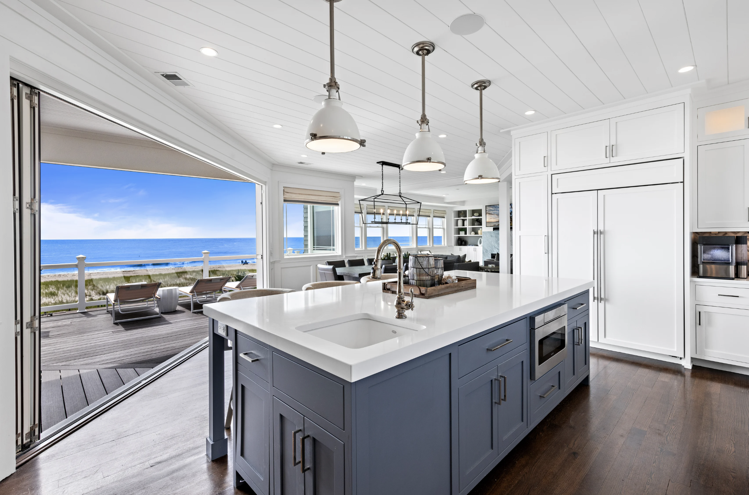 Expansive windows on the top floor invite the majestic ocean views indoors, creating a seamless flow between the natural surroundings and the home’s impeccable design. The gourmet kitchen, a symphony of elegance and function, boasts bespoke cabinetry, high-end appliances, and a sleek, quartz-clad island, all thoughtfully positioned to lead effortlessly to retractable glass doors. Here, indoor and outdoor living blur, opening to an expansive deck and entertainment area, where the sound of the waves sets the tone for unforgettable gatherings.