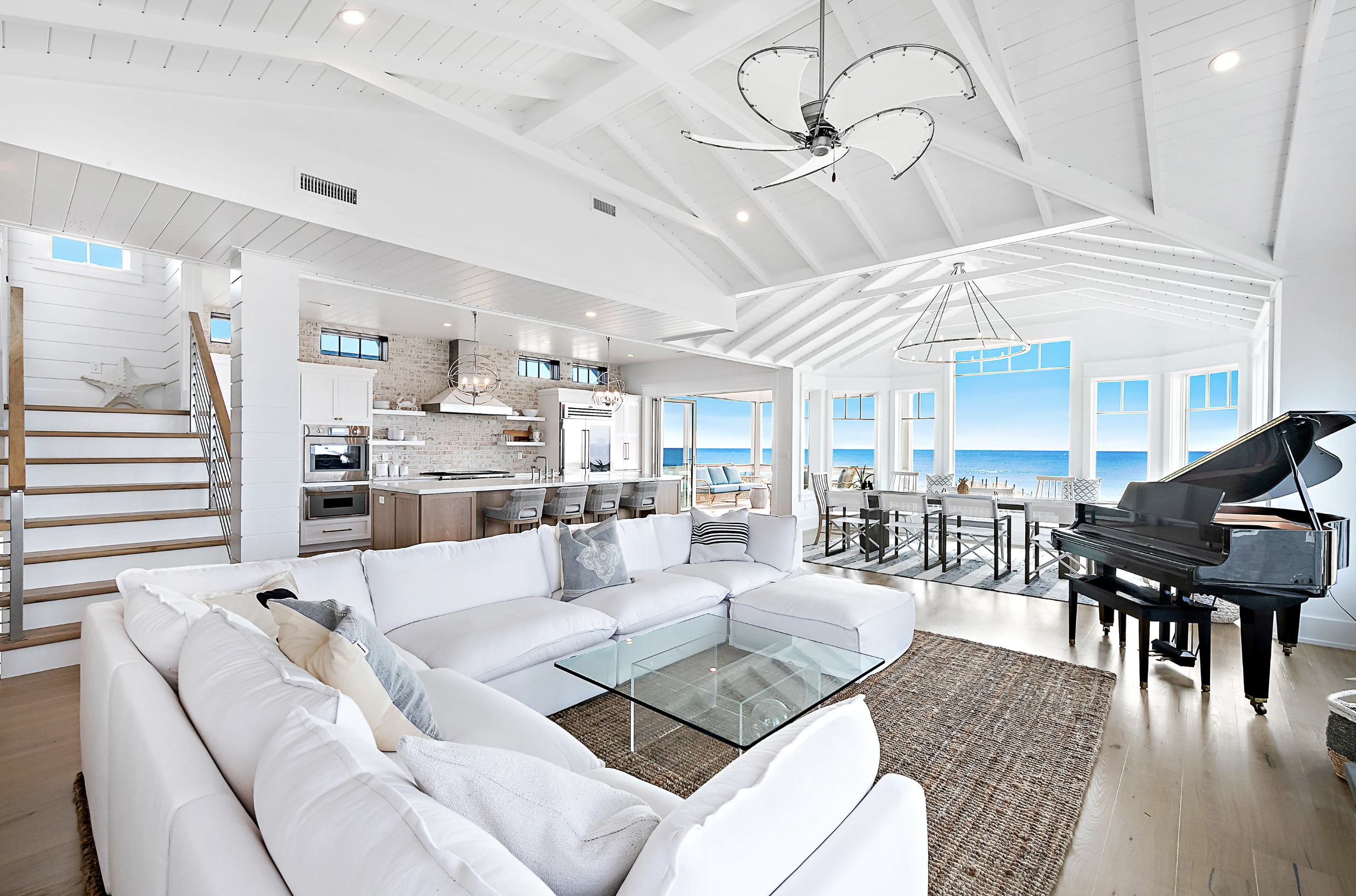 The top floor confirms that effortless entertaining is the focus of the airy loft-like living area, dramatized by vaulted beamed and paneled ceilings and sun-filled window walls, making an open connection to the waterfront views.
