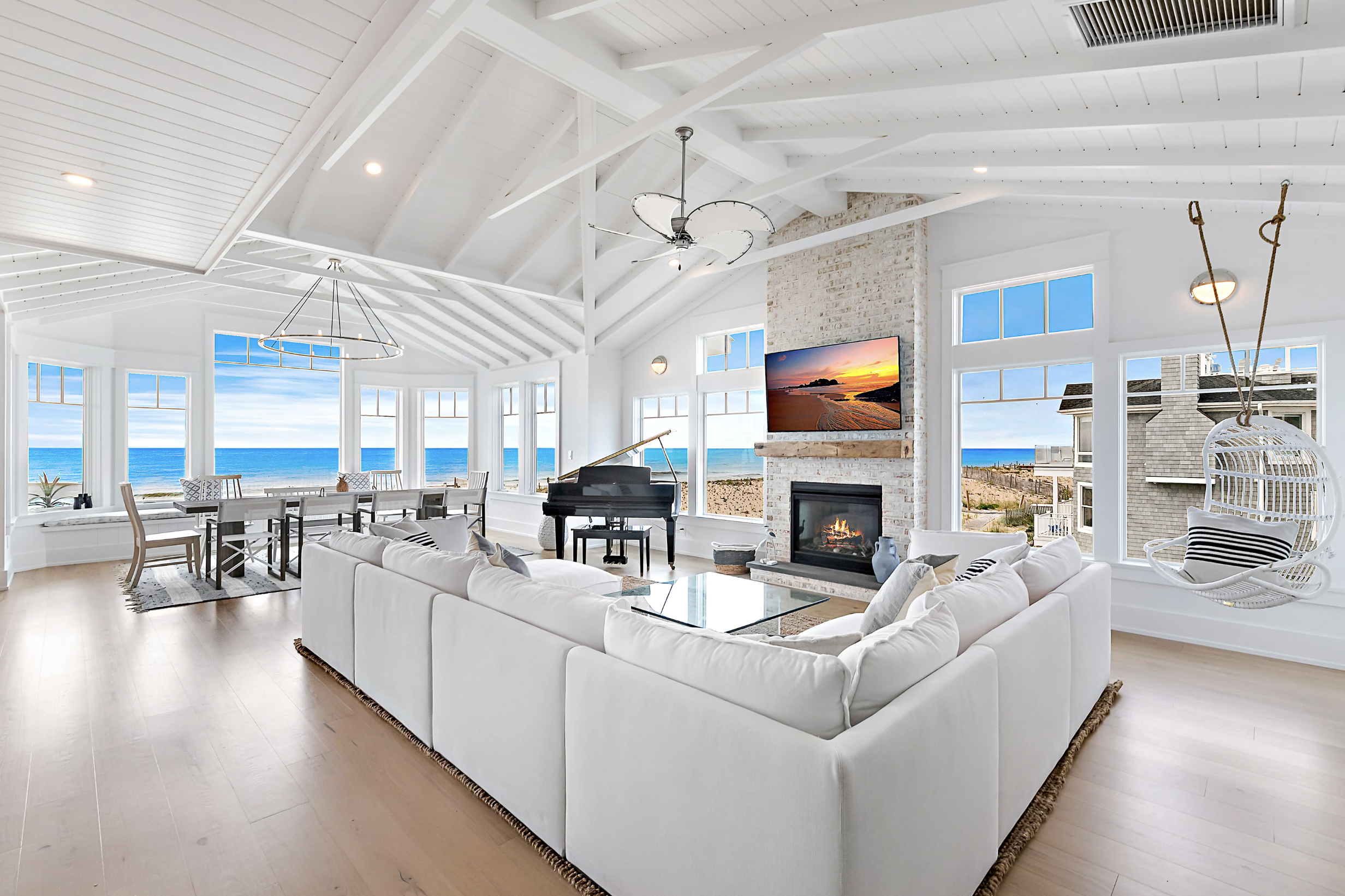 Enjoy your culinary creation in the dining area which is one of the finest spaces in the house, flanked by atlantic views and the spectacular Living area - with a floor-to-ceiling beachy brick fireplace and wet bar - complete with wine refrig and a carbonated water feature dispensed from a faucet.