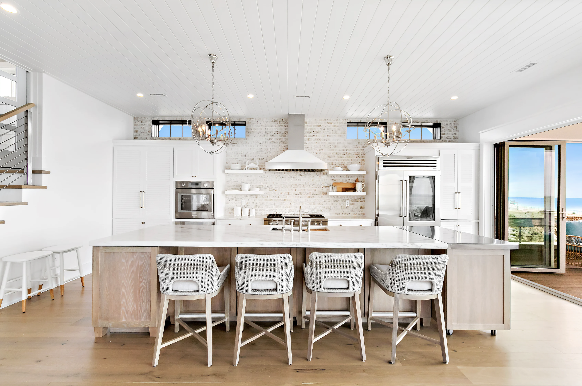 A spectacular kitchen worthy of a celebrity chef was custom designed with furniture-grade cabinetry under quartz counters, and a beachy brick backsplash that boasts floating shelves - making the kitchen feel more like a living space than a cooking space. The commercial grade appliances include a glass front SubZero with adjustable temp drawers, a Wolf gas range, Thermador double ovens, warming drawer, a double drawer Bosch dishwasher, pantry and appliance garage to house your coffee and blender. An added perk, the kitchen island has a break away bar on wheels with stainless top - to maximize your entertaining experience.
