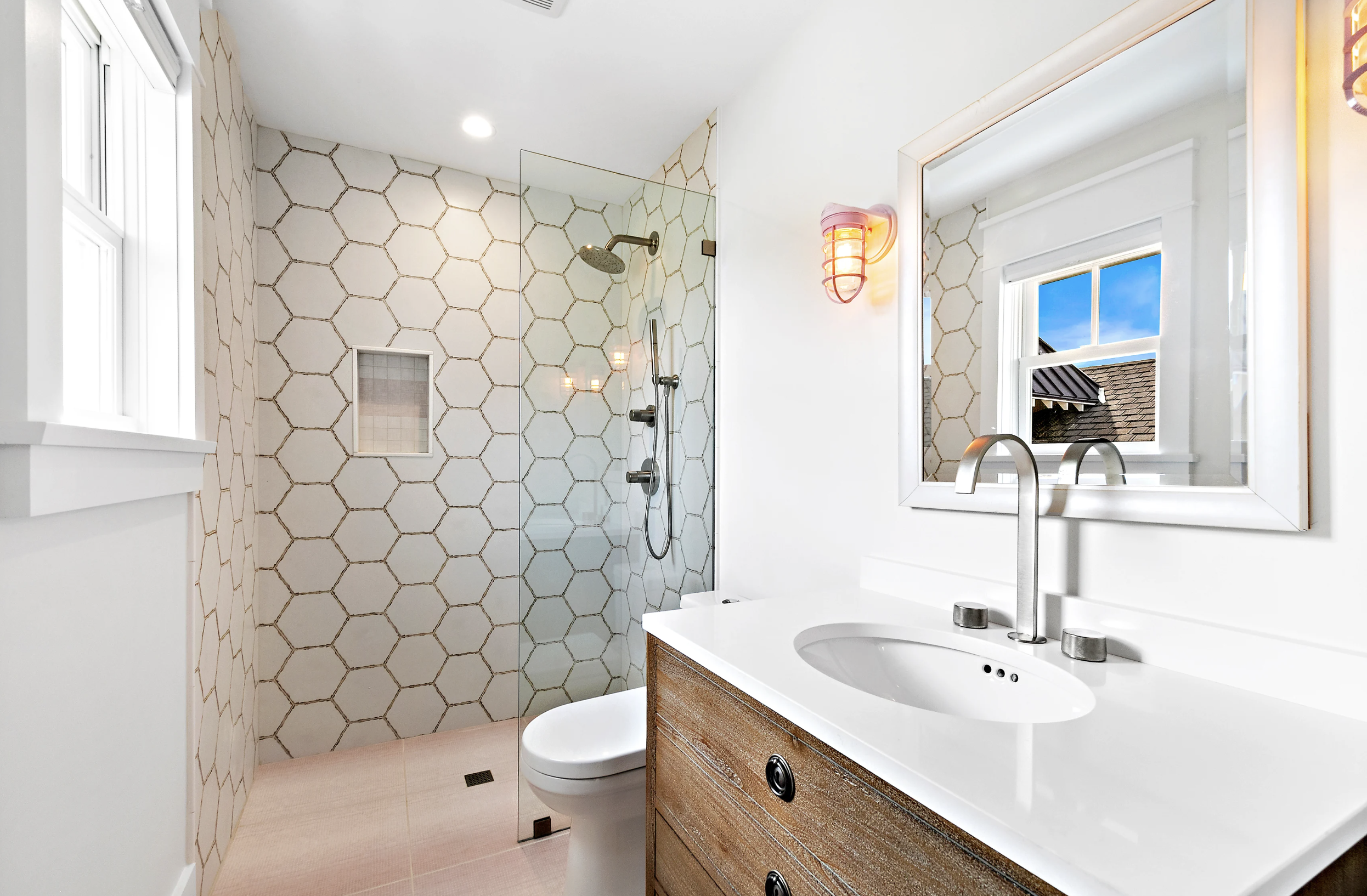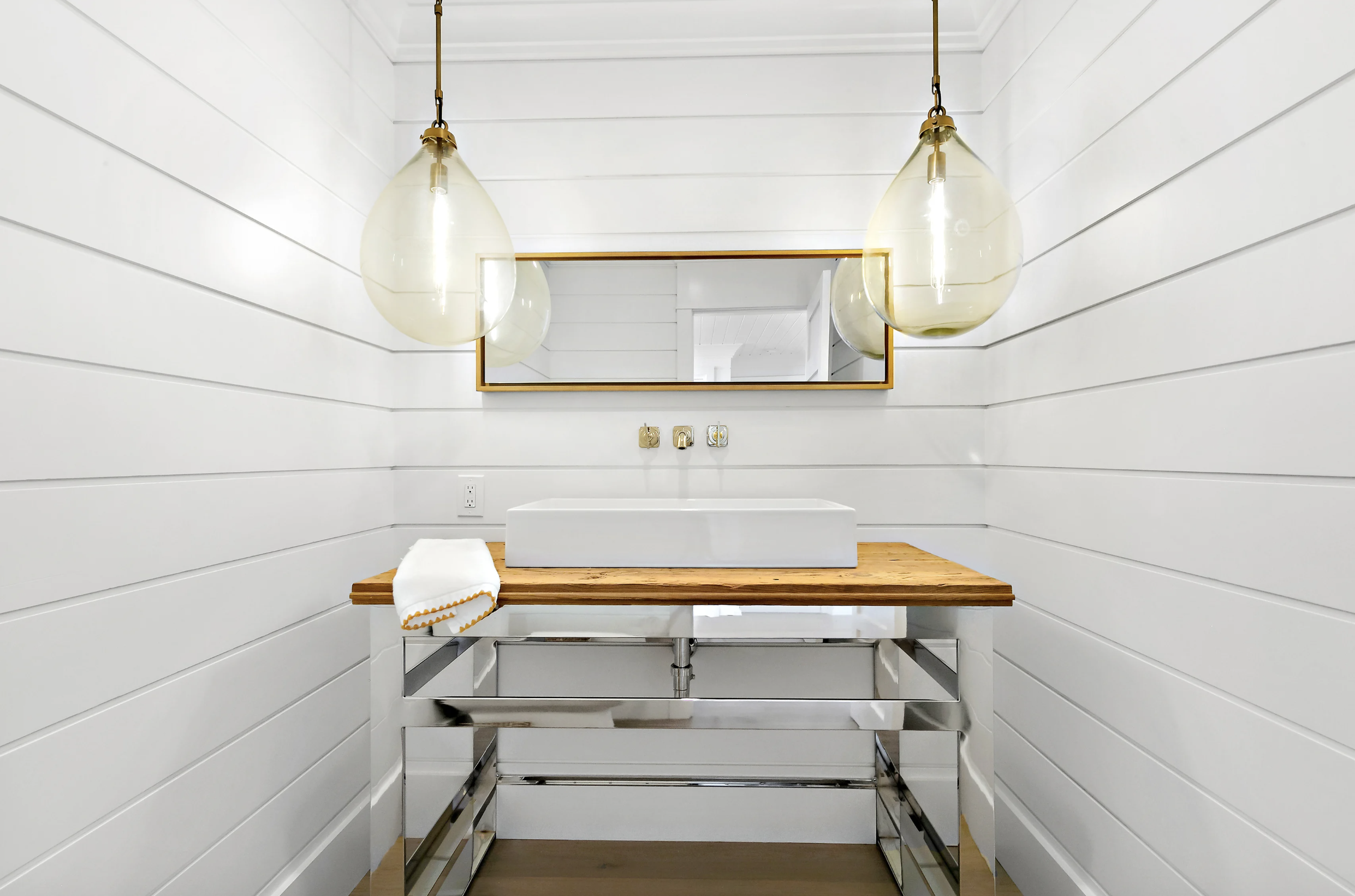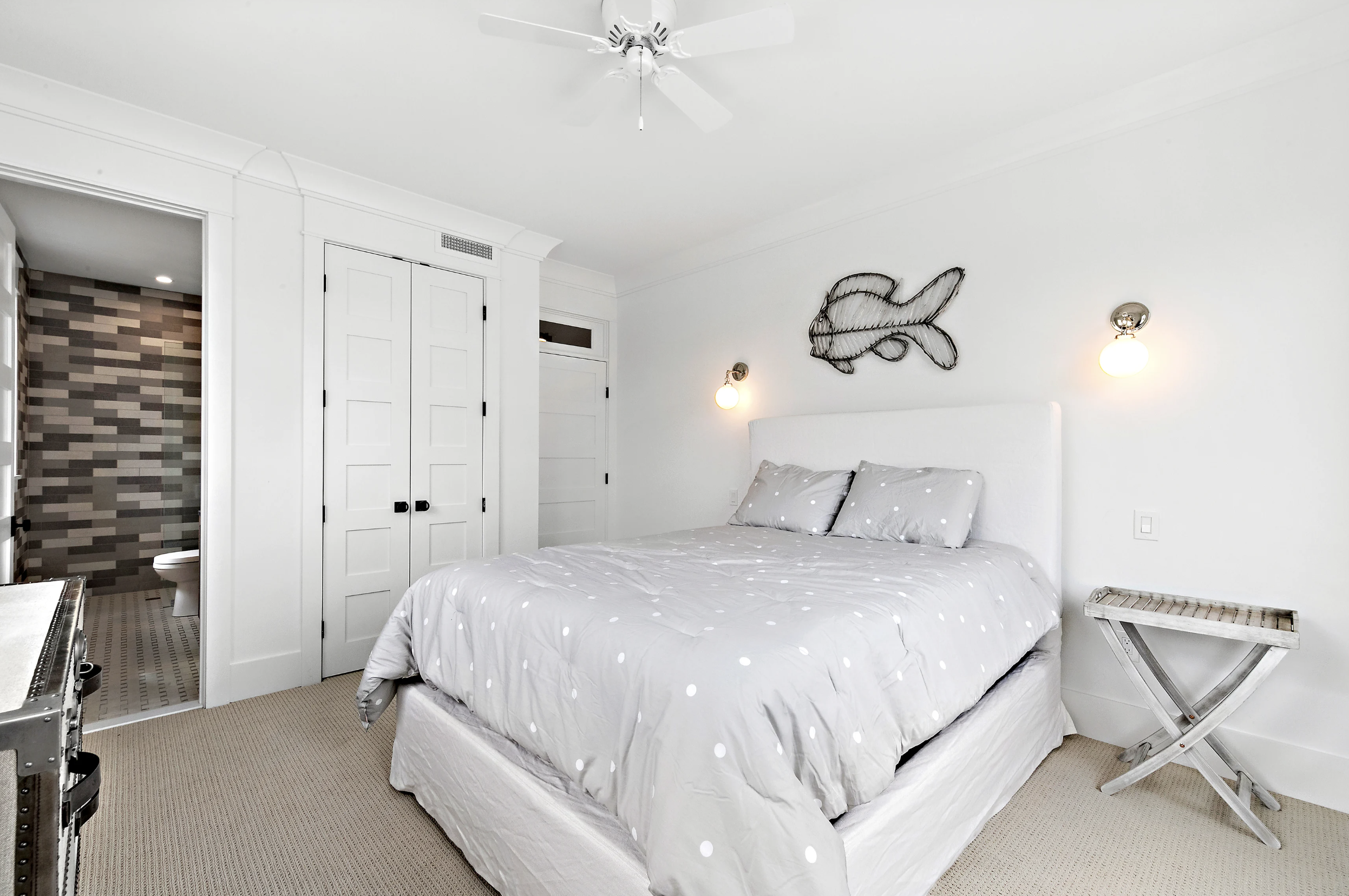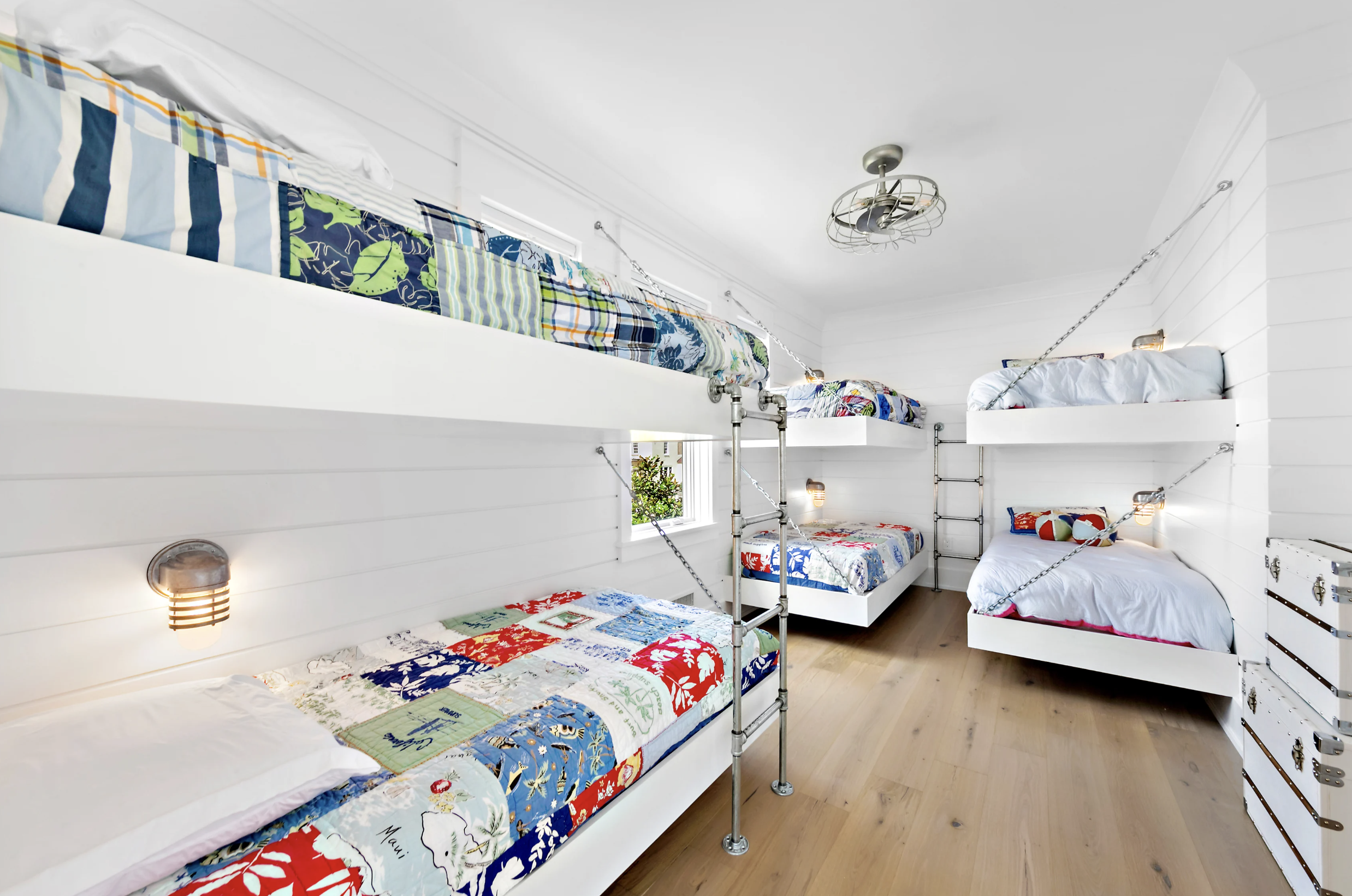 This modern style continues to the bunk room, housing 6 floating bunk beds, cleanly accented with chains, ship lap trim and a barn door. The hall bath complements the space and is conveniently right next door.