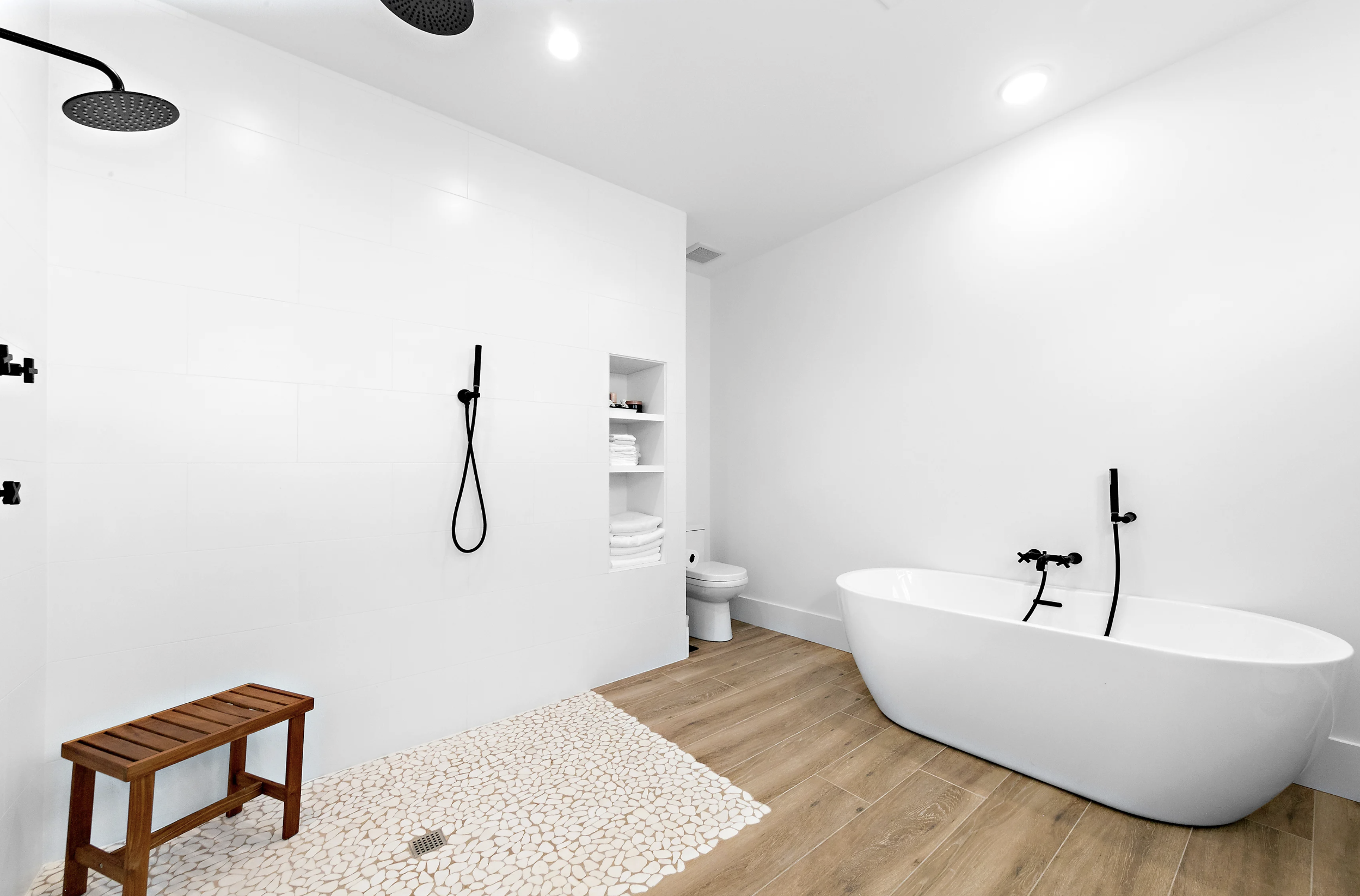 Continue to the NE elevation, which is dedicated to the master suite, offering floor-to-ceiling glass doors that open to a private deck, a walk-in closet, and bathroom like no other. The spa-inspired master bath features floating vanities with lighted mirrors, a soaking tub and the show stopper is…a doorless shower, framed only with white pond stone and multiple spray heads and a rain head. When it comes to luxury, few styles proclaim it more boldly than the open floor plan doorless showers to instill the elegance of a modern design.