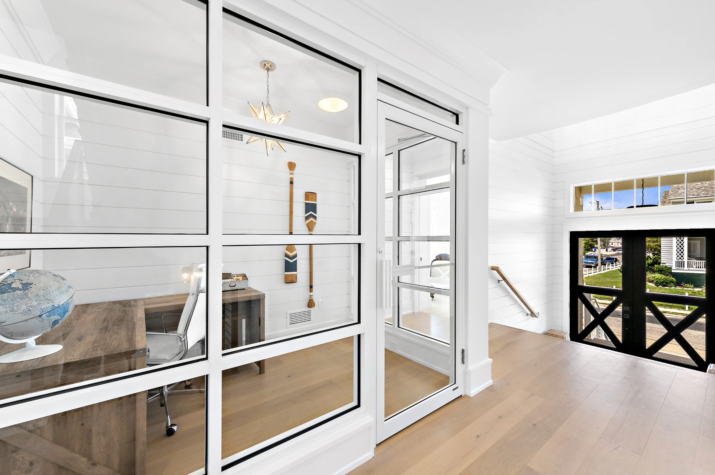 Double doors give way to the impressive open foyer where a glass enclosed elevator, stainless steel rod railing stair awaits but the real focus is on the ultimate office space. Glass walls accented with nautical white wood blocking define the office boundary, while opening the entrance in a massive way.